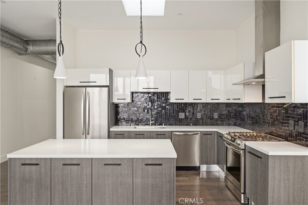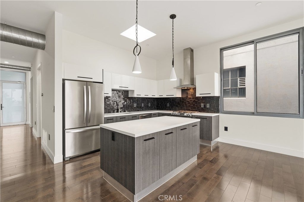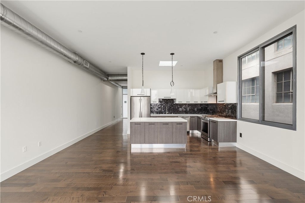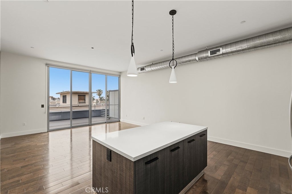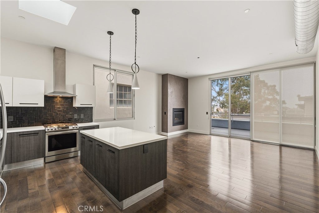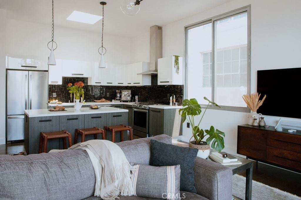 Welcome to the heart of downtown Long Beach—this penthouse condo has been thoughtfully elevated throughout. Enter through the skylit lounge into an open, airy layout with high ceilings, dark laminate wood floors, and floor-to-ceiling sliders that fill the living space with natural light. The open-concept kitchen blends warm and industrial design with black variegated tile, under-cabinet lighting, quartz countertops, and stainless steel appliances. The living room centers around a plastered fireplace with concrete feel, and opens to a spacious corner patio with vibrant city views that stretch all the way to the Palos Verdes Peninsula. Inside, you’ll find a spacious bedroom, with separate walk-in closet, in-unit laundry, and a full bathroom featuring a modern concrete vanity. Two dedicated parking spots in the subterranean, fully-secured parking garage add convenience. This home is walking distance to coffee shops, dining, shopping, entertainment, the Metro line, and a short drive to the beach and freeways. It's time to experience life at Newberry Lofts on Pine Ave!