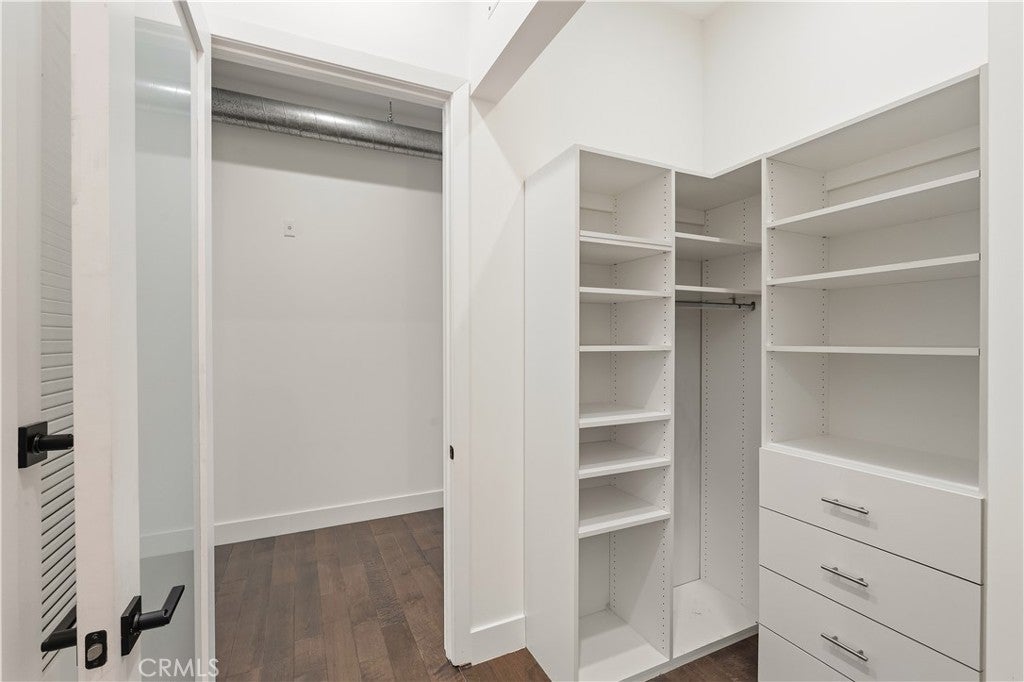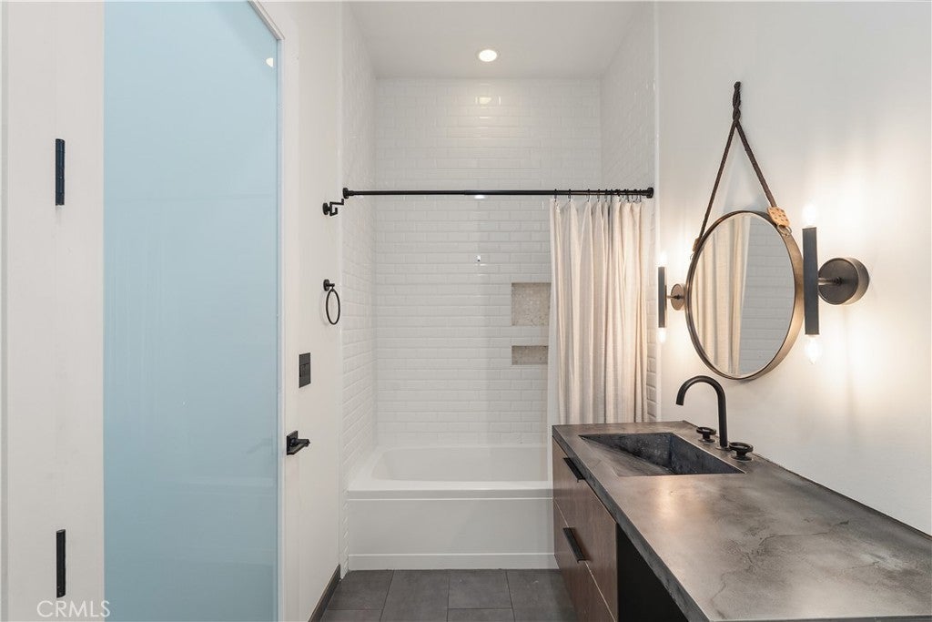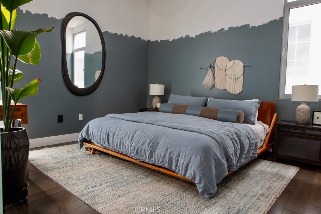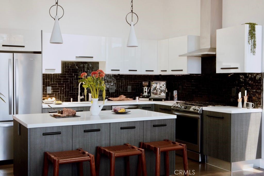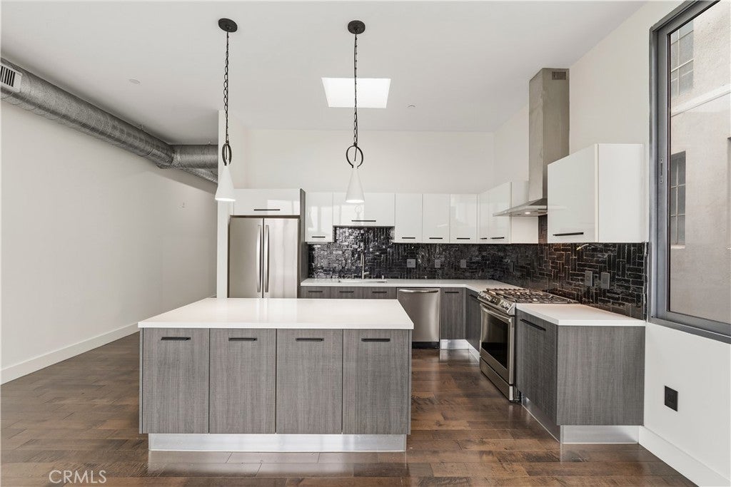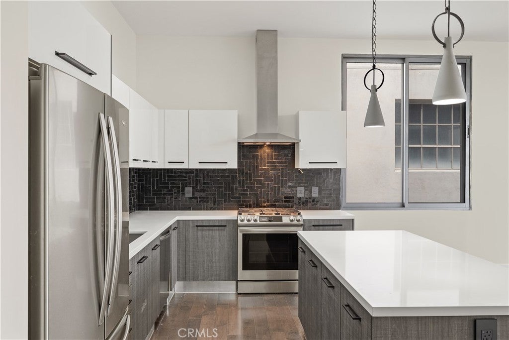 Welcome to the heart of downtown Long Beach—this penthouse condo has been thoughtfully elevated throughout. Enter through the skylit lounge into an open, airy layout with high ceilings, dark laminate wood floors, and floor-to-ceiling sliders that fill the living space with natural light. The open-concept kitchen blends warm and industrial design with black variegated tile, under-cabinet lighting, quartz countertops, and stainless steel appliances. The living room centers around a plastered fireplace with concrete feel, and opens to a spacious corner patio with vibrant city views that stretch all the way to the Palos Verdes Peninsula. Inside, you’ll find a spacious bedroom, with separate walk-in closet, in-unit laundry, and a full bathroom featuring a modern concrete vanity. Two dedicated parking spots in the subterranean, fully-secured parking garage add convenience. This home is walking distance to coffee shops, dining, shopping, entertainment, the Metro line, and a short drive to the beach and freeways. It's time to experience life at Newberry Lofts on Pine Ave!