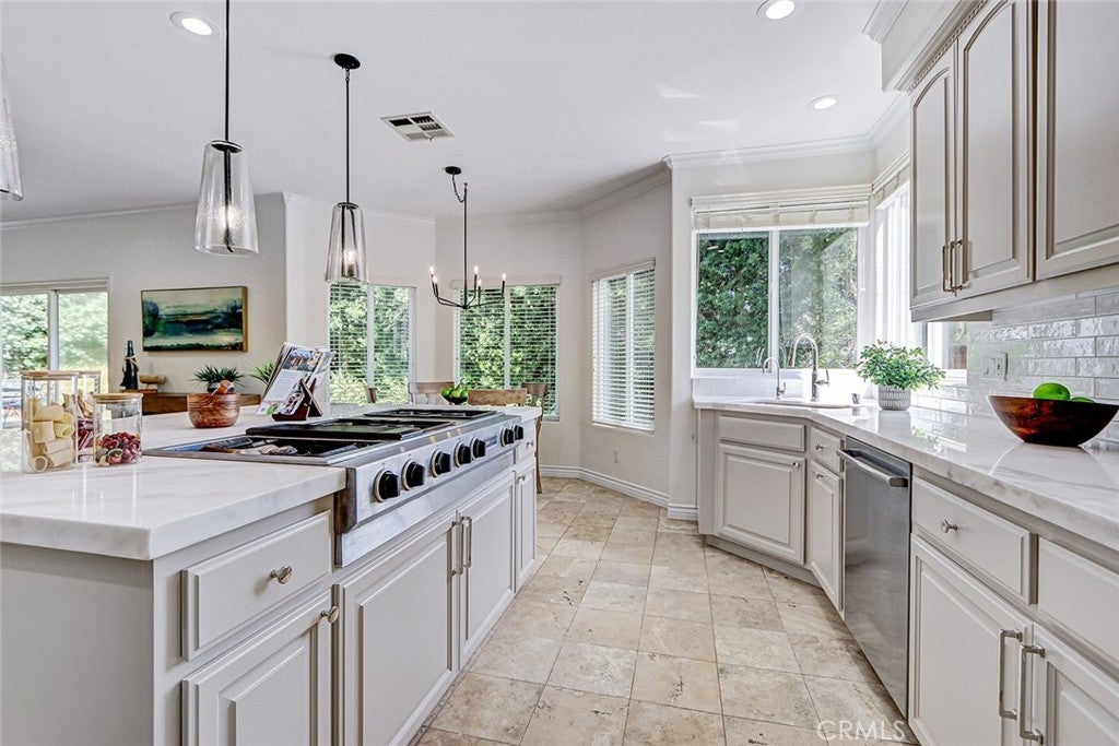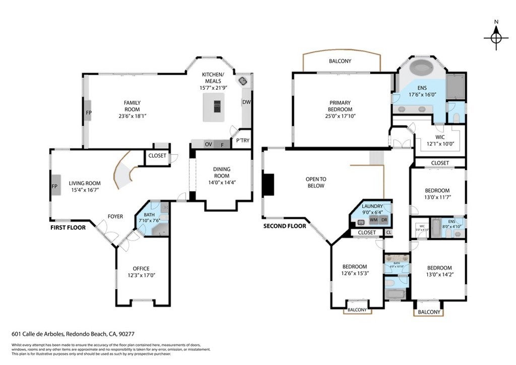 This beautiful and spacious upper Riviera home is on a prime corner lot and offers exceptional elegance, and a coveted coastal lifestyle. This one-of-a kind Mediterranean/Spanish residence was built in 1999 from the ground up and is thoughtfully designed for both everyday living and refined entertaining. A grand foyer welcomes you in and sets the tone with soaring ceilings and an abundance of natural light. The formal living room with fireplace provides a warm and inviting space, while the expansive great room—also with a fireplace—flows seamlessly into the heart of the home. A dedicated dining room offers the perfect setting for gatherings both intimate and large. The newly remodeled kitchen is beautifully appointed with a Sub-Zero refrigerator, a generous center island with seating, and a bright breakfast area overlooking the private backyard—ideal for indoor-outdoor living. Upstairs, the huge primary suite serves as a true retreat, featuring its own fireplace, a private balcony overlooking the yard, an oversized walk-in closet, a luxurious two-person shower, and a spa-like soaking tub. Three additional upstairs bedrooms include one with an en-suite bath, while the other two share a Jack-and-Jill bathroom and each enjoy their own private balconies. A fifth bedroom on the main level is currently configured as a custom office with built-in cabinetry and desks. Additional highlights include hardwood flooring throughout most of the home, central air conditioning, and a functional, flexible floor plan. The lush and private backyard offers both grassy and tiled areas, perfect for al fresco dining, entertaining, play, and relaxation. Ideally located just moments from the beach, Riviera Village, the PV walking trail, Riviera Elementary, and Rocketship Park, this exceptional home combines space, style, and one of the South Bay’s most sought-after neighborhoods. Don't forget to click on the button for the 3D Matterport Tour.
