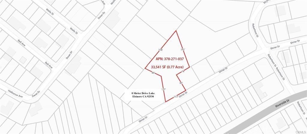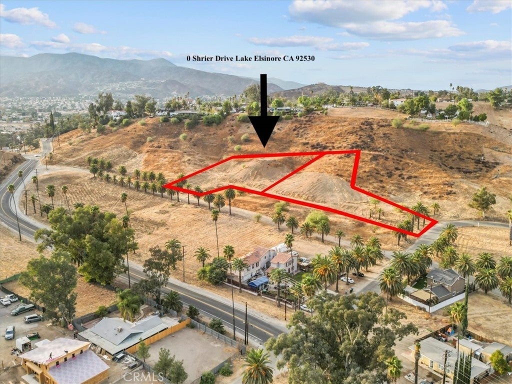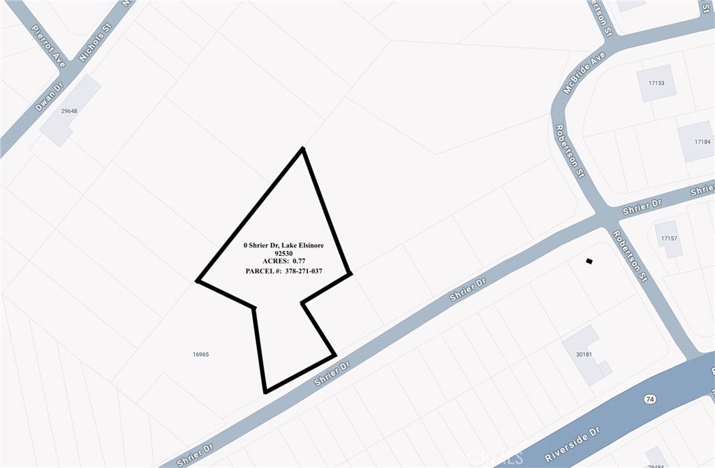 Nestled in the vibrant city of Lake Elsinore, in the heart of Southwest Riverside Count. 0 Shrier Drive offers a rare opportunity to own 33,541 square feet. 0.77 Acres of prime vacant land. Positioned on Robertson Street, this parcel is one of the last remaining large buildable lots in a flourishing family-friendly neighborhood. The property boasts RH (Residential Hillside) zoning, which is perfectly suited for custom-built homes or manufactured residences. Utilities are conveniently accessible in the street, simplifying the development process. Recorded easements along the back and side boundaries still leave ample space for a substantial building site, allowing for versatility and potential. Strategically located off Highway 7, this property provides seamless connectivity to the I-15 freeway, acting as a gateway to the area’s numerous amenities and attractions. Situated within a dynamic community experiencing ongoing development, this location offers an ideal setting for both residential and investment purposes. Lake Elsinore, Southern California’s largest natural freshwater lake, is a short distance away, From boating and fishing to water skiing, the lake promises endless fun for families and water sports enthusiasts. A nearby marina off Riverside Drive provides easy access to the lake, ensuring that aquatic adventures are always within reach. Additional recreational options include proximity to a baseball stadium, a motorcycle park, and a local airport. The property’s convenience extends to essential amenities, with schools, churches, and service providers located nearby. Shopping and dining options abound, with modern shopping centers, the Lake Elsinore Outlets, and Historic Downtown offering everything from everyday necessities to charming local experiences. Highway 74 ensures easy travel to nearby cities and attractions, while the scenic Ortega Highway provides a direct route to San Juan Capistrano and coastal destinations. Centrally located, this property offers unparalleled access to San Diego, Riverside, San Bernardino, Orange, and Los Angeles counties, making it a strategic hub for work and leisure.