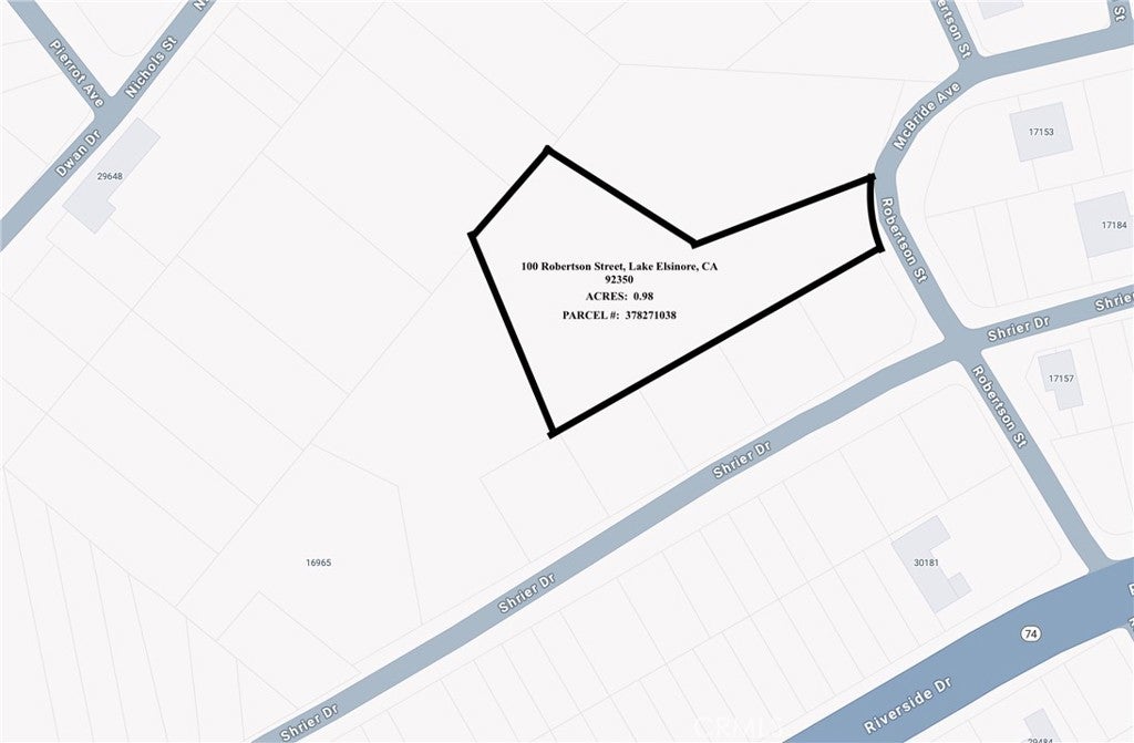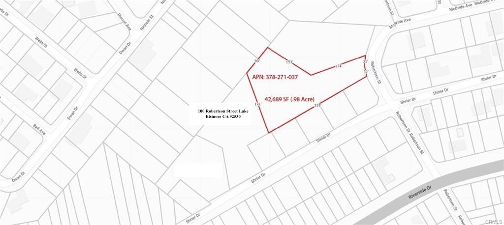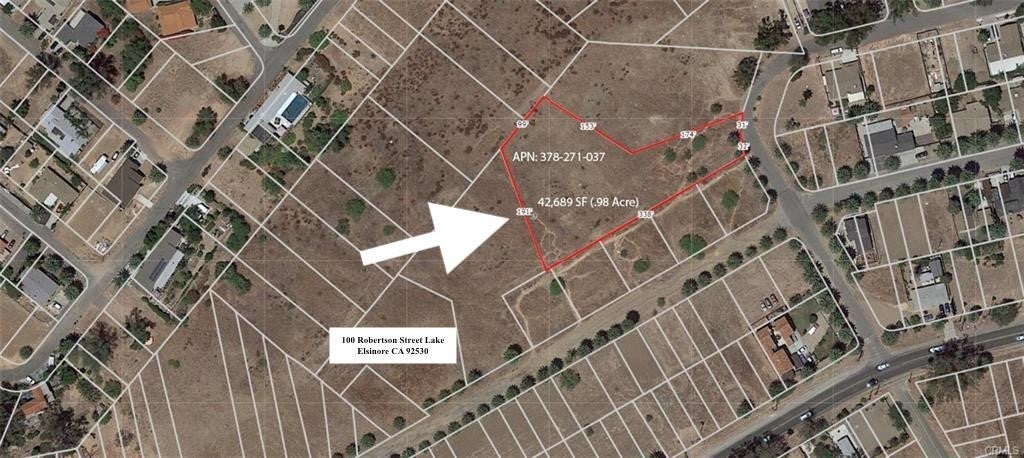 Nestled in the vibrant city of Lake Elsinore, in the heart of Southwest Riverside Count. 100 Robertson Street Lake Elsinore CA 92530 offers a rare opportunity to own 42,689 square feet. 0.98 Acres of prime vacant land. Positioned on Robertson Street, this parcel is one of the last remaining large buildable lots in a flourishing family-friendly neighborhood. The property boasts RH (Residential Hillside) zoning, which is perfectly suited for custom-built homes or manufactured residences. Utilities are conveniently accessible in the street, simplifying the development process. Recorded easements along the back and side boundaries still leave ample space for a substantial building site, allowing for versatility and potential. Strategically located off Highway 7, this property provides seamless connectivity to the I-15 freeway, acting as a gateway to the area’s numerous amenities and attractions. Situated within a dynamic community experiencing ongoing development, this location offers an ideal setting for both residential and investment purposes. Lake Elsinore, Southern California’s largest natural freshwater lake, is a short distance away, From boating and fishing to water skiing, the lake promises endless fun for families and water sports enthusiasts. A nearby marina off Riverside Drive provides easy access to the lake, ensuring that aquatic adventures are always within reach. Additional recreational options include proximity to a baseball stadium, a motorcycle park, and a local airport. The property’s convenience extends to essential amenities, with schools, churches, and service providers located nearby. Shopping and dining options abound, with modern shopping centers, the Lake Elsinore Outlets, and Historic Downtown offering everything from everyday necessities to charming local experiences. Highway 74 ensures easy travel to nearby cities and attractions, while the scenic Ortega Highway provides a direct route to San Juan Capistrano and coastal destinations. Centrally located, this property offers unparalleled access to San Diego, Riverside, San Bernardino, Orange, and Los Angeles counties, making it a strategic hub for work and leisure.