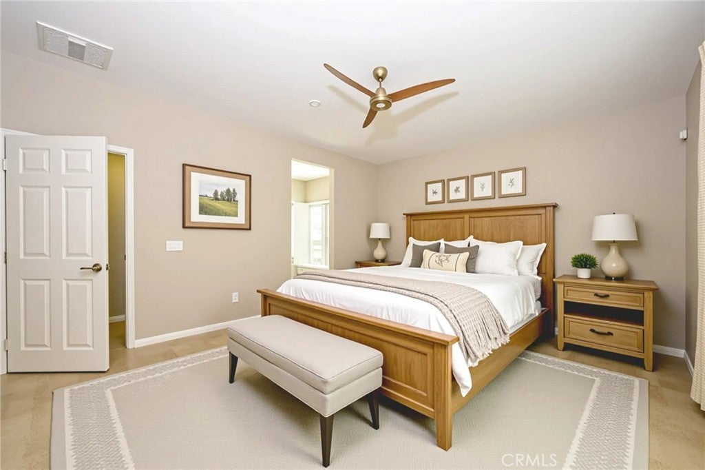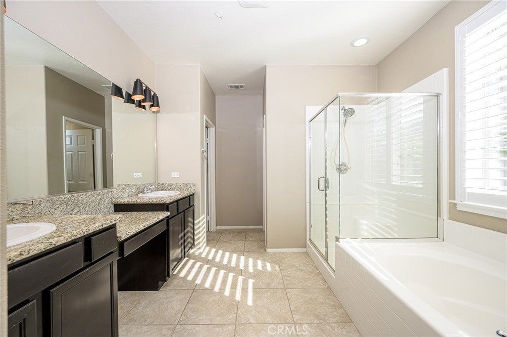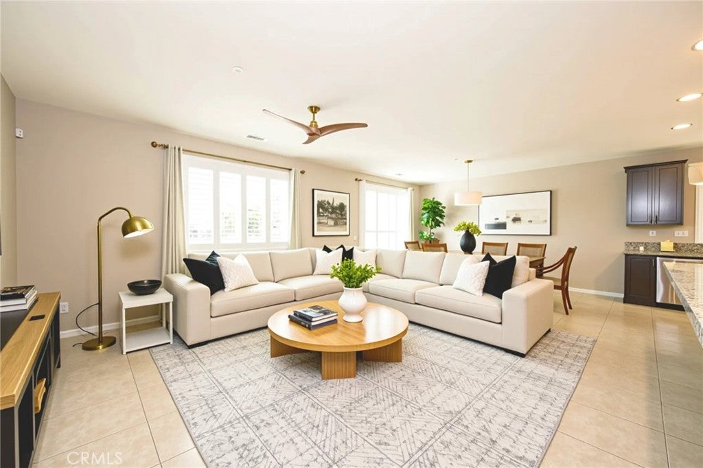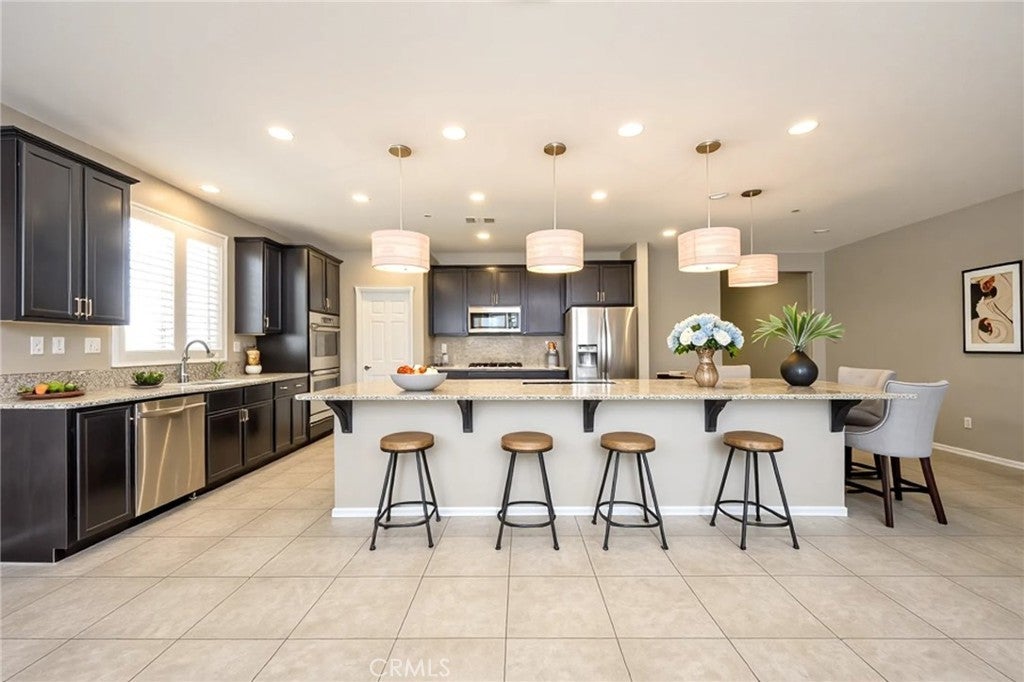 Now priced to sell! Discover resort-style living with everyday comfort in this beautifully upgraded 4-bedroom, 2-bath single-story home in Menifee’s Audie Murphy Ranch. The open-concept design features a bright and spacious great room that flows seamlessly into the dining area and a chef’s kitchen complete with an oversized island, bar seating for 8, designer lighting, and a walk-in pantry large enough to stock two kitchens. The private primary suite offers a peaceful retreat with a spa-inspired bathroom, soaking tub, separate shower, and a generous walk-in closet. Three additional bedrooms provide flexible space for family, guests, or a home office. Enjoy custom window shutters throughout, a roomy laundry/mudroom with extra storage, and direct access to a two-car garage. Step outside to your own backyard escape surrounded by lush tropical landscaping—perfect for relaxing or entertaining. Located in Audie Murphy Ranch, residents enjoy resort-style amenities including pools, parks, trails, and sports fields—all within walking distance of Heron Park, Menifee Skatepark, and the new Hamal Sanchez Sports Park. Move-in ready and solar powered—this home offers comfort, convenience, and community all in one.