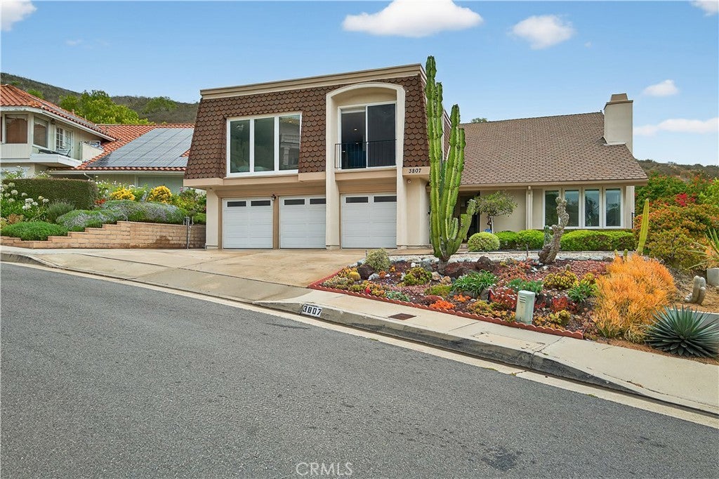 Enjoy ocean views from loft, primary suite, upstairs loft & deck as this upgraded residence is located near top of the hill. The 11,200 sq ft lot is well maintained & offers ultimate privacy, spacious side yard with pergola & room for pool. Upon entering new double doors with leaded glass you'll notice luxury plank vinyl flooring throughout, 2 fireplaces in living room & family room & walk behind bar as you enter gourmet kitchen. The kitchen boasts Kitchen Aid self cleaning oven, microwave, 5 burner electric stovetop, lazy Susan, trash compactor & Moroccan style stainless steel backsplash. Ideal downstairs guest bedroom with cedar lined, mirrored closet near 3/4 bathroom offers private access to rear yard. Downstairs bathroom features Phylrich faucet, vanity desk cabinet & rainglass shower door. Primary bedroom & bathroom offers double sinks plus cedar lining & mirrored closet. Other upstairs bedroom also offers cedar lined closet, built in cabinetry & laundry chute. Individual laundry room near downstairs bedroom features gas & electric. 3 car garage offers new epoxy flooring & Culligan water softener. Intercom is located at front door, kitchen & primary bedroom. Must See as this home is "Move in Ready".