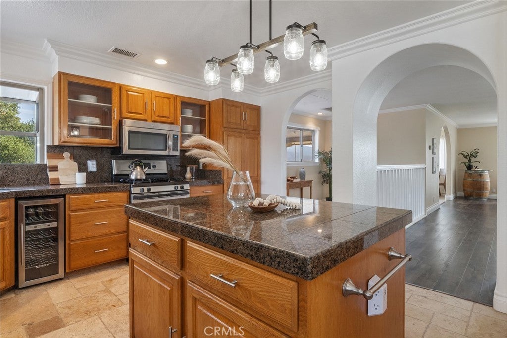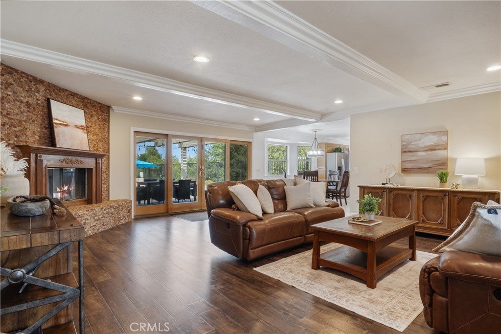 • Interior FeaturesBeamed Ceilings, Wet Bar, Breakfast Area, Ceiling Fan(s), Crown Molding, Separate/Formal Dining Room, Granite Counters, Living Room Deck Attached, Open Floorplan, Pantry, Recessed Lighting, Bar, Bedroom on Main Level, Jack and Jill Bath, Main Level Primary, Primary Suite, Walk-In Closet(s)