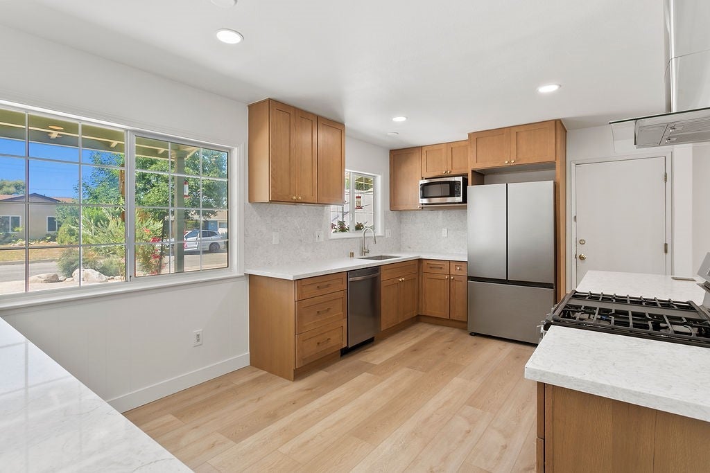 Welcome to 631 Gayville Drive, Claremont - The City of Trees! Tucked away on a quiet cul-de-sac, this stunning, fully renovated home offers the perfect blend of modern elegance and family comfort. Designed with a bright, open-concept floorplan, this spacious residence features 5 bedrooms and 3 beautifully remodeled bathrooms. This home has two masters bedrooms with en-suites, perfect for an extended family! The heart of the home is the chef's kitchen, complete with quartz countertops, custom white oak cabinetry and brand-new, top-of-the-line appliances. Throughout the home, you'll find luxury vinyl plank flooring that adds warmth and style. Retreat to the expansive primary suite, boasting a large walk-in closet, spa like bathroom and a peaceful sitting area overlooking the private backyard. Every detail of this home has been thoughtfully redesigned for contemporary living. It has upgraded copper piping and new 200 amp electric panel, new main water and sewer lines, dual paned windows to keep it all quite. The seller made a permitted addition of the primary bedroom, bathroom and walk-in-closet making the SF to 2140! There are leased solar panels that are transferable. The yards are designed to be drought resistant too. Nothing else to do except ENJOY! Located just minutes from award-winning Claremont schools, scenic parks and the vibrant Claremont Village. The city of Claremont allows ADU's built on this property. Don't miss this rare opportunity to own a turnkey gem in one of Claremont's most desirable neighborhoods. The seller may offer 2-1 buydown to save big on monthly payments.
