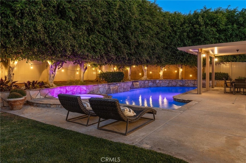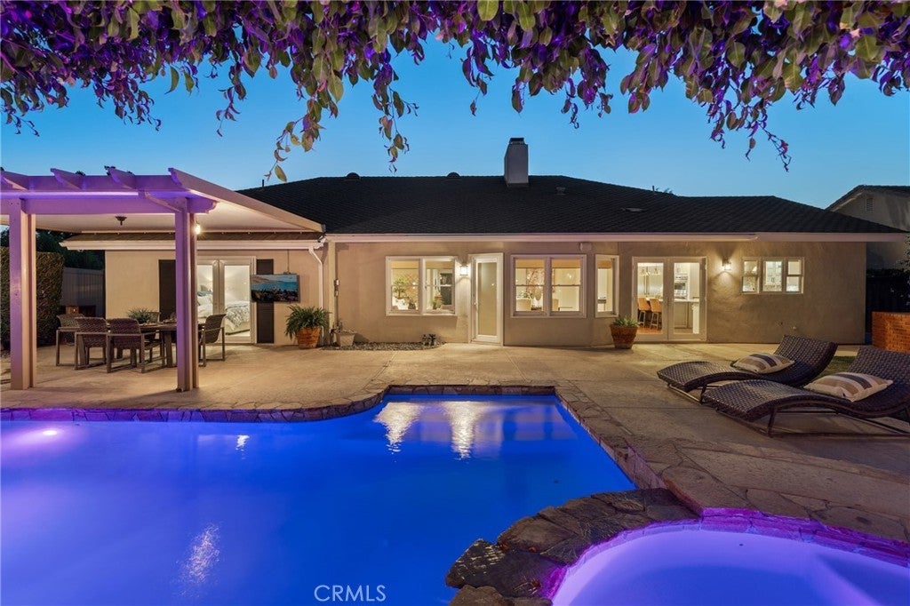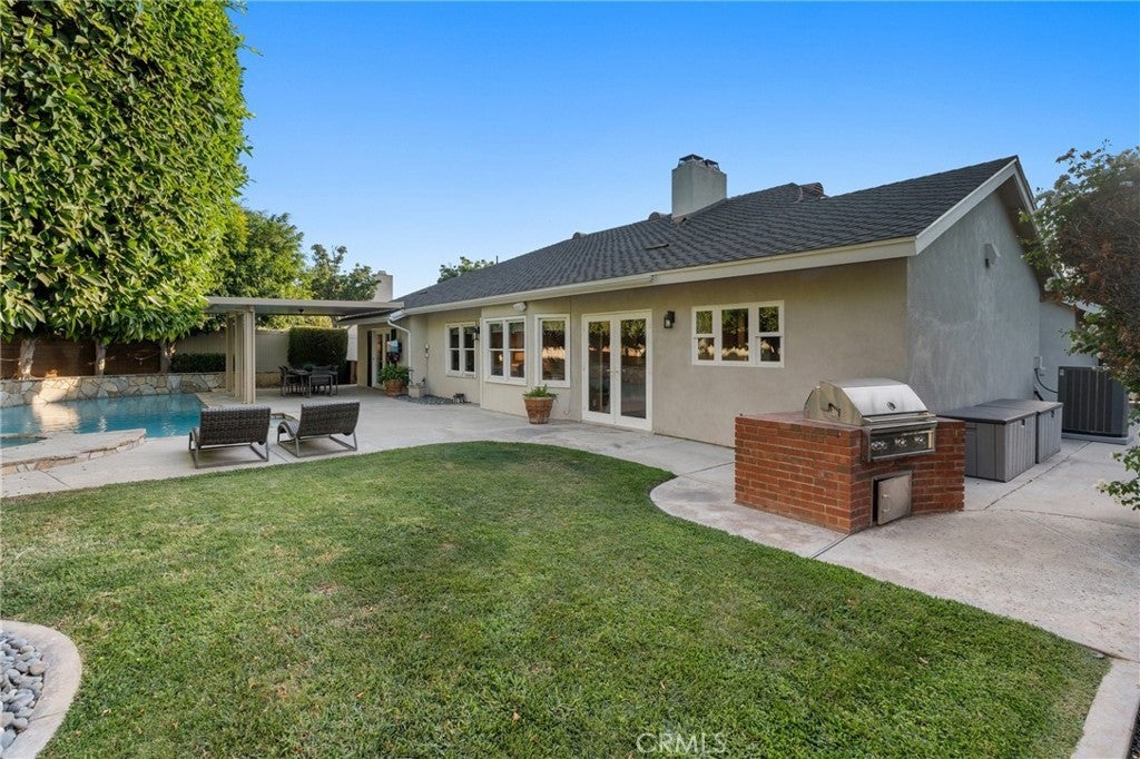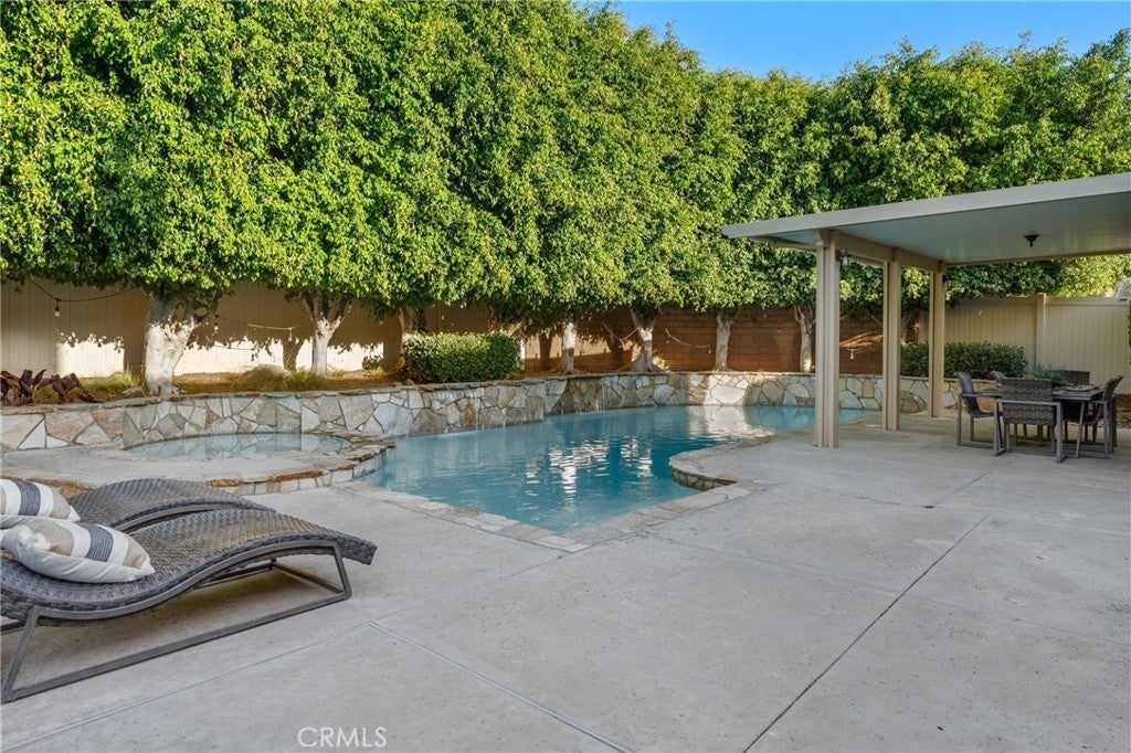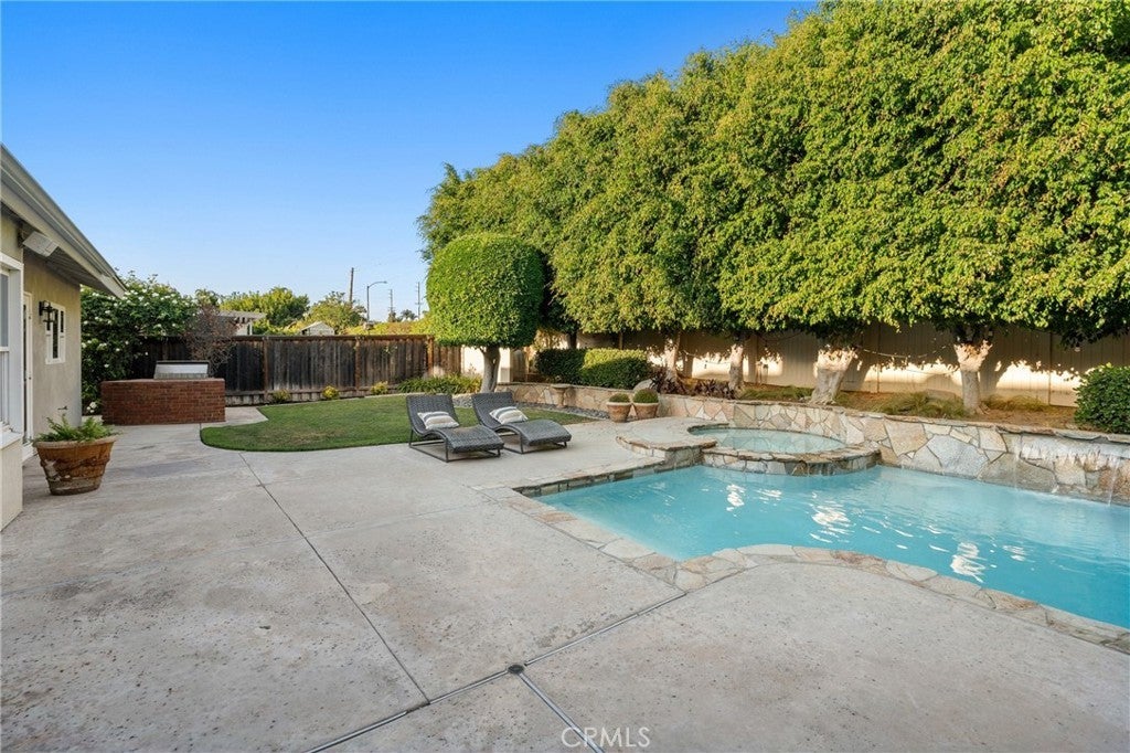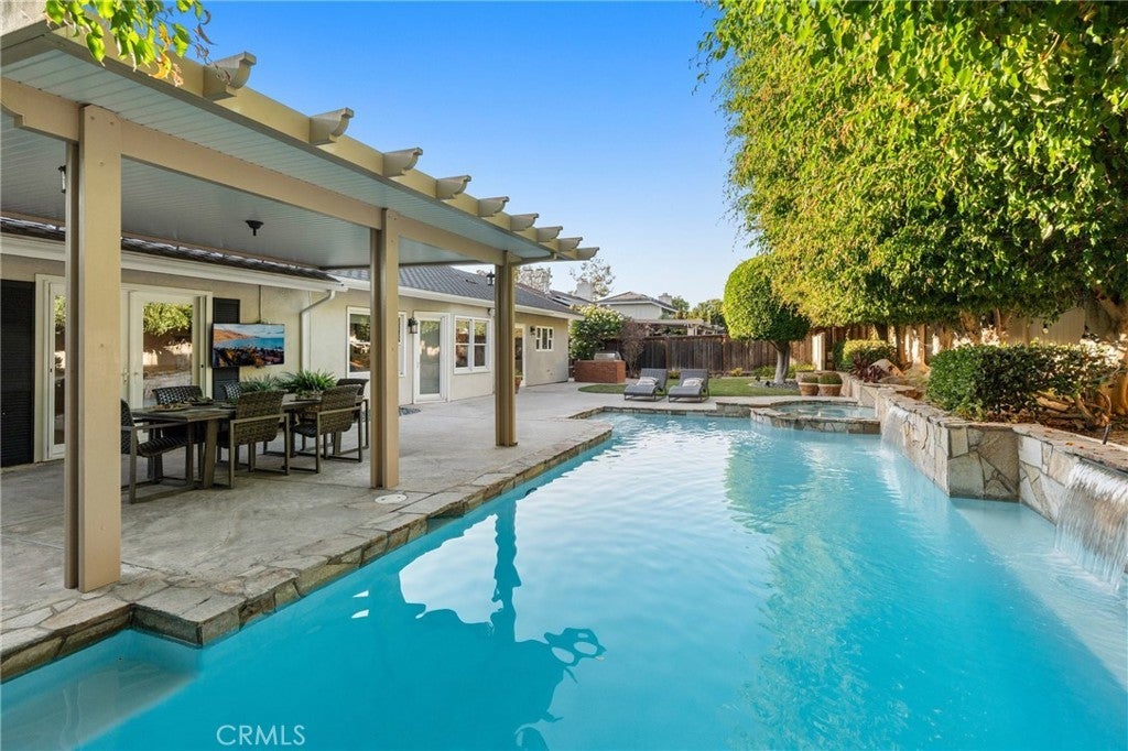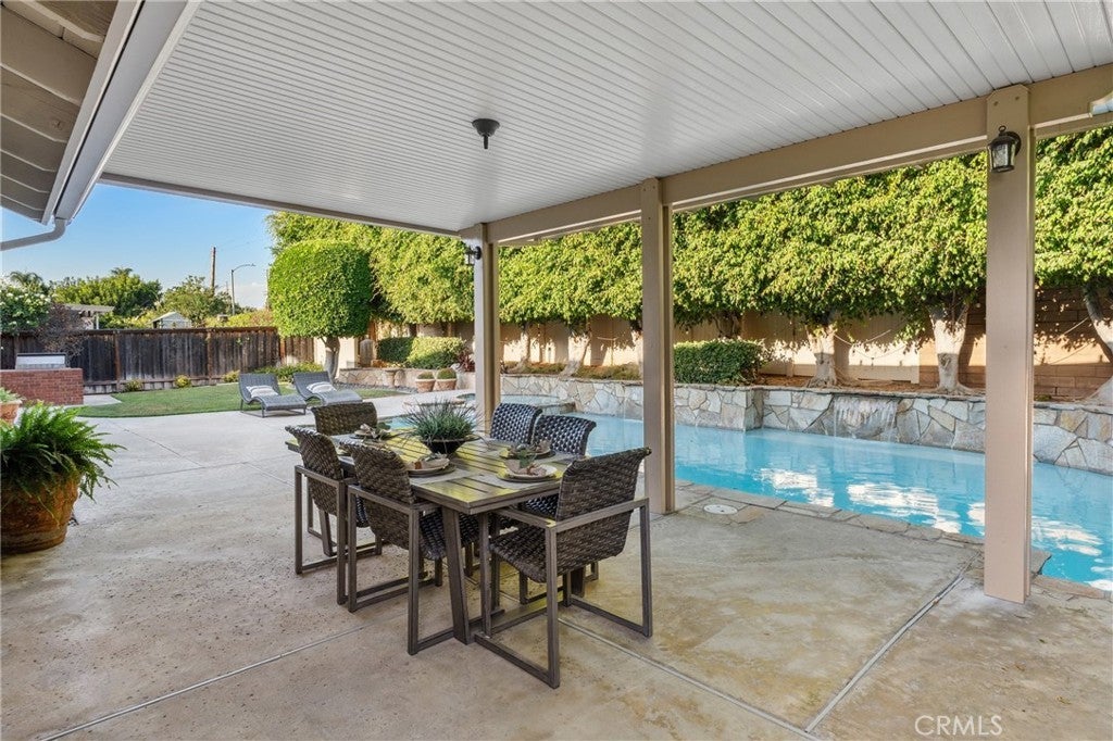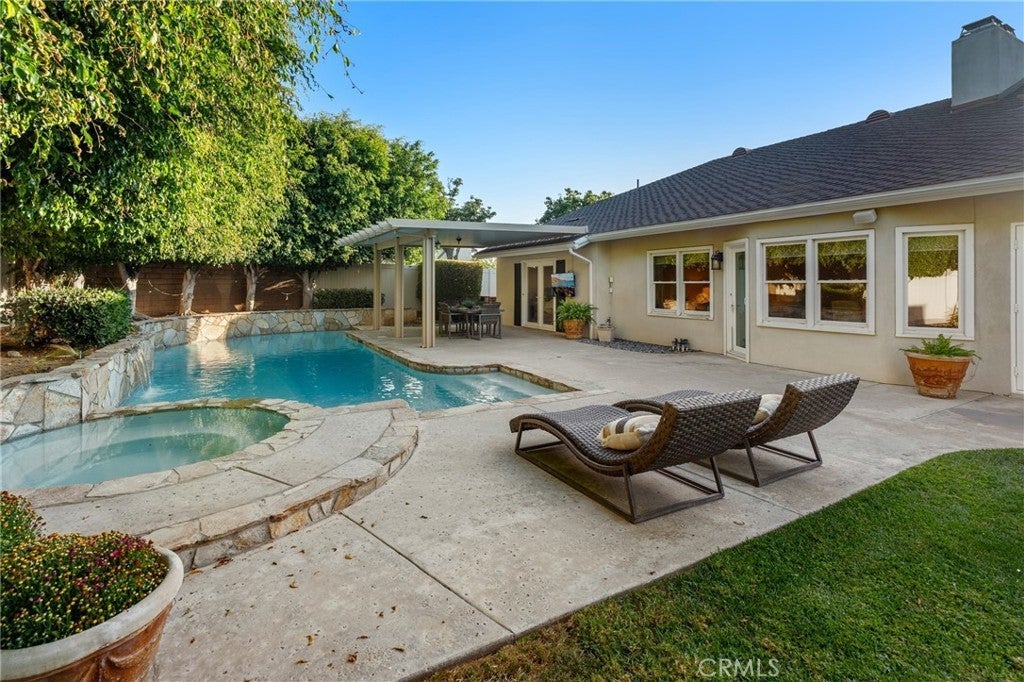 Indulge in the epitome of a single level luxury living in this exquisitely RENOVATED HOME. Boasting 2665 Sq. Ft of meticulously designed living space this 4 bedroom 2 bathroom residence offers unparalleled comfort and sophistication. The rare advantage of a SINGLE LEVEL layout with NO STEPS ensures effortless living. Step inside and be captivated by the expansive OPEN FLOOR PLAN, highlighted by soaring CATHEDRAL CEILINGS. The heart of the home is a spectacular kitchen, a chefs dream come true. Featuring a large seated island, 6 burner gas cooktop + griddle, double ovens, built in GE MONOGRAM REFRIGERTOR & FREEZER, microwave drawer, separate prep sink, filtered drinking water GE MONOGRAM ALPPLIANCES. Bonus, there is a convenient coffee bar with a beverage refrigerator and spacious walk in pantry, two separate trash bins, cabinet organizers. The formal dining area features a fireplace and is currently being utilized as a billiard room. The open living area is inviting and also enjoys a fireplace, cathedral ceilings and another area for family dining. Another special feature is the spacious primary suite featuring sliding doors leading to the outside covered patio and pool area, this suite also enjoys a wonderful bath area with separate soaking tub, walk-in shower and two separate vanities. The advantage of having 4 bedrooms allows for one room to utilized as a home office. Step outside to the very private backyard featuring a 10,000 sq ft level lot with mature trees. Enjoy casual living or entertaining is this very private backyard also featuring a built in LYNX BBQ and swimming pool and spa with beautiful colored lights. The SWIMMING POOL & SPA have just been replastered. Enjoy Al Fresco dining under the covered patio or sun yourself on the open patio. Both sides of the home are spacious and one side is gated for a potential dog run. Beautiful NEW VINYL FENCING surrounds this corner lot home. Enjoy the convenience of an attached 3 car garage with built in cabinets and direct access to the home. This neighborhood is beautiful and has NO HOA! Located near an array of restaurants, this exceptional property is the perfect blend of luxury, convenience and effortless elegance. This is more than a home, it's a lifestyle. Seldom does a single level home without any steps + a 3 CAR GARAGE come onto the market. Don't miss this opportunity.