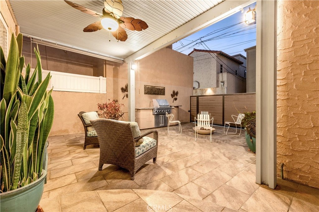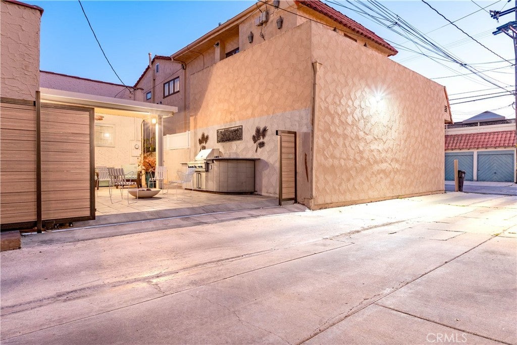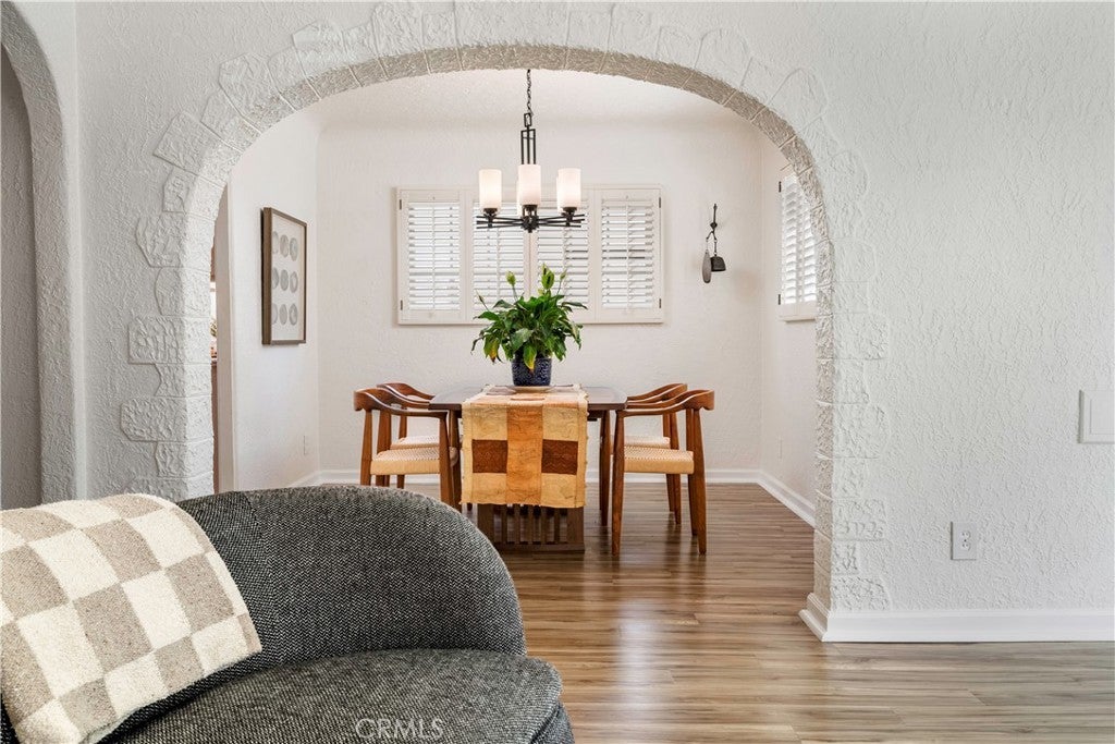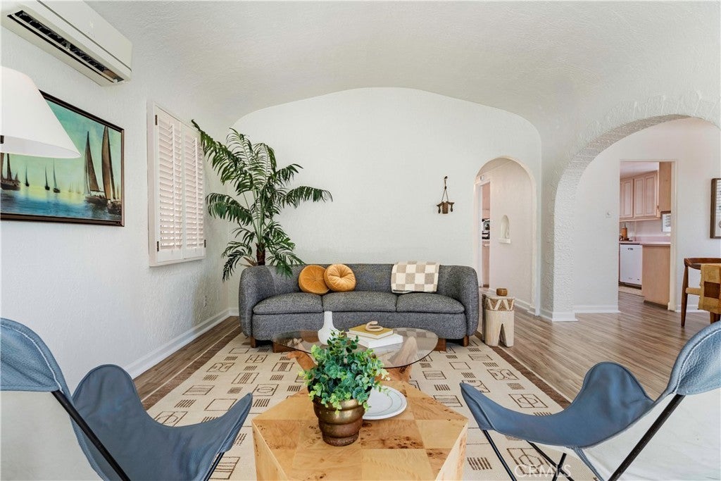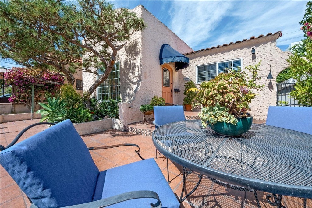 Enjoy the best of Belmont Shore living in this charming Spanish Bungalow, just one block from the boutiques and restaurants of Belmont Shore/2nd St, and two blocks to the beach. Behind the entry gate, a lushly landscaped courtyard welcomes you with generous space for outdoor dining and lounging. Step inside the house and classic details like coved ceilings and arched passageways highlight the home’s classic Spanish design, while modern upgrades such as zoned heating and cooling ensure everyday comfort. The 1,332 square foot interior offers a thoughtful layout; living room, dining room, kitchen, and family room are distinct yet flow effortlessly with continuous luxury vinyl plank flooring. The bright, expansive kitchen features abundant cabinetry, a wine fridge, countertop seating for four, and a seamless connection to the cozy family room with its brick fireplace. Two bedrooms provide flexibility, with one customized as a home office with built-in desk, shelving, Murphy-style bed, and dual closets, and the primary bedroom featuring a spacious mirrored wardrobe. The updated bathroom features dual sinks and a spacious shower accented with glass tile accent. Accessible from the family room, the back yard includes a covered lounge with ceiling fan, an open patio area with a built-in gas grill, and an electronic rolling gate for optional off-street parking. Adjacent to the patio at the back of the property, a separate bonus structure houses laundry, built-in storage, and work benches; ideal as a workshop, studio, or home gym. This is Belmont Shore at its best, with classic charm, modern updates, and indoor-outdoor living just steps from the beach and the shops and restaurants of 2nd St.
