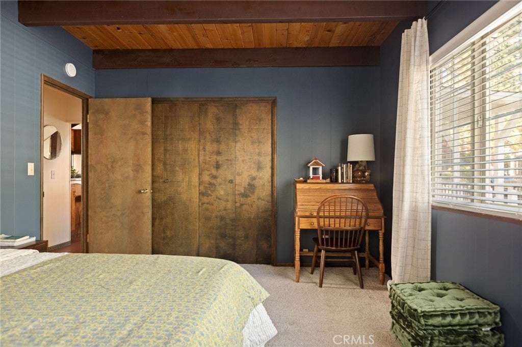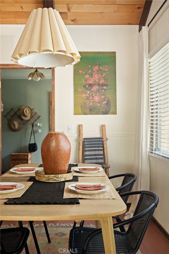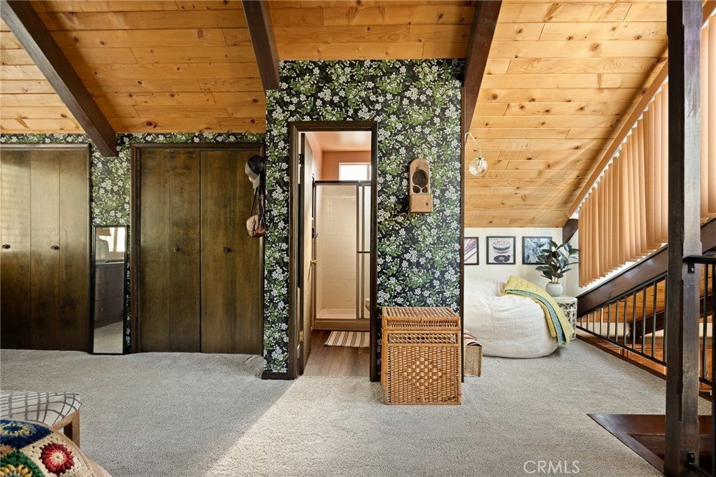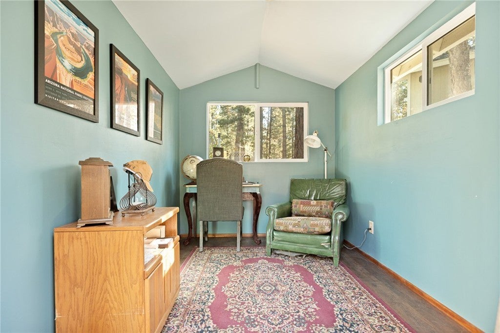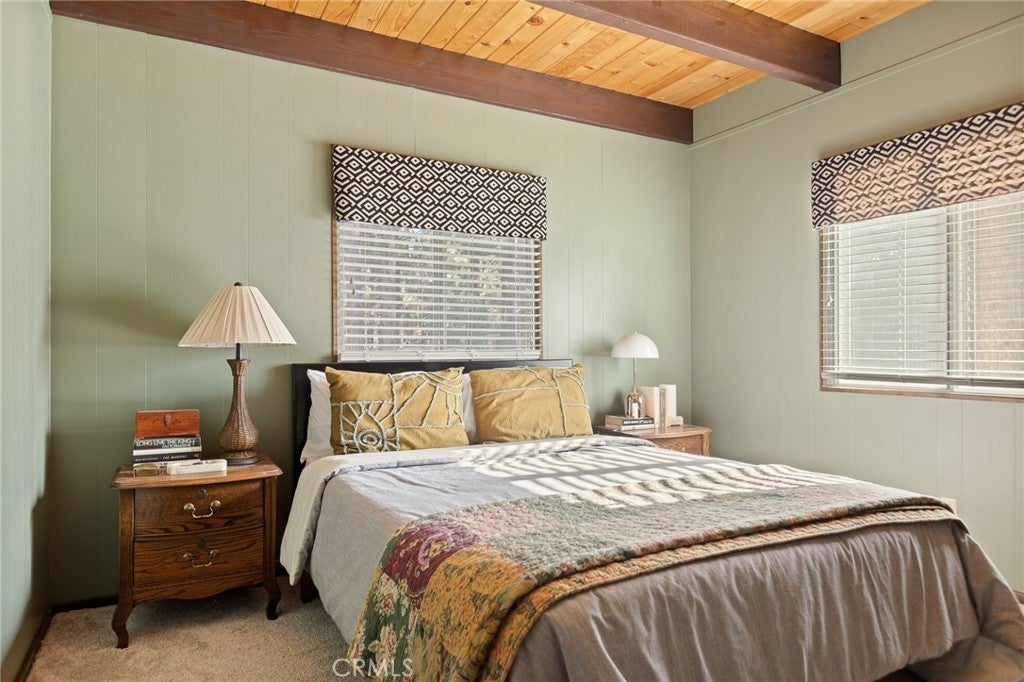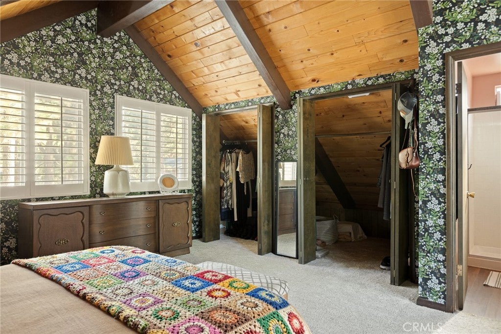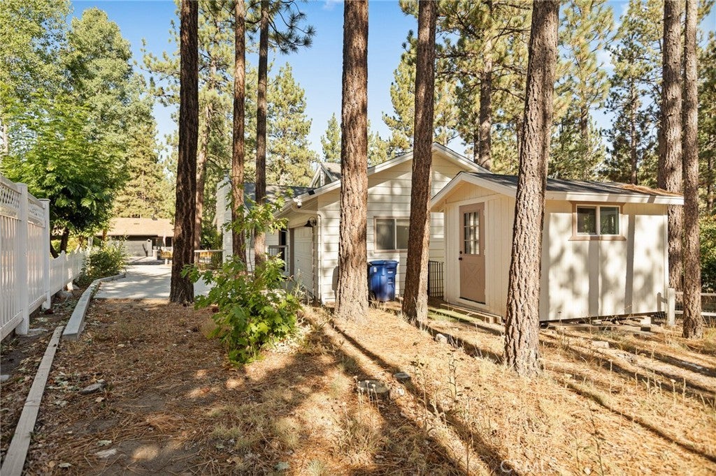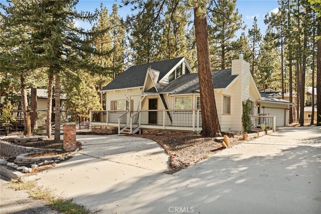 Welcome to the most charming chalet-style dream cabin in Pinewood Estates, Big Bear. This is an incredible opportunity to own the most stylish Big Bear escape, thoughtfully renovated and curated by a Los Angeles interior designer and antique dealer. This 3-bedroom, 2-bath home blends timeless A-frame charm with modern comfort, creating a truly one-of-a-kind retreat. Step inside to soaring A-frame T&G ceilings, a cozy fireplace with wood stove, and a sunny bay window perfect for reading. The beautifully updated kitchen features Cambria quartz countertops with a waterfall peninsula, designer green Zellige backsplash, touchless faucet, and a double-bowl sink—all paired with original vintage cabinetry that adds warmth and character. The loft-style primary suite offers a peaceful retreat with ensuite bath, dual closets, and a large A-frame window framing treetop views. Two downstairs bedrooms include ample storage and vintage dressers, while updated bathrooms showcase modern style with designer finishes. Outdoor living shines with a front deck, fully-fenced backyard, dual-access gates, three producing fruit trees (apple, plum, peach), and a “Dad Pad” converted shed with electric, insulation, and Milgard windows—perfect for a studio, office or game room for the kids. A looped front driveway plus extended driveway and 2-car garage provide ample parking for cars, RV, or boats. Every detail of this home has been thoughtfully upgraded, including: brand new asphalt shingle roof (Malarkey), fresh exterior & interior paint, new flooring throughout, new front & back deck railings and steps, new Therma-Tru Fiber-Classic front door with e-glass, app-controlled locks, Nest thermostat, app-controlled lights, & Eufy security system, new interior stairs and railing, updated window coverings, new USB outlets, new stacked laundry machines, and even a bonus elliptical machine in garage! Located minutes from the lake, ski slopes and village, this home combines designer style, thoughtful upgrades, and mountain charm. Whether you’re seeking a weekend retreat, full-time residence, or investment, this is Big Bear living at its finest. Don't miss this rare opportunity!