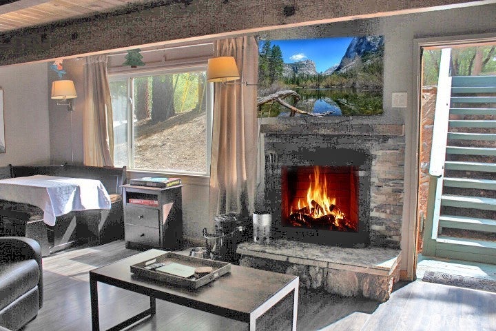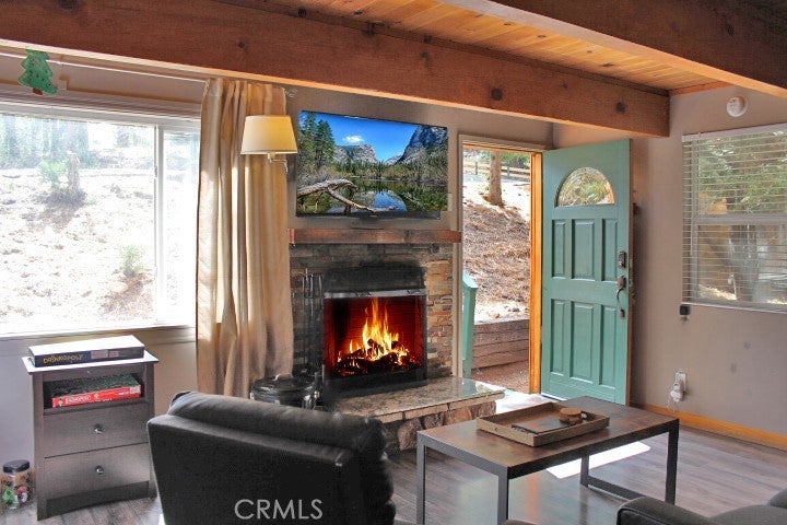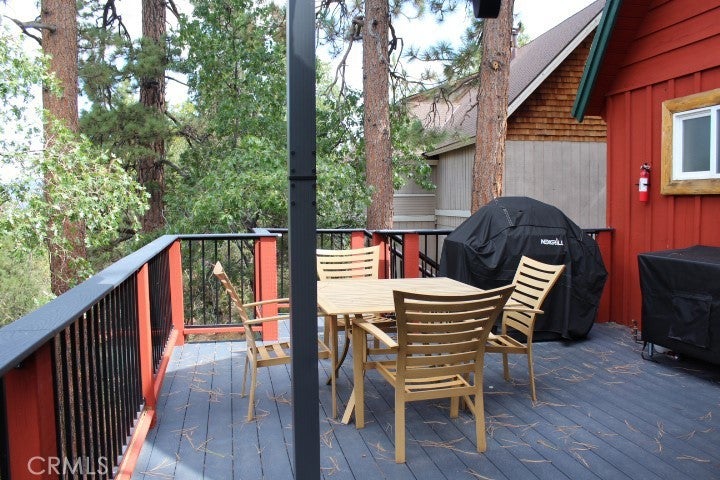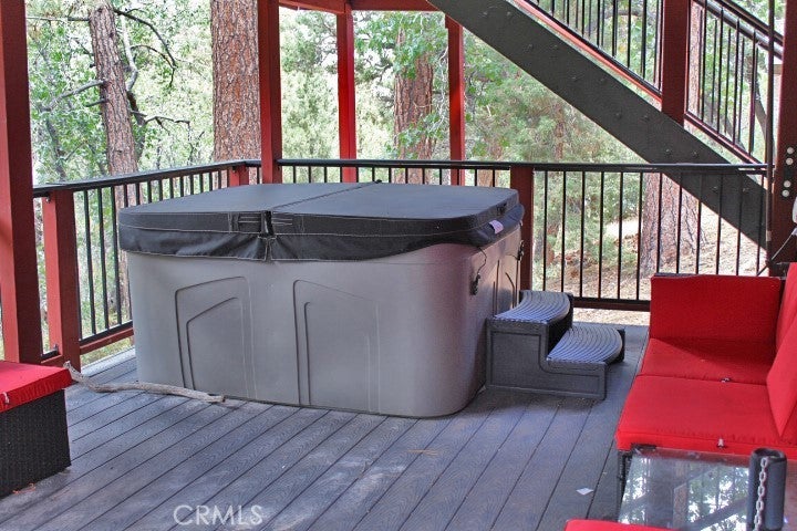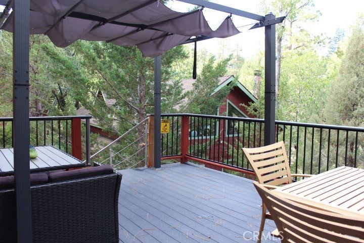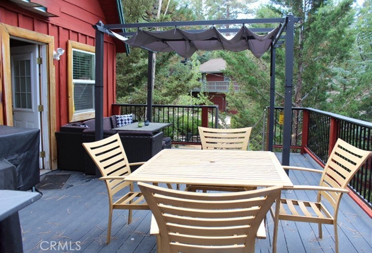 What a wonderful classic cabin on almost a half acre lot! Cute log style exterior and located on a quiet street in a lovely location in Moonridge. Beautifully updated home with vinyl plank flooring, kitchen with granite counters, newer cabinets, stainless appliances ,and open great room with cozy fireplace! Downstairs enjoy a stylish fully updated bathroom, laundry room and upstairs the coziest bedrooms feature cathedral knotty pine ceilings. But wait there is more! Outside features are awesome with upper trek style deck featuring lovely outdoor furniture, gazebo with party lights, BBQ and dining all overlooking your own enchanted forest! A spiral staircase leads to an equally amazing lower deck with gorgeous outdoor spa, and cozy furnishings. This is the sweet cabin you have been looking for and it's also a successful vacation rental!