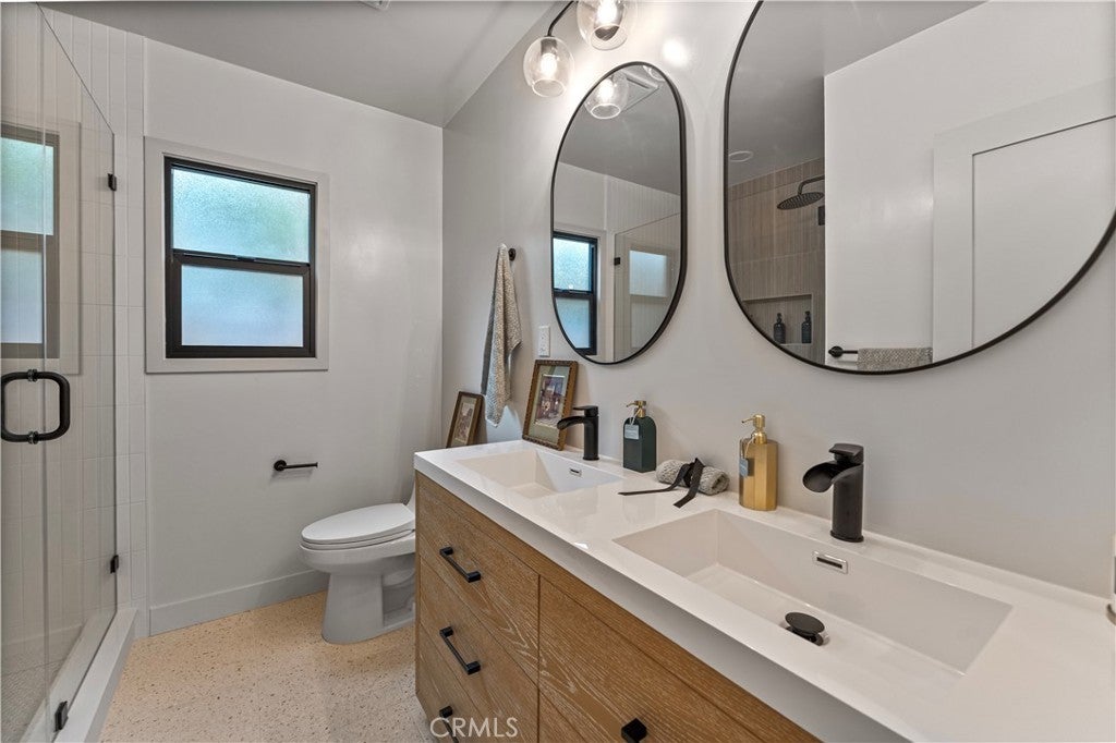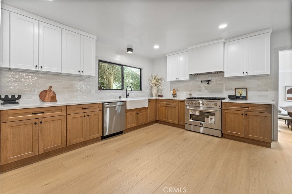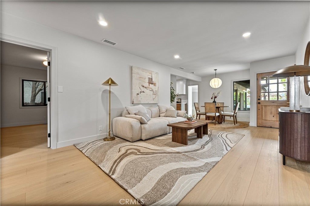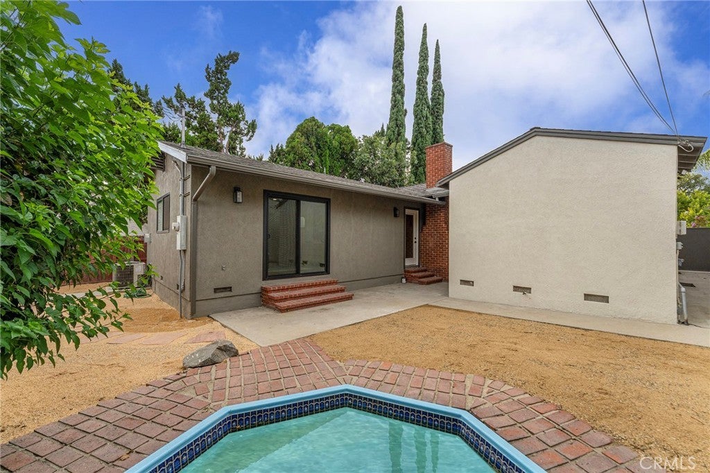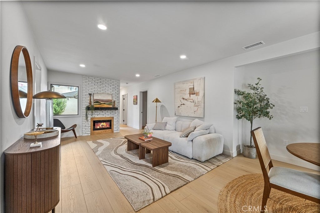 Tucked away on a picturesque, tree-lined street in the desirable Burbank foothills, this beautifully renovated modern traditional home blends timeless charm with contemporary elegance. From the moment you step inside, you're greeted by an expansive open-concept layout featuring a dramatic decorative brick fireplace with a custom wood mantel—setting the tone for stylish, comfortable living. The chef’s kitchen is a true showpiece, complete with sleek countertops, designer tile backsplash, custom cabinetry, and top-of-the-line stainless steel appliances. Perfect for both entertaining and everyday living, the seamless indoor-outdoor flow is highlighted by sliding glass doors that lead to a spacious deck and a generous, grassy backyard—ideal for gatherings or quiet relaxation. The tranquil primary suite offers direct access to the backyard, a custom-organized closet, and a luxurious ensuite bath featuring a dual-sink vanity, glass-enclosed shower, and a deep soaking tub for spa-like indulgence. Two additional bedrooms at the front of the home share a beautifully updated full bath, providing ample space for family or guests. Outside, the fully fenced and gated backyard offers multiple zones for entertaining, play, or future pool/spa addition. A detached two-car garage completes this exceptional offering. Located in one of Burbank’s most coveted neighborhoods—just moments from top-rated schools, major studios, shopping, dining, and commuter routes—this is California living at its finest.