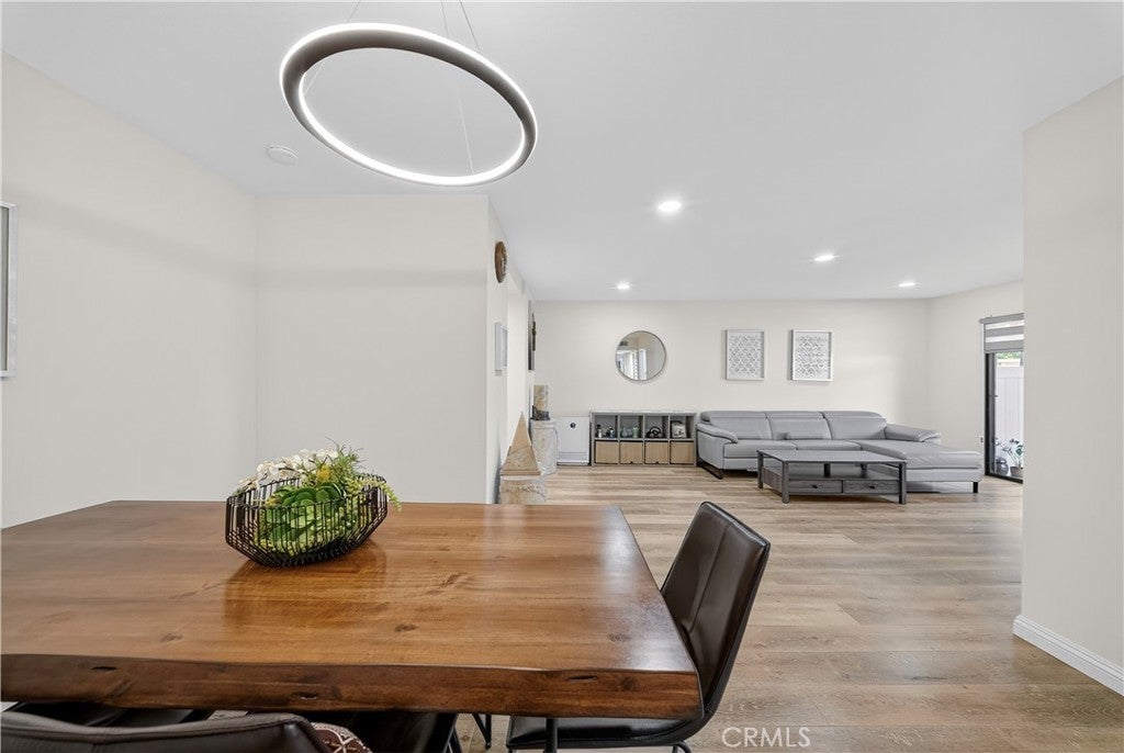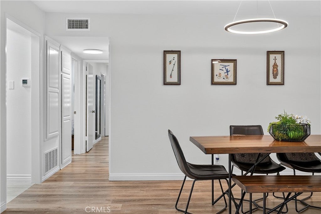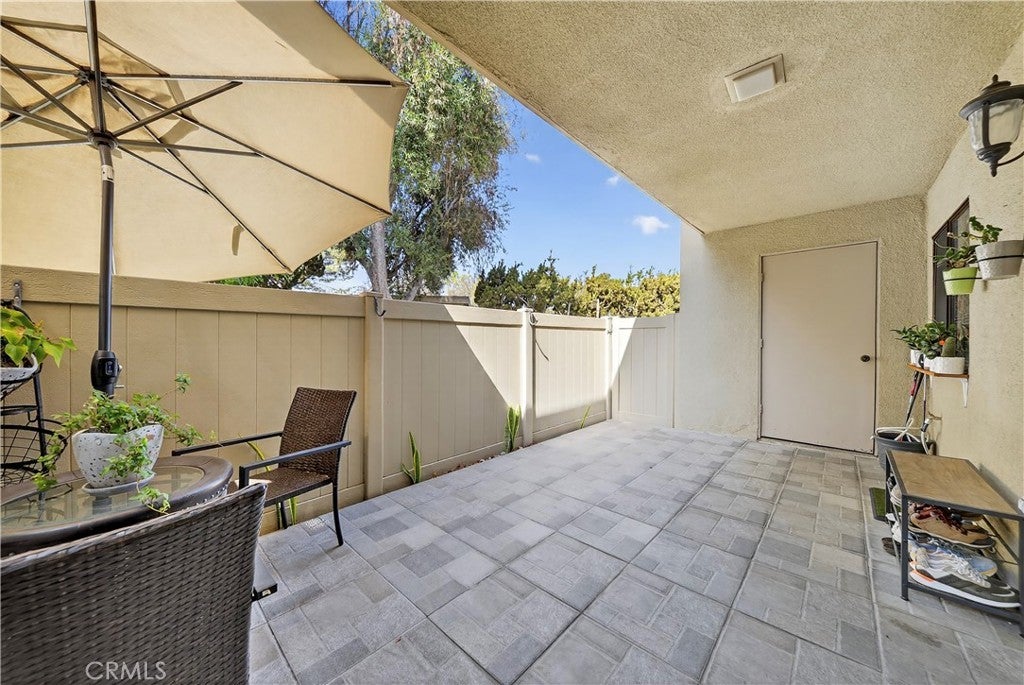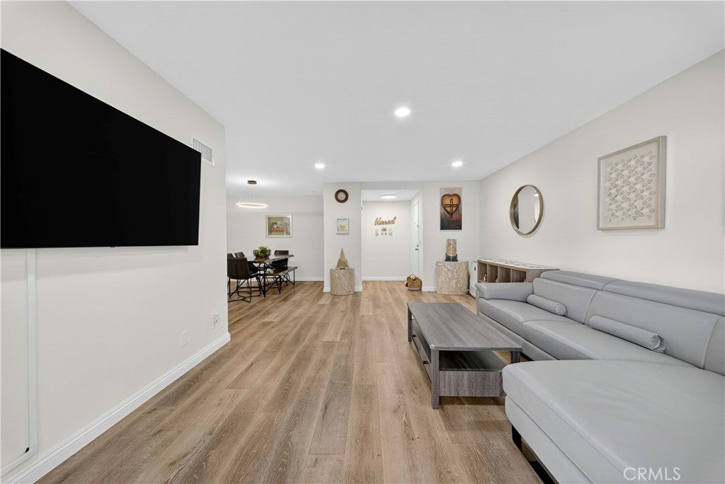 Welcome to this beautifully updated downstairs unit with no steps, located in the highly desirable La Mirada Landmark 55+ community. This bright and airy 2 bedroom, 2 bathroom condo features luxury vinyl flooring, fresh paint, recessed lighting, and dual-pane windows that create a modern and inviting atmosphere. The spacious living room opens to a private patio with newer tile, perfect for outdoor relaxation. The remodeled kitchen showcases sleek quartz countertops, while both bathrooms have also been tastefully updated. Ample storage is provided with large closets, and the convenience of having the 1-car garage nearby (Garage 3P1 #4) and plenty of community parking adds to the home’s appeal. Perched at the highest point of Landmark, enjoy a serene setting within a guard-gated community offering 24/7 security patrols, resort-style amenities including a pool, spa, tennis and pickleball courts, fitness room, clubhouse, and scenic walking trails. Located across from the La Mirada Golf Course and near the H-Mart shopping center, this property combines serene living with convenience and offers the perfect blend of comfort, security, and an active lifestyle.