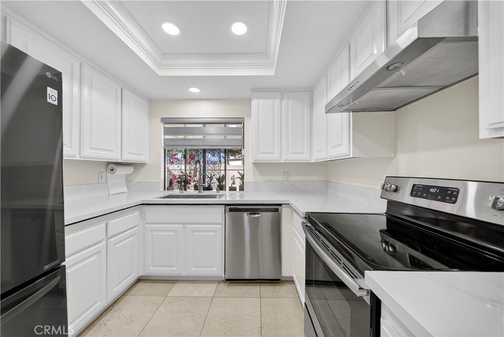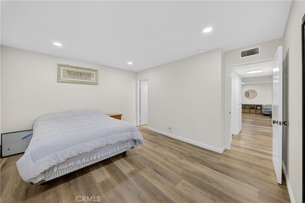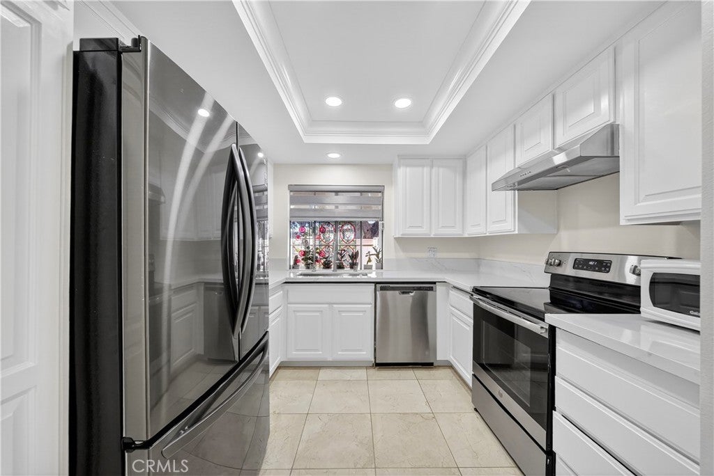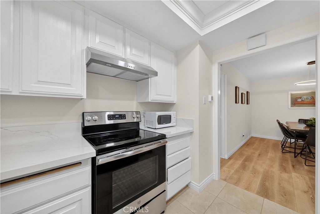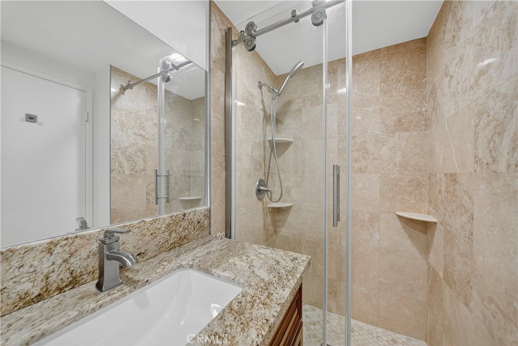 Welcome to this beautifully updated downstairs unit with no steps, located in the highly desirable La Mirada Landmark 55+ community. This bright and airy 2 bedroom, 2 bathroom condo features luxury vinyl flooring, fresh paint, recessed lighting, and dual-pane windows that create a modern and inviting atmosphere. The spacious living room opens to a private patio with newer tile, perfect for outdoor relaxation. The remodeled kitchen showcases sleek quartz countertops, while both bathrooms have also been tastefully updated. Ample storage is provided with large closets, and the convenience of having the 1-car garage nearby (Garage 3P1 #4) and plenty of community parking adds to the home’s appeal. Perched at the highest point of Landmark, enjoy a serene setting within a guard-gated community offering 24/7 security patrols, resort-style amenities including a pool, spa, tennis and pickleball courts, fitness room, clubhouse, and scenic walking trails. Located across from the La Mirada Golf Course and near the H-Mart shopping center, this property combines serene living with convenience and offers the perfect blend of comfort, security, and an active lifestyle.