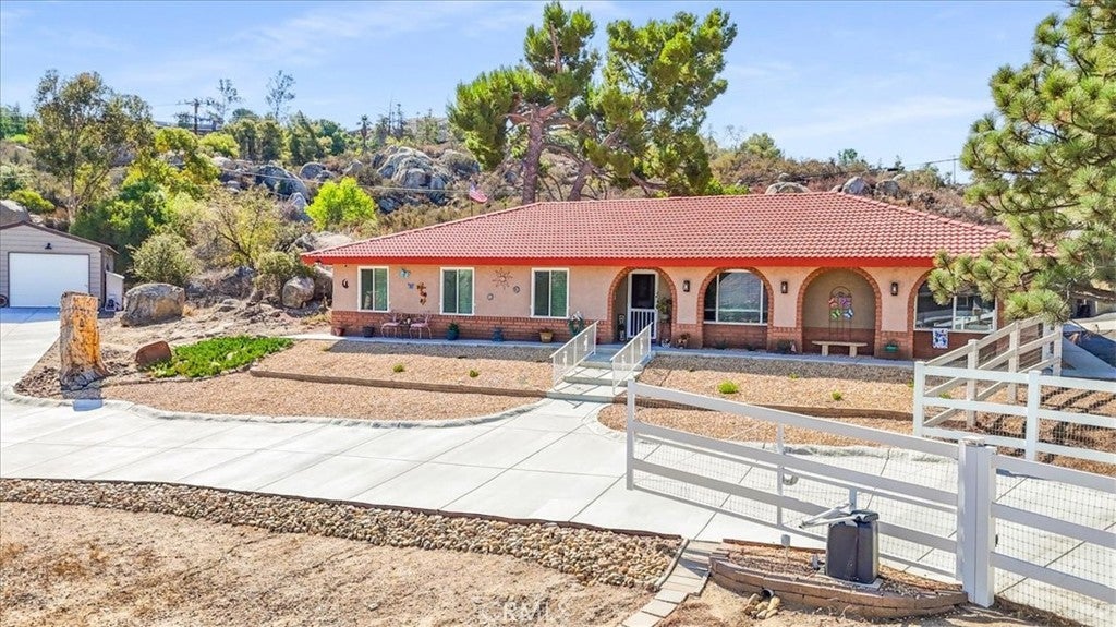 Welcome Home! Enjoy incredible views from this turnkey custom property featuring 4 bedrooms and 2 bathrooms on nearly one acre of land. Includes an additional parcel across the street, a 3-car garage plus an 800 sq. ft. shop/4-car garage with electricity, RV access, and water hose connectors throughout, making it ideal for horse lovers and outdoor enthusiasts. Interior upgrades include granite countertops, dual-pane windows, ceiling fans, air conditioning, a master suite with sliding door access, French doors in the living room, water purification system, garage sink, and new front and garage doors. Landscaped yards with sprinklers in front and back, farm-style white fencing, swing gate at the bottom, and powered front gate with remotes add charm and convenience. Enjoy Hemet city lights and sweeping views of the Big Bear and Idyllwild mountain ranges. Move-in ready with extensive upgrades, this home truly has it all. Come and see it for yourself!