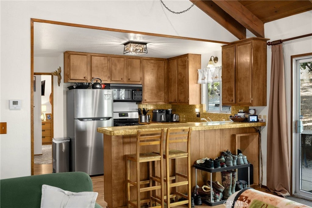 • Interior FeaturesBreakfast Bar, Ceiling Fan(s), Beamed Ceilings, Bedroom on Main Level, Cathedral Ceiling(s), Furnished, High Ceilings, Living Room Deck Attached, Open Floorplan, Pantry, Primary Suite, Storage, Tile Counters, Two Story Ceilings, Walk-In Closet(s)