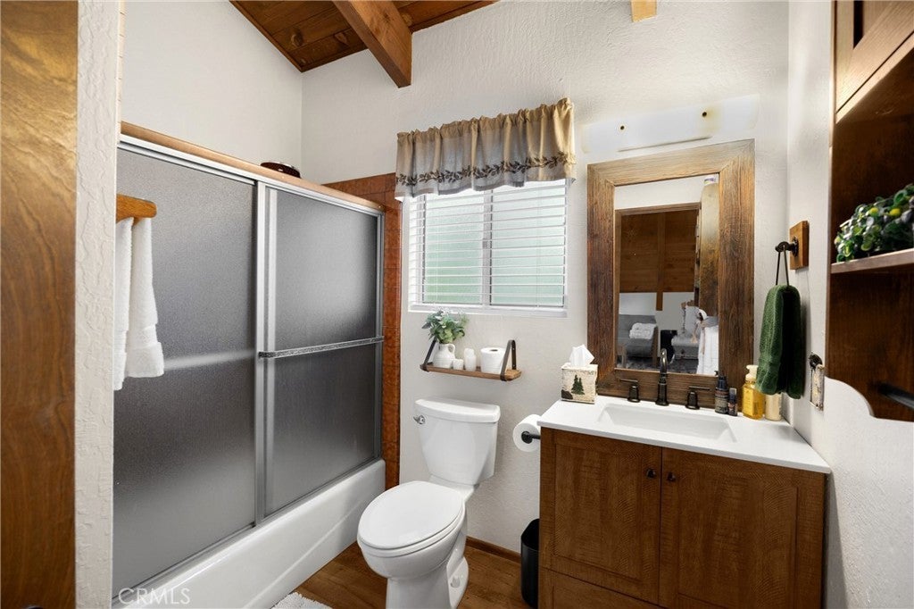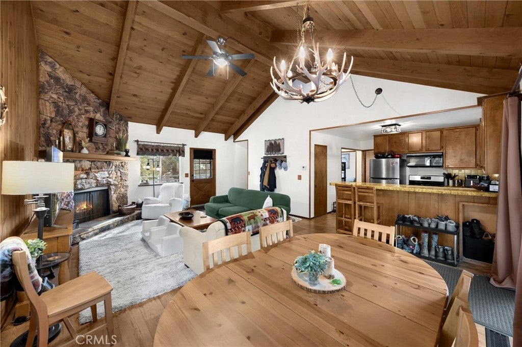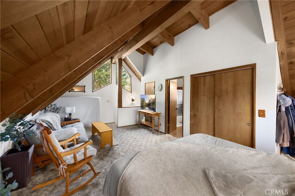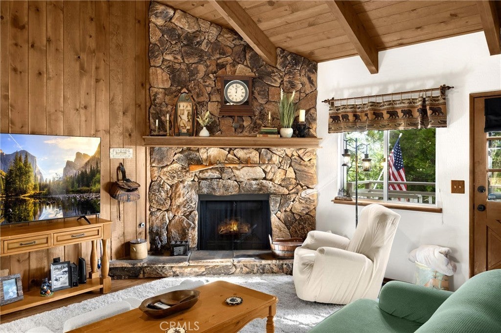 Nestled in the woods yet just a stone's throw from Lake Arrowhead WITH Lake Rights, this charming gem offers the perfect balance of seclusion and convenience. Well-maintained and ready for your next adventure, it's the idea place to unwind and reconnect with nature and the mountain environment. With dual access-from the front and rear-you have options for easy access with plenty of parking availability. Inside, you'll find an open living area with vaulted ceilings, tongue-and-groove wood paneling, and a cozy wood burning fireplace-perfect for those chilly winter days. The main floor features a spacious living room and dining area, a fully equipped kitchen, two bedrooms and a full bath. And, with the laundry conveniently located right across from the bedrooms, everyday living couldn't be easier. Upstairs you'll find the primary suite to be a true sanctuary. Soaring ceilings, a private en-suite bath, and plenty of closet space create a peaceful escape. There's also enough room for a small home office, reading nook, or yoga space, making this the perfect place to recharge. Wait .. there's more! The lower level is a mostly unfinished basement with plenty of room for storage-whether it's holiday decorations or lake toys, there's room for everything you need. Sold mostly furnished, this four season cabin makes transitioning to your mountain getaway simple. C'mon Up - the mountains and lake are waiting for you!
