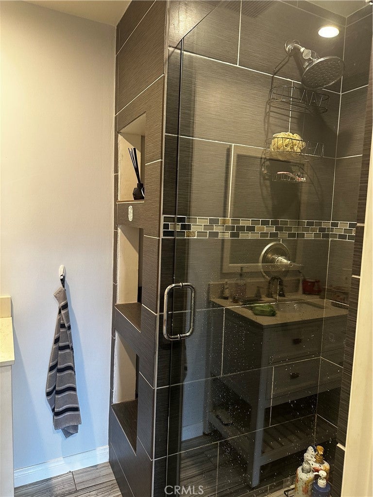 Welcome to this beautifully updated ground level condo filled with modern charm and convenience. Step into a large open living area featuring new vinyl plank floors, dimmable recessed lighting, and abundant natural light. The spacious living room seamlessly flows into a dining area adorned with custom shelves, conveniently adjoining the updated kitchen. Enjoy white shaker cabinets, gray quartz counters, stunning glass tile backsplash, and stainless-steel appliances in the kitchen, complete with a slider to a private patio. Bedrooms and remodeled bathrooms are tucked down the hallway for privacy. The master suite boasts a tiled shower, gorgeous flooring, and double closets. Enjoy recessed HUB-ready lighting, a gym, 2 laundry rooms in the complex, pools, spa, and 2 parking spots through the HOA. Located in the esteemed Los Alamitos School District, with proximity to OC, LA, freeways, parks, shopping, and a walk score of 75. Perfect for first-time buyers, second homes, downsizing, or investment! Unit D110