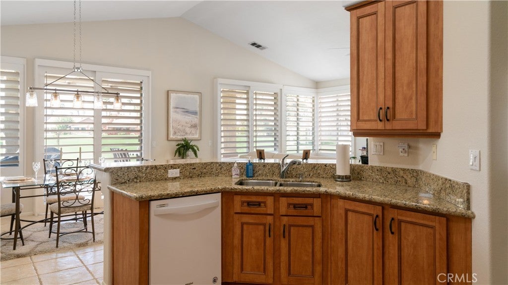 This upgraded and well-maintained home offers 3 bedrooms and 2 bathrooms. The open floor plan and vaulted ceilings in the living room, along with plantation shutters, provide unobstructed views of the golf course and mountains. The kitchen includes ample cabinet space, granite countertops, and appliances such as a dishwasher, gas range, oven, broiler, microwave, refrigerator, and garbage disposal. The master bedroom connects to a bathroom featuring tile finishes, updated step-in tile shower, dual sinks, and walk-in closet. The second bedroom connects to a bathroom with updated step-in tile shower. The third bedroom can also be used as a den or office. Oasis Country Club is a gated community that contains an 18-hole golf course, pools and spas, fitness center, tennis and pickleball courts, and a putting course, all within landscaped grounds This home is being offered fully furnished.