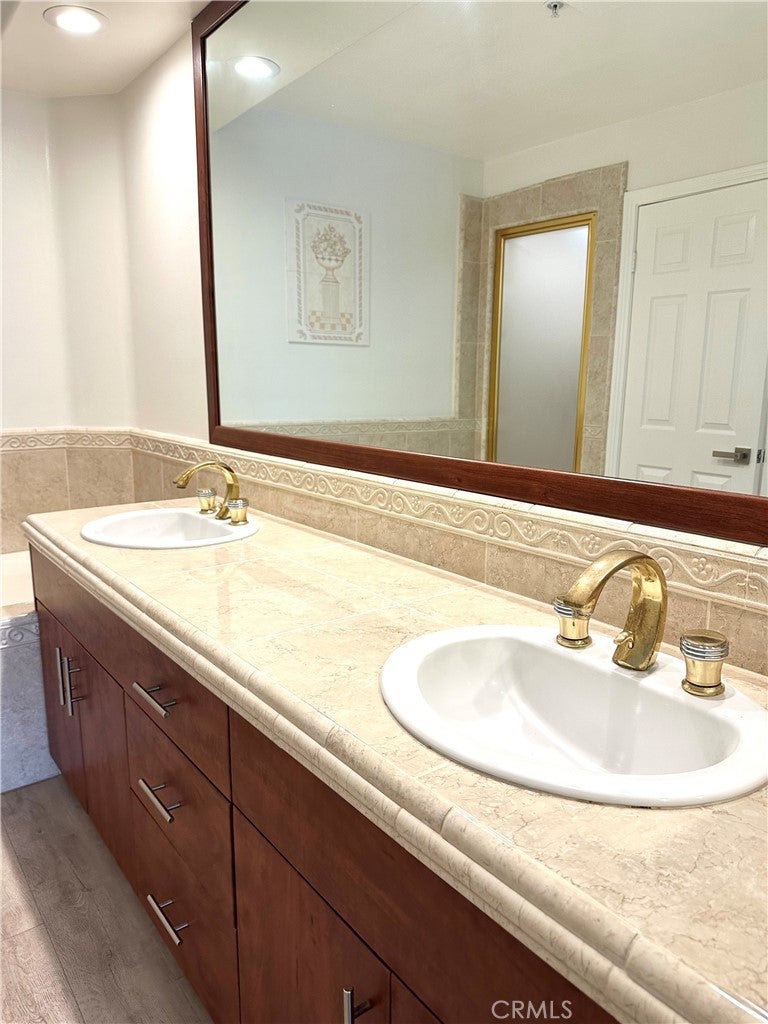 Resort-Style Living at The Metropolitan! Experience luxurious living in this beautifully maintained residence located within the prestigious guard-gated community of The Metropolitan. This popular floor plan features 2 bedrooms, 2 baths, plus a den/office that can easily serve as a third bedroom. The home offers fresh paint, hardwood flooring throughout, 9-foot ceilings, and recessed lighting for a bright, modern feel. The kitchen is equipped with granite countertops and backsplash, custom high-gloss white cabinetry, a double-wide sink with chrome fixtures, and all appliances including a washer and dryer. The den/office includes custom built-ins with a dual workstation—perfect for remote work or study. The primary suite features a dual-sink granite vanity, tumbled marble backsplash, walk-in shower, and soaking tub, while the guest bath offers granite counters and a full-size walk-in shower with seamless glass enclosure. Enjoy resort-style amenities including a sparkling pool, spa, clubhouse, and fitness center, all surrounded by lush tropical landscaping. HOA dues cover gas, water, sewer, and trash, with ample guest parking available. Truly a must-see home in a prime location!