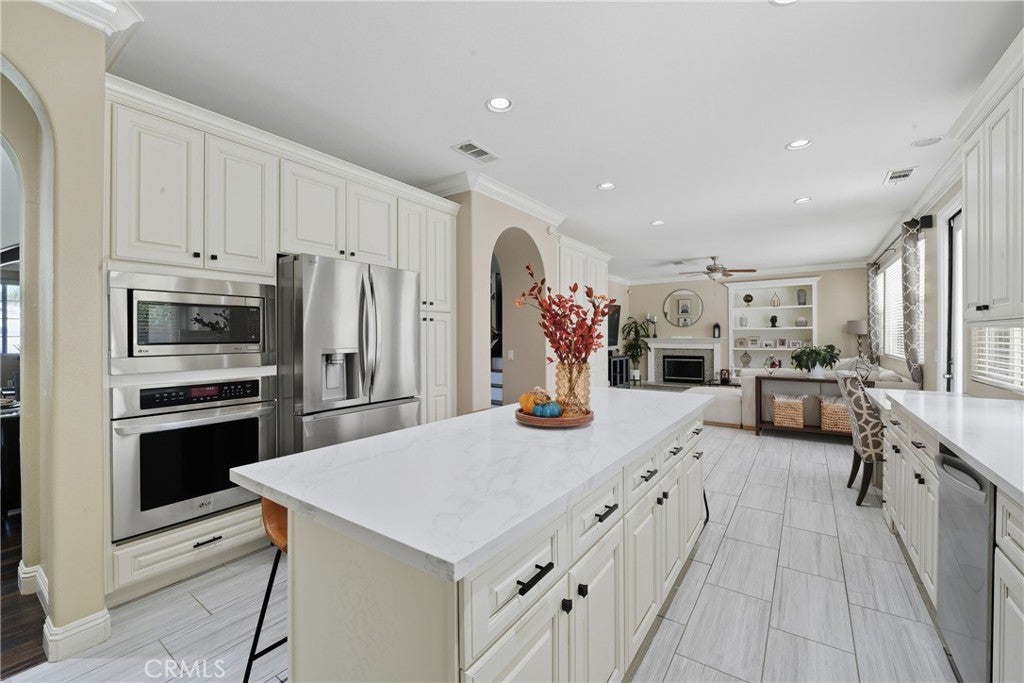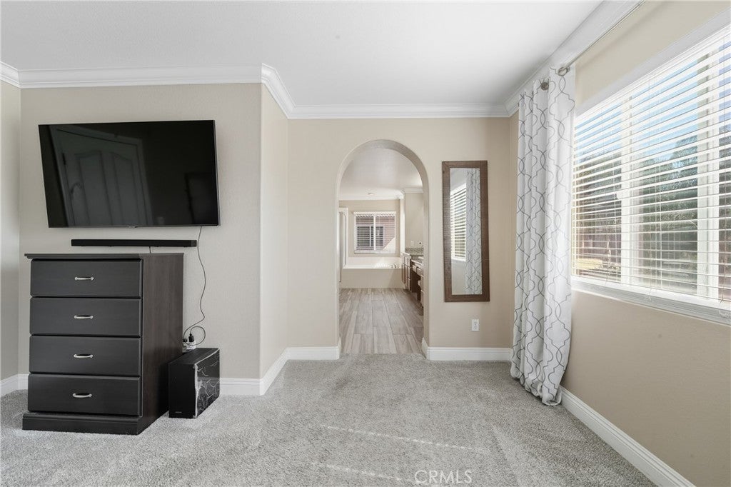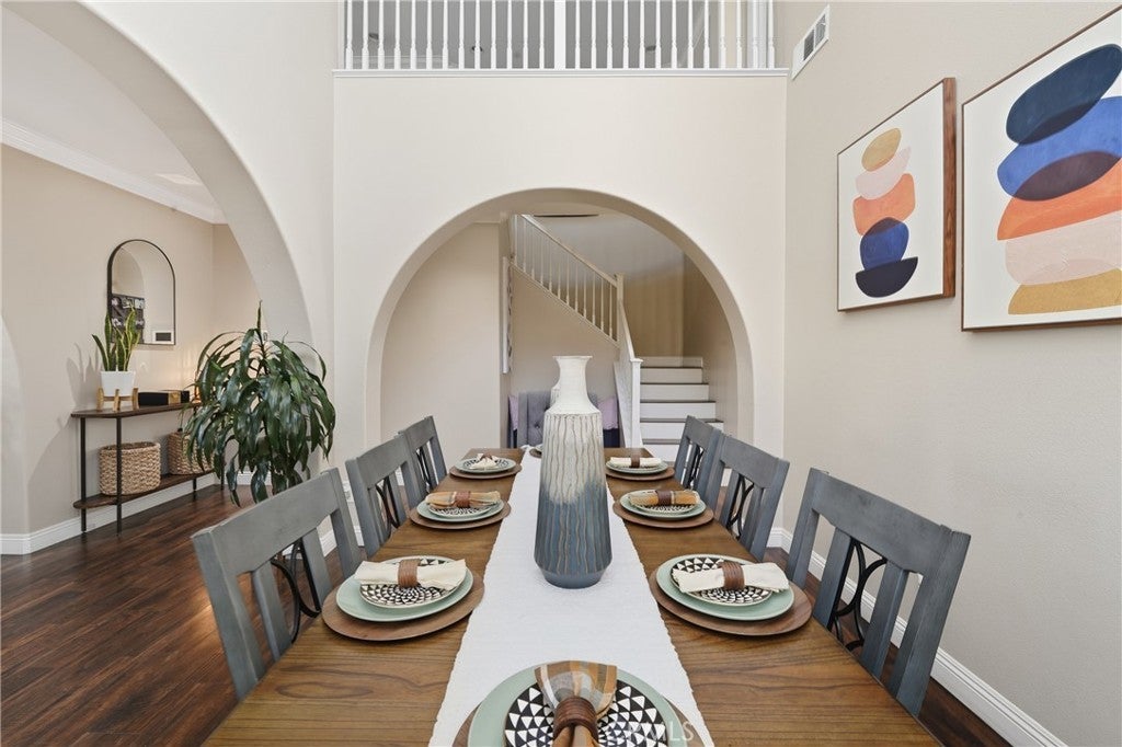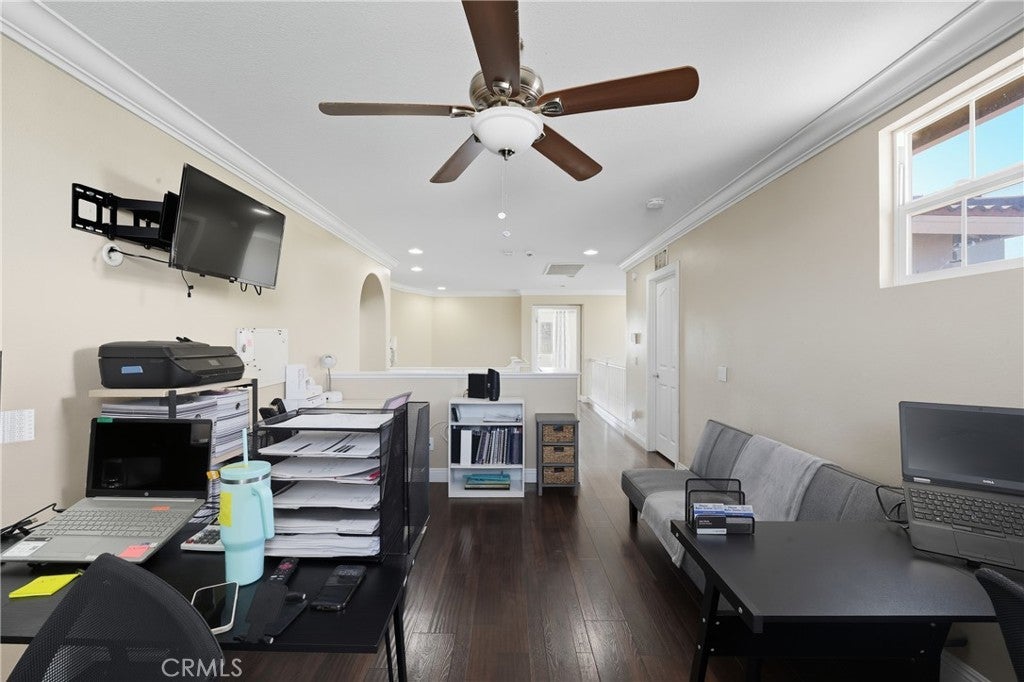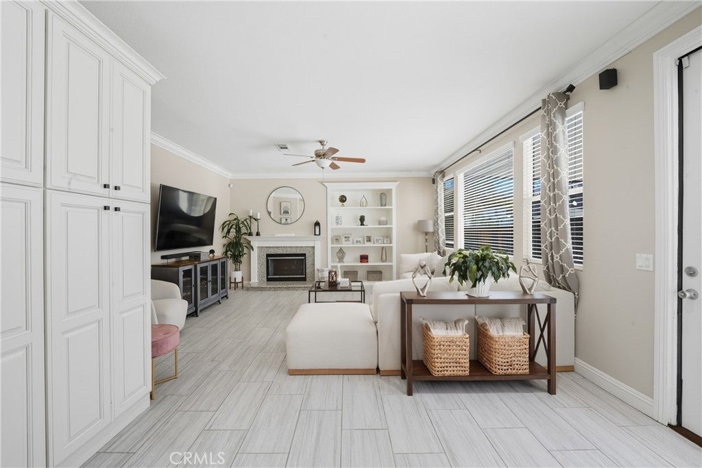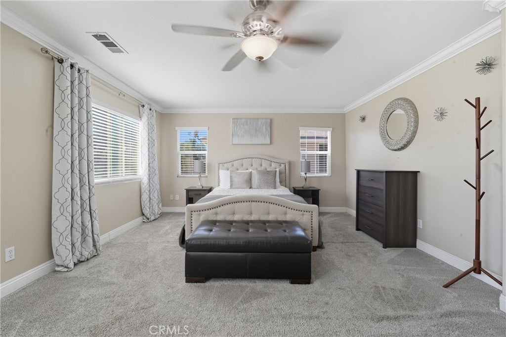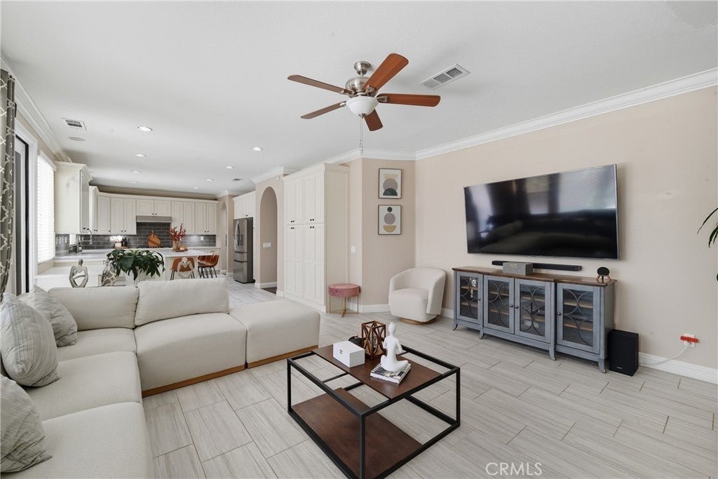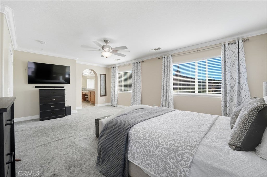 • Interior FeaturesCeiling Fan(s), Crown Molding, Separate/Formal Dining Room, High Ceilings, Open Floorplan, Quartz Counters, Recessed Lighting, Storage, Bedroom on Main Level, Walk-In Closet(s), In-Law Floorplan