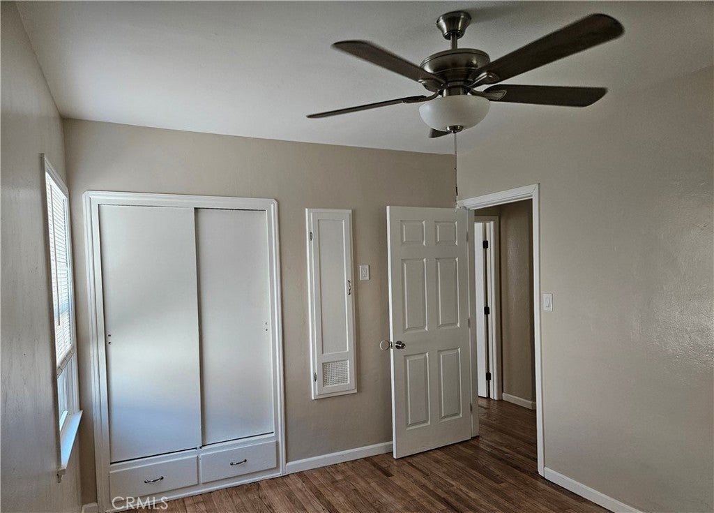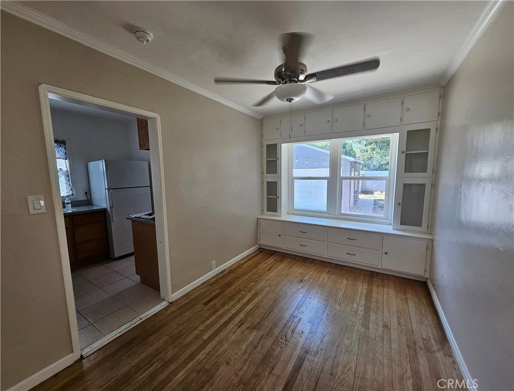 Bright sunny Updated mid century modern home with remodeled kitchen and bath, gleaming hardwood floors and newer stove, range hood , washer and dryer in inside laundry room. Fireplace in the living room, built in cabinets and window seat in the dining room built in closets and drawers in the bedrooms. 2 car detached garage, with long drieway, extra parking space in front and large block wall fenced back yard with huge shade tree. Light neutral interior ready for a new tenant.