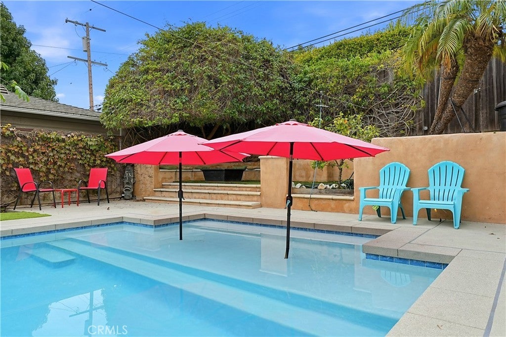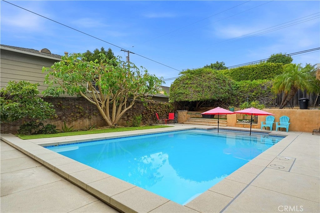 Step inside this stunning Mid-Century Modern retreat in the heart of Belmont Heights! This beautifully designed home blends timeless architecture with effortless California living. The open floor plan offers distinct living, dining, and casual spaces — all centered around a dramatic fireplace and framed by large doors that open to the gorgeous backyard. The outdoor space is pure paradise. Recently remodeled, the sparkling pool features a Baja shelf for lounging in the sun. Surrounded by lush greenery, fruit trees, and a spacious lawn, this resort-style yard also includes a cozy fire pit, a tropical palapa, and multiple areas to relax or entertain — the perfect setting for weekend gatherings or peaceful evenings under the stars. Inside, light pours through oversized windows, highlighting high ceilings and gleaming wood floors. The chef's kitchen features stone counters, stainless appliances and a charming breakfast area overlooking the pool. The main level offers multiple living areas, a generous bedroom with vaulted ceilings and a renovated full bath — ideal for guests, a home office, or multi-generational living. Upstairs, you’ll find three additional bedrooms, including two that share a stylish Jack-and-Jill bath. The primary suite is truly a retreat — spacious enough for a sitting area, also with vaulted ceiling, dramatic windows and featuring a gorgeous updated en suite primary bath with a dual vanity, luxurious walk-in shower and a glimpse of the ocean beyond. The fully finished basement provides even more versatility — great space for an in-home gym, a studio, workshop or playroom — with direct access to the attached two-car garage that offers an additional storage room. Located just a short stroll from local schools, parks, restaurants, and the beach, this exceptional home combines comfort, style, and an unbeatable Belmont Heights lifestyle.