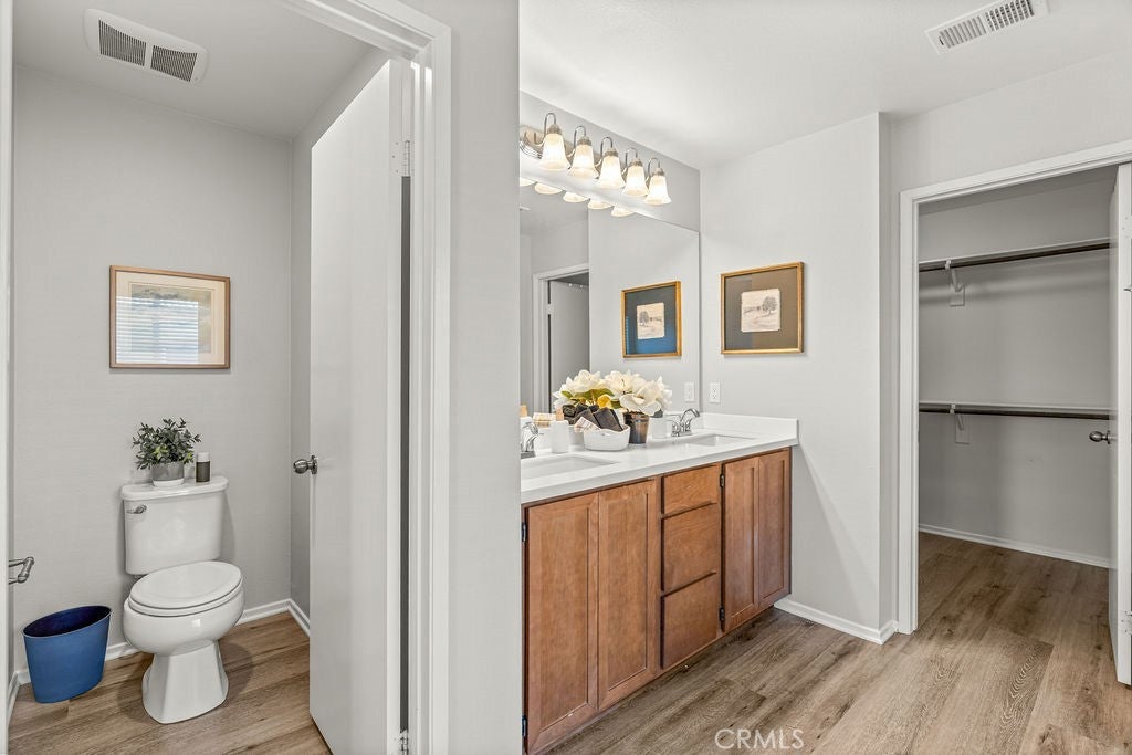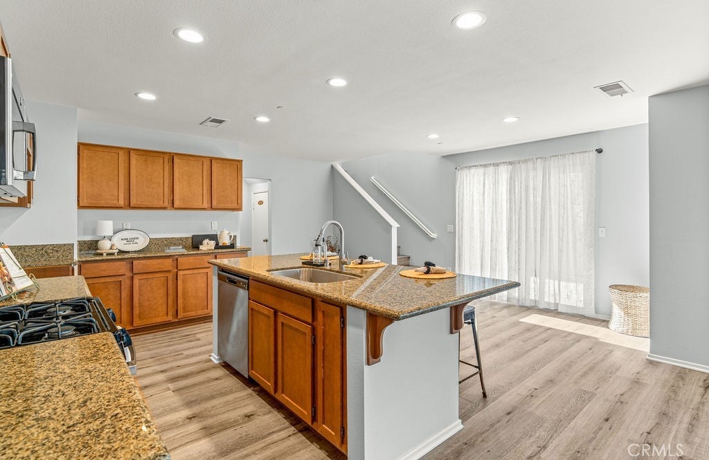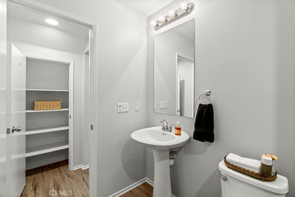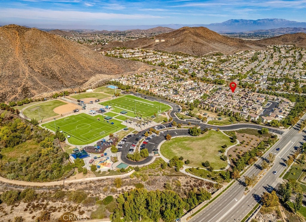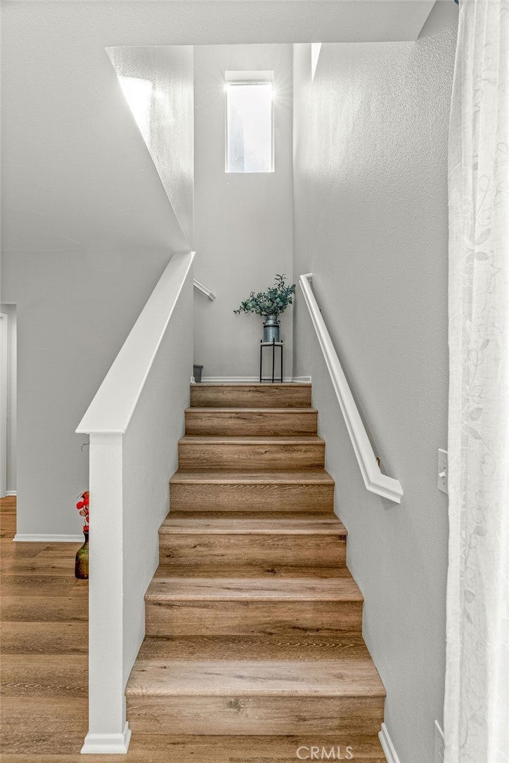 Nestled in the vibrant Canyon Hills neighborhood - presenting 34169 Carissa Dr, a beautifully maintained 3 bedroom, PLUS a downstairs multi-purpose room w/closet, 2.5 bath residence offering a stylish well-appointed floor plan. The open-concept layout is filled with natural light and provides a welcoming atmosphere for daily living or entertaining guests. Beautiful water & scratch proof laminate wood floors have been newly installed throughout the 1st and 2nd floors creating a cohesive modern style. The bright and open kitchen features maple cabinetry, granite counters, a large center island accommodating 4+ bar seating with inset stainless steel farm sink; stainless-steel free-standing stove, microwave, built-in duo trash bins, and a separate pantry. Ideally located on the 1st floor is a multi-purpose room to use as a downstairs bedroom, home office, or family/den space. There is also a 1/2 bath located downstairs. Upstairs are 3 bedrooms. The spacious primary en-suite features dual sinks, tub, walk-in shower & a large walk-in wardrobe. Two add'l bedrooms share a full bath with tub/shower combo. All bedrooms have ceiling fans and ample window exposure. Conveniently located on the 2nd floor is the laundry room. The patio features concrete patio, tropical landscaping, and artificial turf creating a very low-maintenance yard, perfect for families seeking style and convenience. Enjoy a family-friendly setting with access to clubhouse, 3 pools, multiple playgrounds, sports fields, dog parks, walking trails, and a splash pad—ideal for outdoor enthusiasts who appreciate active amenities. With tree-lined streets and top-rated local schools nearby, this home combines comfort, community, and outstanding value and is centrally located between the 15 and 215 freeways for your easy commute. Schedule your private showing to discover what makes this Lake Elsinore gem truly special.
