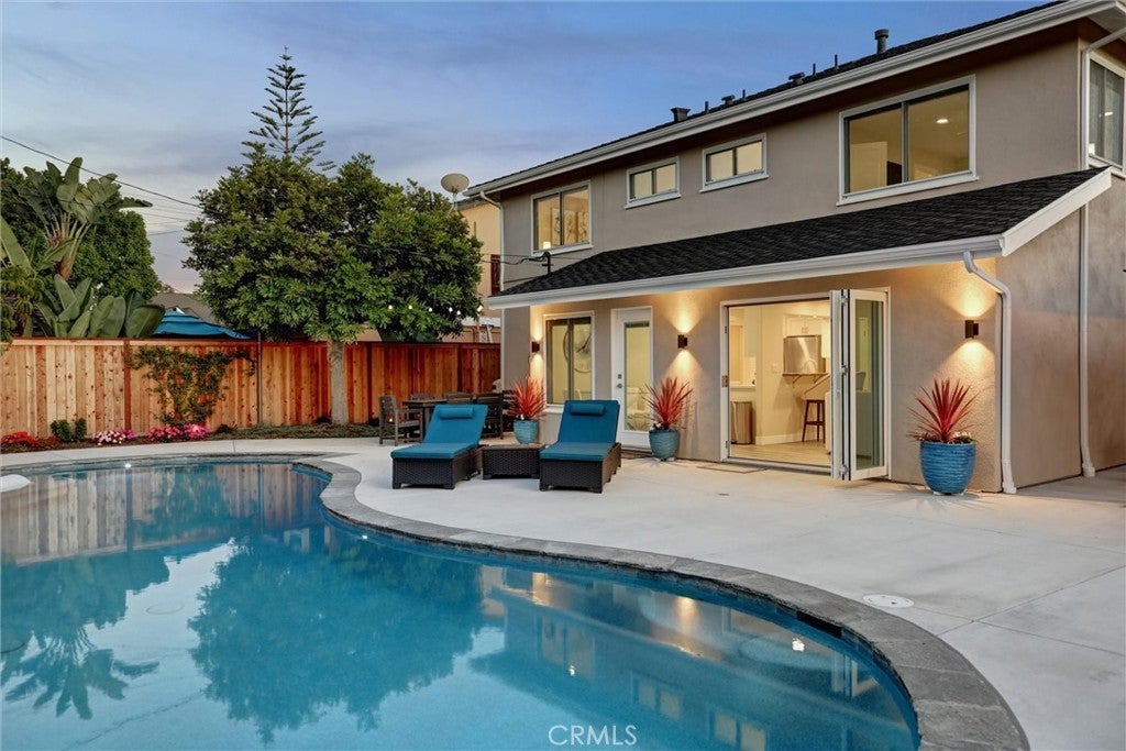 Fully furnished with a renovation that was just completed, includes fresh new paint, luxury vinyl plank flooring, new kitchen and bathroom cabinets and counter tops, new appliances, new doors, new recessed lighting, new roof, new custom window coverings and all new furniture and furnishings. The Kitchen is a home chef's dream all of the kitchen furnishings are included such as dishes, glassware, flatware, cooking tools, cookware, bakeware and more! The Family Room, which is outfitted with a sofa, occasional chairs and a smart TV, is extra special as it extends to indoor outdoor living, with an eight foot three panel folding door which leads to an incredible backyard, featuring a sparkling new pool with two chairs on a baja shelf two chairs, chaise lounges, outdoor dining table for six, fire table with love seats, a pergola with casual seating, a gas BBQ. This place has everything you need for resort style living! The elegant Dining Room includes a table with seating for six, a buffet table and a gorgeous shell chandelier. Perfect for dinners with family and friends. This super comfy Living Room, with plenty of seating, includes a large faux leather sofa, occasional chairs, a Smart TV, dimmable lighting, and a cozy gas log fireplace. It's perfect for relaxing, reading, game night or movie night! On the first floor is a large bedroom with a desk, ceiling fan, wall mounted Smart TV, dressers and closet, and attached full bathroom. Upstairs, you’ll find a large primary bedroom decorated with the most relaxed and calming natural color palette and includes a gorgeous en suite bathroom. There is a large closet with great lighting, custom cabinets, plenty of space for clothes on hangers, mirror, and a vanity. The other bedrooms upstairs each have a ceiling fan, wall mounted Smart TV, a large closet, dressers There is a well-appointed full bathroom with a tub/shower combination in the hallway of the the second floor for easy access from any of the bedrooms. Attached two car garage you will find a full size washer and dryer for your laundry needs. This property includes central heating and AC and is the epitome of modern luxury and comfort, a stunning single family residence that has everything that you need. Discover resort style living in this dream home in Newport Beach! Located in close proximity to many beaches, world-class shopping, dining and entertainment, freeway access and John Wayne airport.