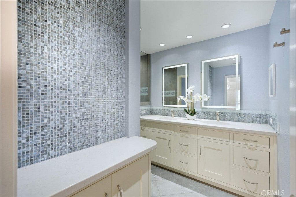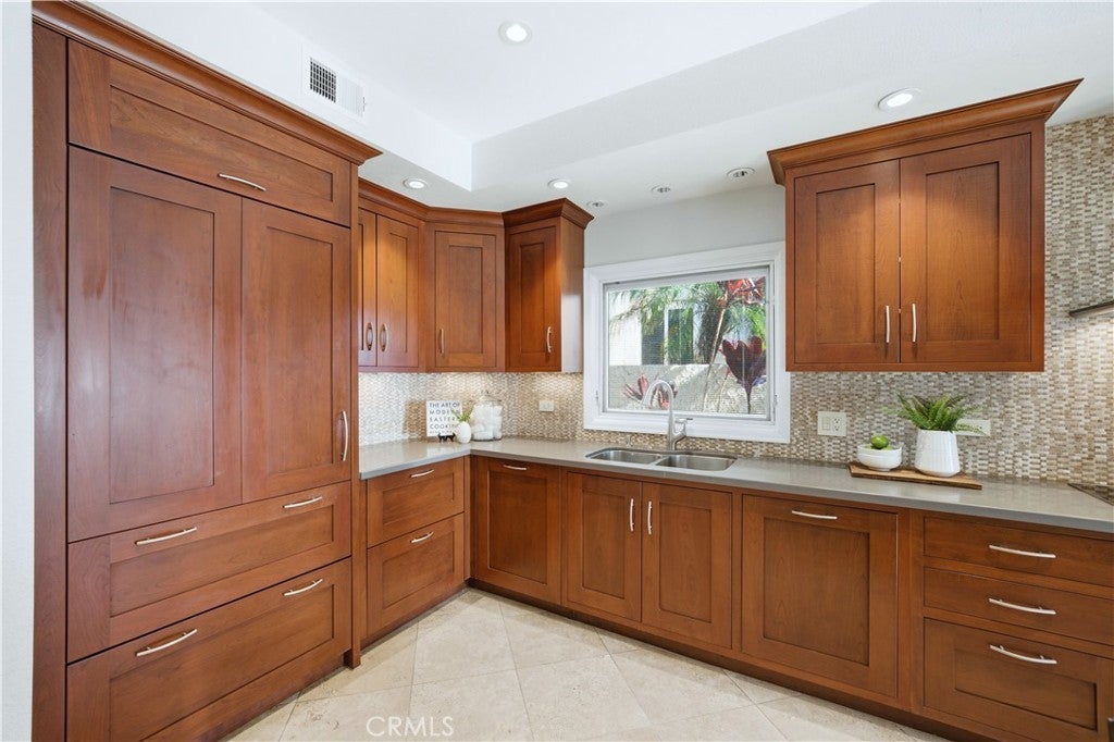 Nestled within the gated Crown Pointe community of Virginia Country Club, this elegant home offers a spacious, light-filled 2,554 sq. ft. floor plan, plus a 129 sq. ft. enclosed sunroom, showcasing custom details throughout. .A winding walkway leads to a dramatic dining area with 25-foot ceilings and skylights, opening to a welcoming living room with custom built-ins that flows into the sunroom. The updated kitchen features high-end Miele, Bosch, and Sub-Zero appliances, a built-in refrigerator, quartz countertops, Travertine flooring, custom wood cabinetry, and a casual eat-in bar.The main-level primary suite opens to the backyard and includes a wall of custom closets and a spa-inspired bath. The enclosed patio/sunroom expands the living area and opens to an expansive backyard with city views, a gas fire pit, and BBQ hookups—ideal for entertaining. Upstairs, two spacious bedrooms with city views share a large bath with dual sinks and a walk-in shower. The oversized family room with adjacent storage is perfect for an office, gym, or media space. .Additional features include an oversized garage with 220V EV charging, a motorized pulley system for bicycles, and low HOA dues .Located near freeways, shopping, dining, golf, and parks with tennis, pickleball, picnic areas, and playgrounds, this home combines luxury, comfort, and convenience in one of Long Beach’s most sought-after gated enclaves.