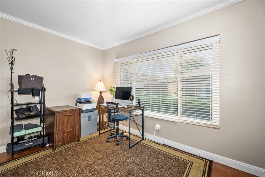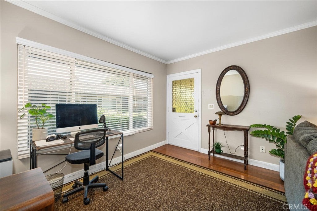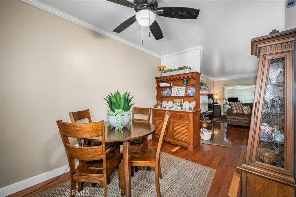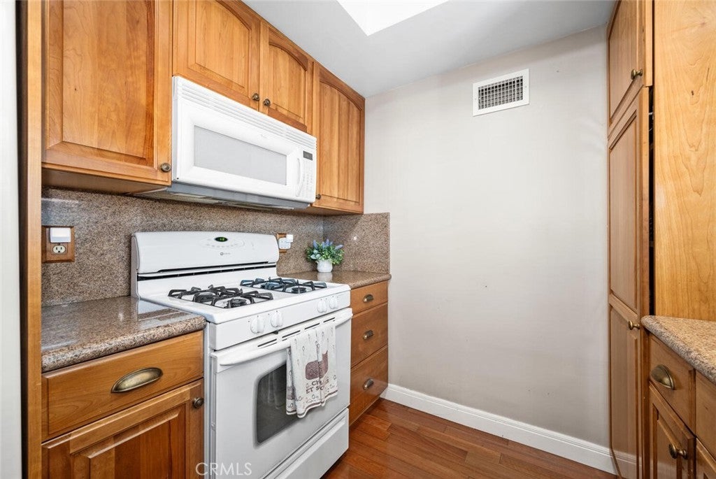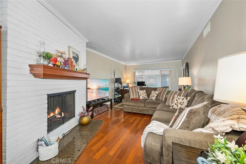 Welcome to the charming community of Tree Haven, where you’ll discover this delightful and truly move-in ready single-level home featuring 1 bedroom and 1 bathroom. Tucked away as a desirable corner unit amidst beautiful Jacaranda and Crepe Myrtle trees, this residence offers both comfort and charm. Step inside to find a spacious living room with hardwood floors and a versatile layout that includes a cozy area perfect for a home office overlooking the lush garden setting. A classic brick, wood-burning fireplace creates a warm focal point for the living space. The updated kitchen features matching white appliances—including a microwave and gas oven—paired with crisp cabinetry and granite counters. Adjacent to the kitchen, the dining area offers generous wall space ideal for a sideboard or additional storage. A sliding glass door leads to your private backyard oasis, complete with a wood-style metal patio cover adorned with a chandelier and surrounded by low-maintenance vinyl fencing—perfect for outdoor entertaining. Down the hall, you’ll find a spacious bedroom with dual mirrored closets, providing excellent storage. The bathroom has been tastefully remodeled with a tiled walk-in shower and a refreshed vanity. Additional highlights include 1 garaged parking space with storage cabinets, central HVAC, in-unit washer and dryer, smooth ceilings, and dual-pane windows throughout. Tree Haven offers beautifully maintained grounds with two pools and two clubhouses for residents to enjoy. Conveniently located in a wonderful part of Tustin, you’ll find restaurants, shopping, and everyday amenities just a short stroll away. This is truly a turnkey home in an exceptional community—ready for you to move in and start living your best life!