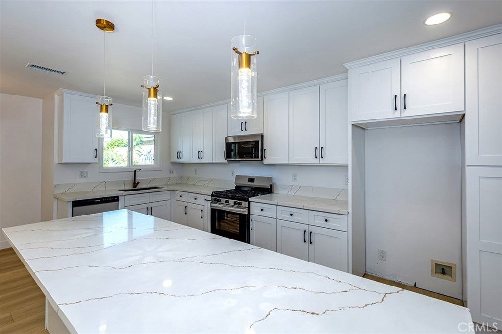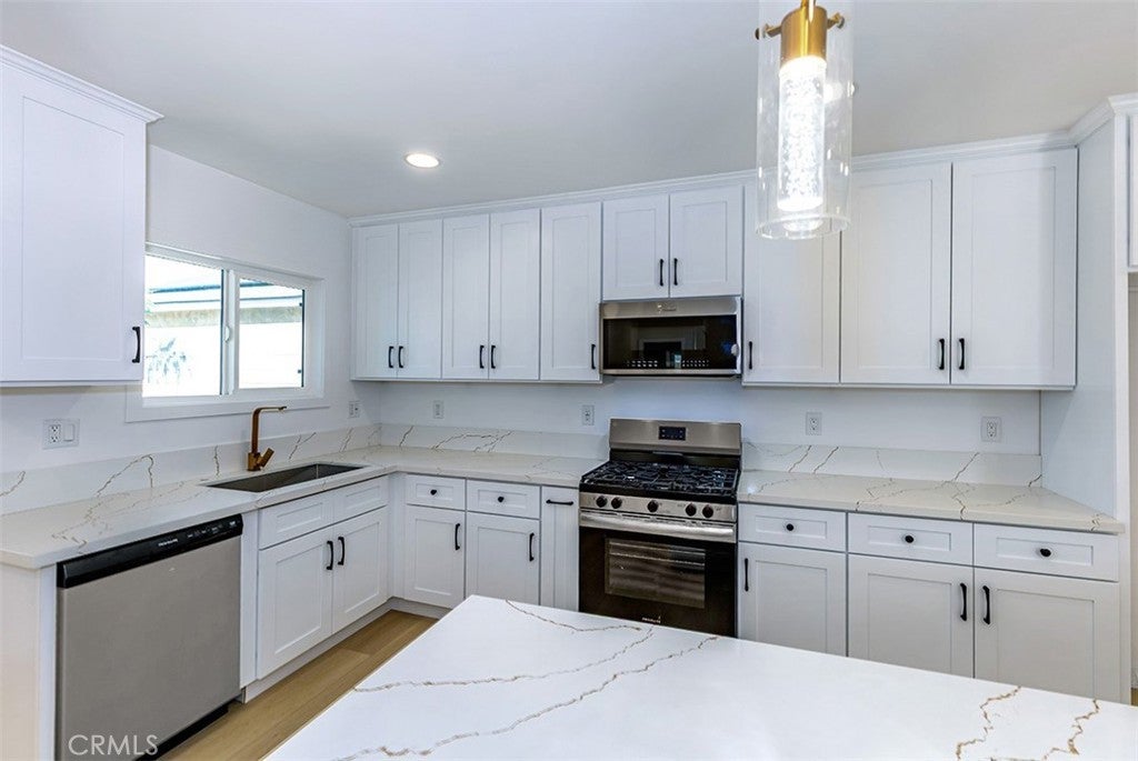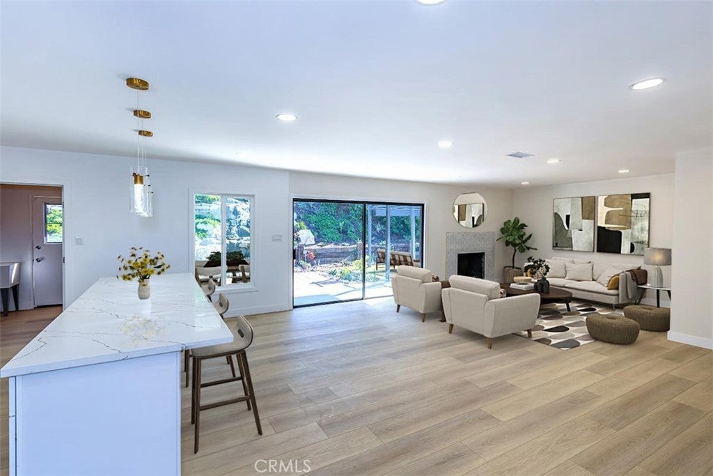 ** SATURDAY 11/15 OPEN HOUSE CANCELLED** Beautifully remodeled La Mirada park home! This stunning residence welcomes you with a completely open floor plan that blends style and functionality. The spacious kitchen is the centerpiece of the home, featuring brand-new shaker cabinets, elegant quartz countertops, stainless steel appliances, and a large island that opens to the living room and offers a perfect view of the tranquil backyard waterfall. Adjacent to the kitchen is a generous laundry room with additional storage and a convenient laundry sink. The inviting living room showcases a beautifully tiled fireplace, recessed lighting, and a seamless layout that flows effortlessly throughout the home. New luxury vinyl plank flooring runs from room to room, enhancing both beauty and durability. Both bathrooms have been tastefully updated with custom tile, modern vanities, and stylish fixtures. Dual-pane windows and a new central heating and air system provide comfort and energy efficiency all year long. Step outside to your own private oasis where a stunning custom rock waterfall creates a peaceful ambiance. The backyard also features a spacious open patio, a brand-new gazebo, and freshly installed turf, making it the ideal space for entertaining or simply relaxing. This La Mirada gem combines modern upgrades, comfort, and a resort-like outdoor retreat. Located near the award winning La Mirada Golf Course and within easy walking distance to La Mirada Reginal Park featuring Splash Water Park, Fishing Lake & Frisbie Golf, Aquatic Center, Community Gym, Library, Athletic Fields & Biola University. You will enjoy both recreational amenities and peace of mind. ** Some pictures have been virtually staged **