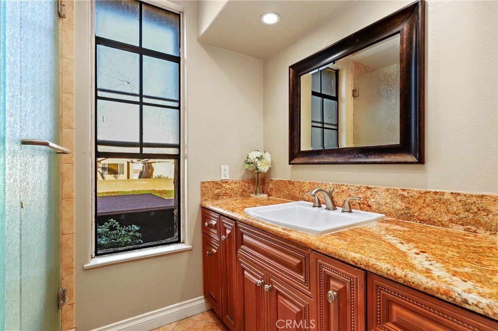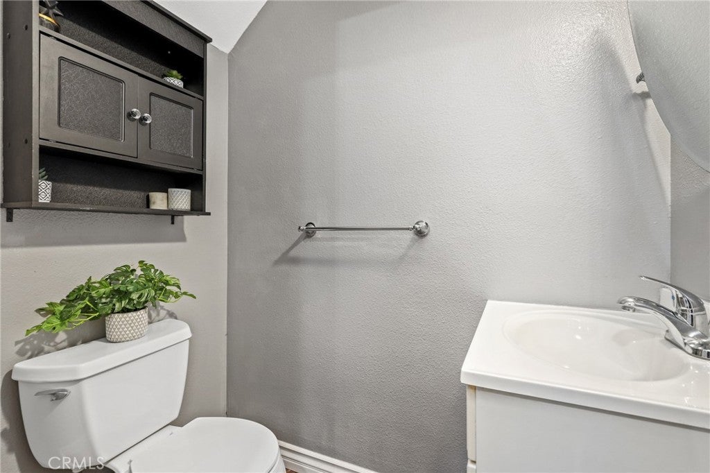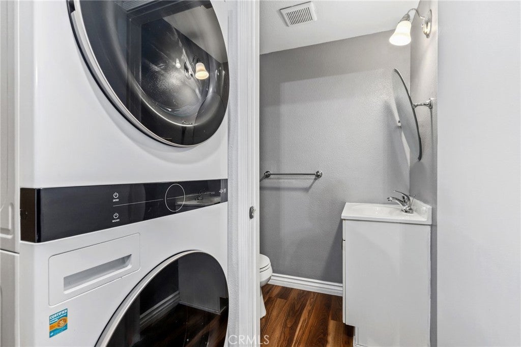 Welcome home to this beautifully maintained, move-in-ready two-story condo located in the desirable Chapman Parke community. Step inside to a light and airy living space featuring a spacious step-down living and dining area with elegant newer laminate wood flooring downstairs and bamboo flooring upstairs. The dining nook is enhanced by a ceiling fan and opens seamlessly to a private patio through a sliding glass door—ideal for outdoor dining or entertaining guests. The kitchen boasts granite countertops, a gas stovetop, newer dishwasher, microwave, new garbage disposal, and an additional sliding door with access to the patio, creating wonderful cross-breeze potential and added outdoor enjoyment. A convenient downstairs bathroom, tankless water heater, and inside laundry area with stackable washer/dryer hookups completes the main level. Upstairs, the primary bedroom offers vaulted ceilings, mirrored closet doors, a ceiling fan, and an en-suite bathroom with a shower. The secondary bedroom also features a ceiling fan, mirrored closet doors, and a charming window with neighborhood views. Both have Ikea closet systems. Plus an additional full hall bathroom. Residents of Chapman Parke enjoy access to community amenities including a refreshing pool and spa. Quick access to the 57 Freeway, local schools, and nearby shopping and dining. HOA dues include water and trash. The unit also comes with one assigned carport space and one additional uncovered parking spot.