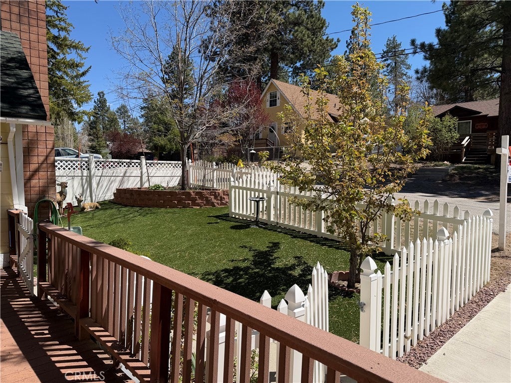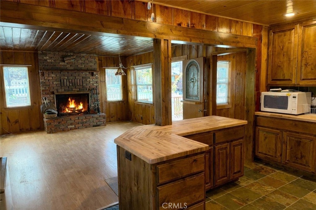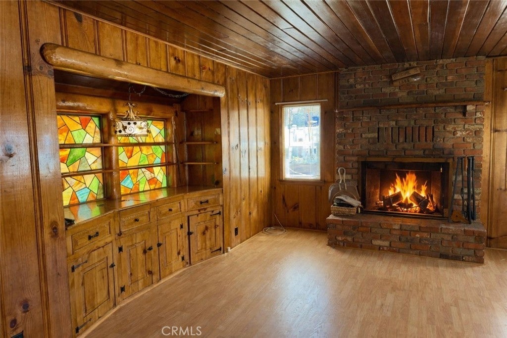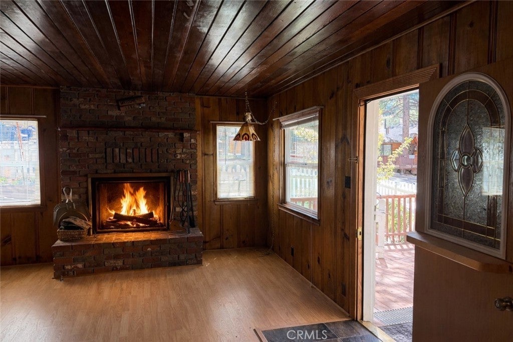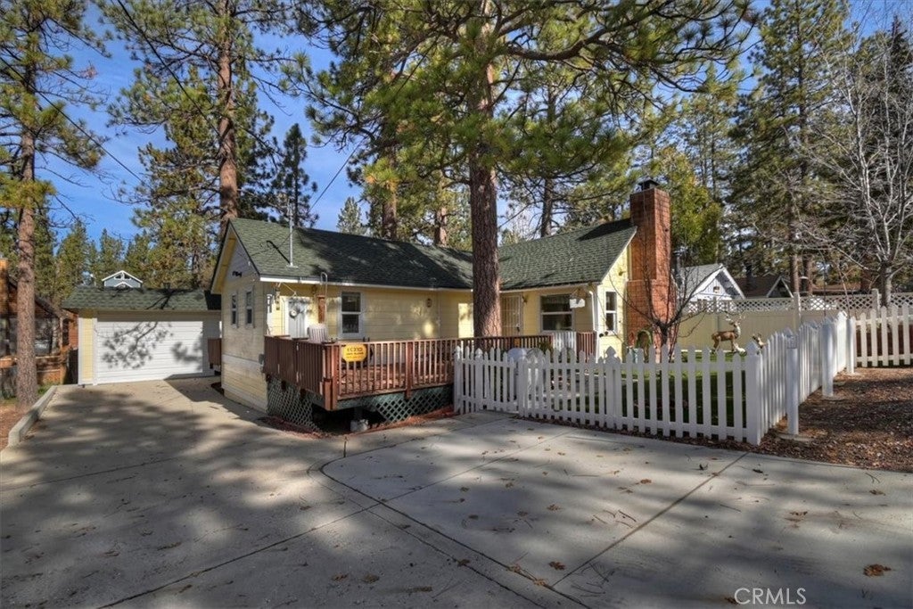 ESCAPE TO THIS CHARMING MOUNTAIN RETREAT IN THE HEART OF BIG BEAR LAKE! Ideally located just minutes from the lake, marinas, the Village, ski resorts, snow play, and all the best Big Bear amenities. Step inside and immediately feel the warmth of the knotty pine tongue-and-groove walls and ceilings, giving the home its timeless rustic charm. This inviting single-story layout offers an open living area anchored by a classic brick fireplace, along with a fully equipped kitchen featuring abundant cabinetry, butcher-block counters, and slate flooring. Two spacious bedrooms and updated slate-floored bathrooms provide comfort and convenience, along with washer/dryer hookups. A two-car detached garage offers even more versatility with its freestanding wood-burning stove and convenient half bath. Enjoy the low-maintenance front yard with white vinyl fencing, synthetic turf, and Trex-style decking—perfect for year-round enjoyment. Southern exposure ensures quick snow melt, and the large driveway provides plenty of off-street parking. A sizable storage shed in the backyard adds even more functionality. Whether you're seeking a full-time home, a weekend escape, or an income-producing investment, this mountain gem is ready to welcome you.