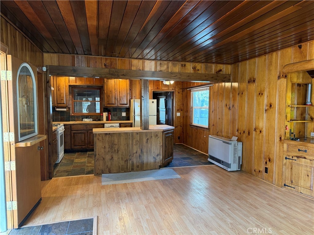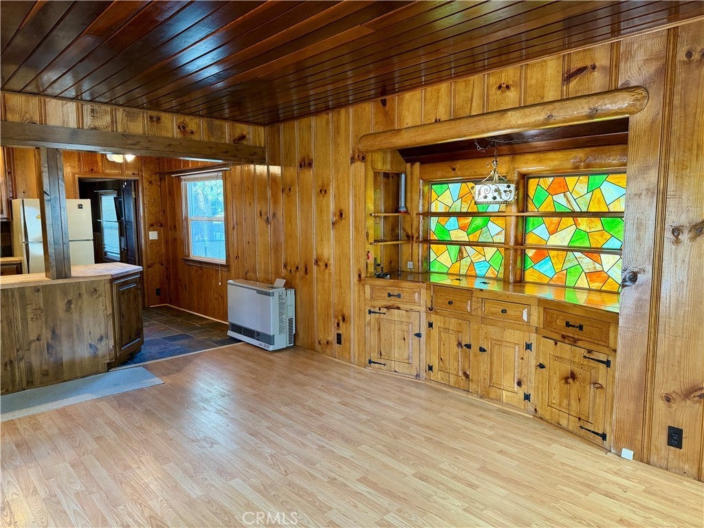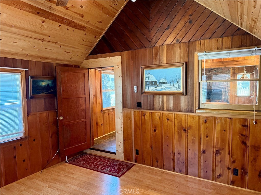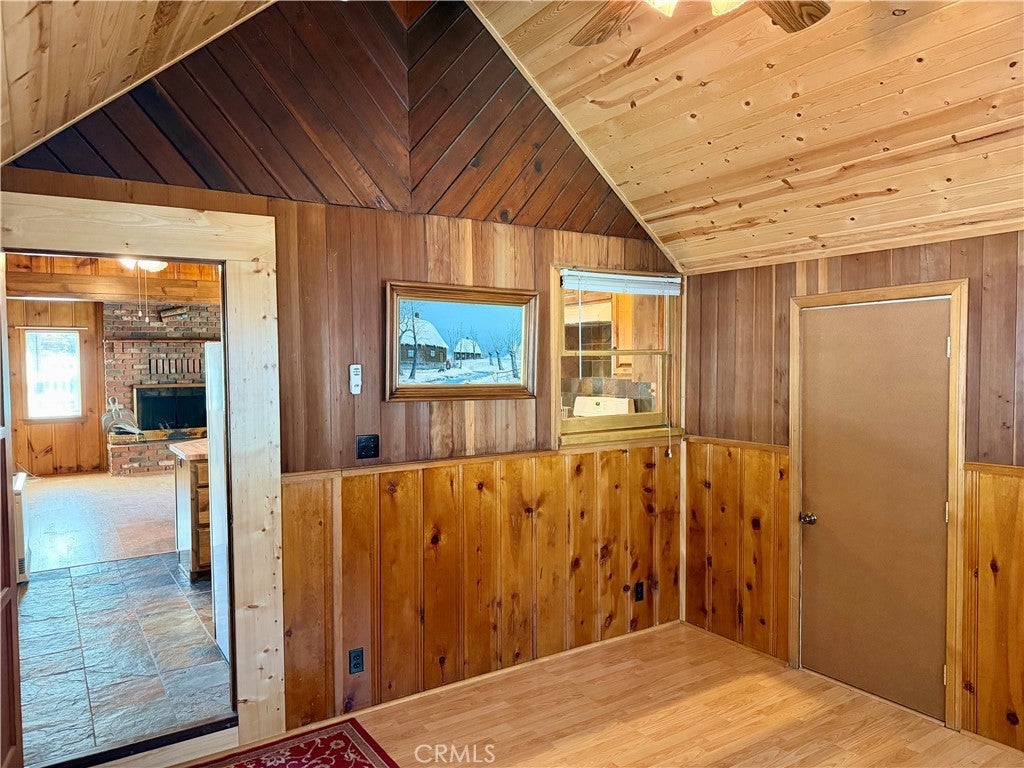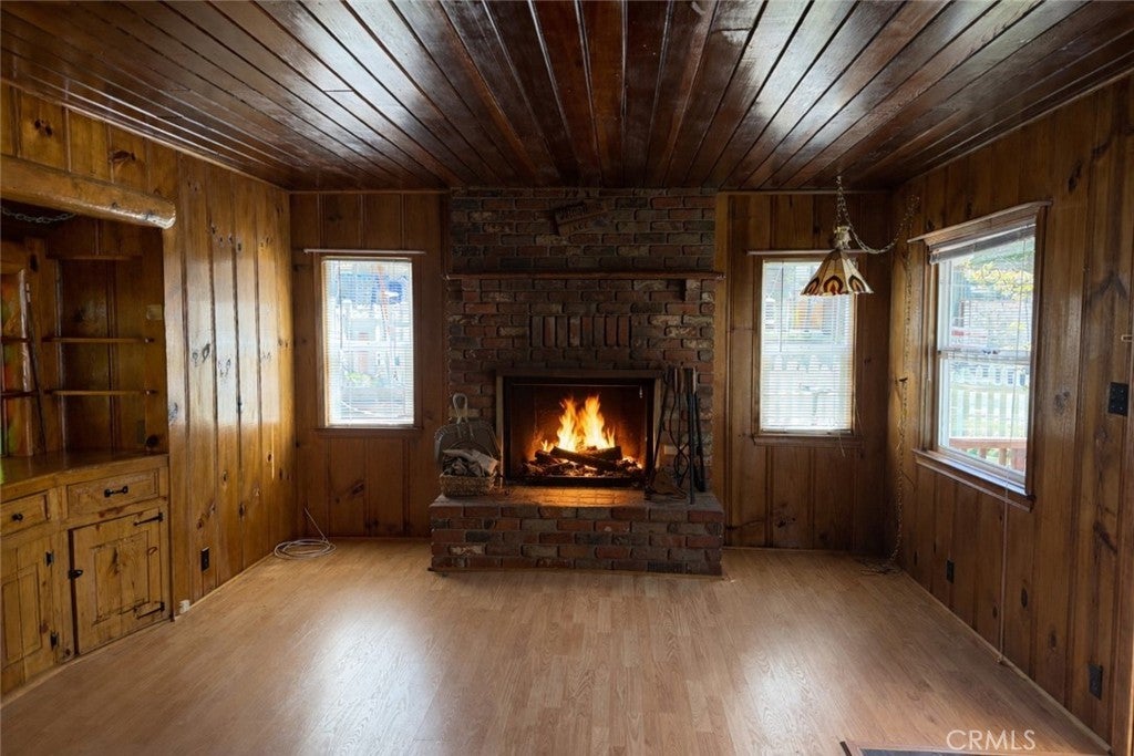 ESCAPE TO THIS CHARMING MOUNTAIN RETREAT IN THE HEART OF BIG BEAR LAKE! Ideally located just minutes from the lake, marinas, the Village, ski resorts, snow play, and all the best Big Bear amenities. Step inside and immediately feel the warmth of the knotty pine tongue-and-groove walls and ceilings, giving the home its timeless rustic charm. This inviting single-story layout offers an open living area anchored by a classic brick fireplace, along with a fully equipped kitchen featuring abundant cabinetry, butcher-block counters, and slate flooring. Two spacious bedrooms and updated slate-floored bathrooms provide comfort and convenience, along with washer/dryer hookups. A two-car detached garage offers even more versatility with its freestanding wood-burning stove and convenient half bath. Enjoy the low-maintenance front yard with white vinyl fencing, synthetic turf, and Trex-style decking—perfect for year-round enjoyment. Southern exposure ensures quick snow melt, and the large driveway provides plenty of off-street parking. A sizable storage shed in the backyard adds even more functionality. Whether you're seeking a full-time home, a weekend escape, or an income-producing investment, this mountain gem is ready to welcome you.