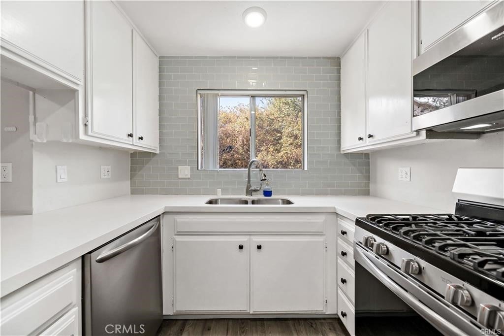Fantastic Opportunity to own this Spacious 2 bedroom condo that is approved for VA loans! Beautifully updated with laminate wood flooring, quartz countertops in kitchen and stainless steel appliances including fridge, gas stove, dishwasher and built in microwave. New fixtures in kitchen and bathrooms and the shower has been recently remodeled. There is a walk out balcony and a privately gated and covered parking area located below this unit with walk in and remote control access. HOA covers water costs. Located within close proximity to freeways!