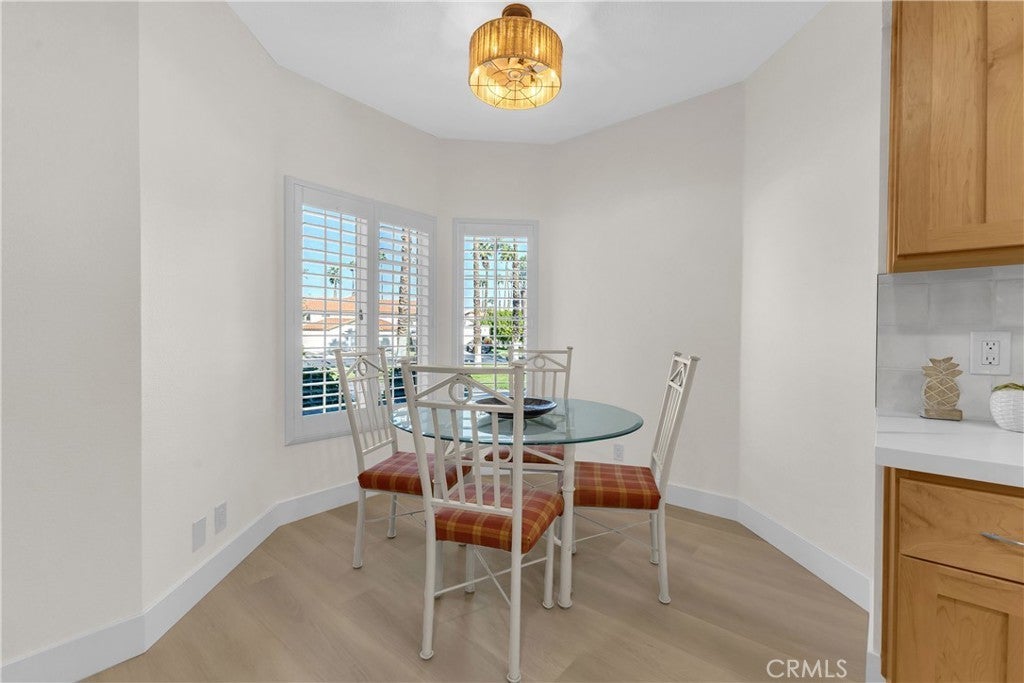 Thoughtfully updated with a modern, open layout, this Desert Falls residence stands apart from many original units in the community. Step into bright desert living, beautifully remodeled and designed for effortless comfort. This stylish 2 bed / 2 bath home in Desert Falls Country Club now features a fresh open-concept layout, upgraded luxury SPC flooring, new baseboards, recessed lighting, updated fixtures, and fresh interior paint throughout. The kitchen serves as a contemporary centerpiece with quartz countertops, a spacious island, modern pendant lighting, and an inviting breakfast area. Plantation shutters throughout add a timeless touch that enhances the clean, modern aesthetic. Both bathrooms have been fully remodeled with elevated finishes. The primary suite offers a spa-inspired retreat with floor-to-ceiling tile, a frameless glass walk-in shower with bench seating, a dual-sink vanity, and sleek matte-black hardware. The guest bathroom mirrors the same sophisticated design for a cohesive, modern feel. The living room features a stylish brick fireplace with a wood mantel and custom shelving niche, opening to a peaceful patio with tranquil greenbelt views—perfect for morning coffee or evening relaxation. Located near one of the beautifully maintained pool areas, this home also enjoys all the resort-style amenities Desert Falls Country Club is known for, including a renowned semi-private golf course, pools, tennis and pickleball courts, a fitness center, and scenic walkways. All in a prime Palm Desert location close to dining, shopping, and world-class attractions. Elegant, modern, and thoughtfully upgraded—this turnkey Desert Falls residence is ready to enjoy from day one.