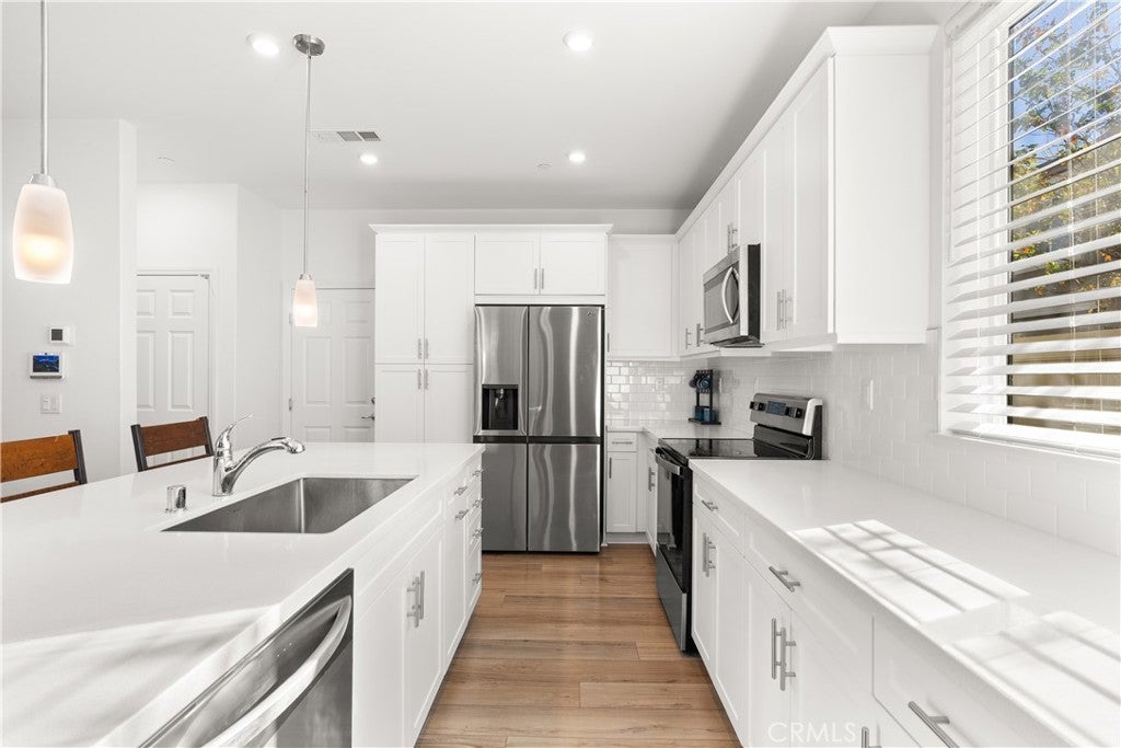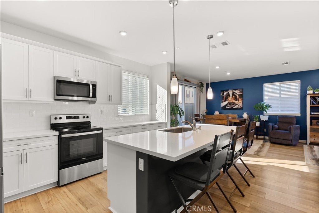 Enjoy the perfect blend of modern style and effortless living in this stunning corner-lot home. Completed in 2022, this property is beautifully contemporary and move-in ready. The main level features an open concept layout designed for gathering, with a seamless flow between the kitchen, living room, and dining area. The gourmet kitchen serves as the heart of the home with sleek quartz countertops, stainless steel appliances, and designer cabinetry. Pull up a chair at the large island for casual bites and conversation or transition through the sliding glass doors for easy outdoor access to the patio and fenced backyard featuring drought-resistant grass. Head upstairs to find three comfortable bedrooms and a convenient laundry room nearby. The primary suite is a true retreat with an oversized walk-in closet and private en-suite bath, while the secondary bedrooms share a Jack-and-Jill bathroom. The spacious two-bay garage offers plenty of storage and comes equipped with a Tesla car charger. This community focuses on an active lifestyle with the neighborhood tot lot, dog park, and BBQ area all a short stroll away. The perfect place to start your next chapter!