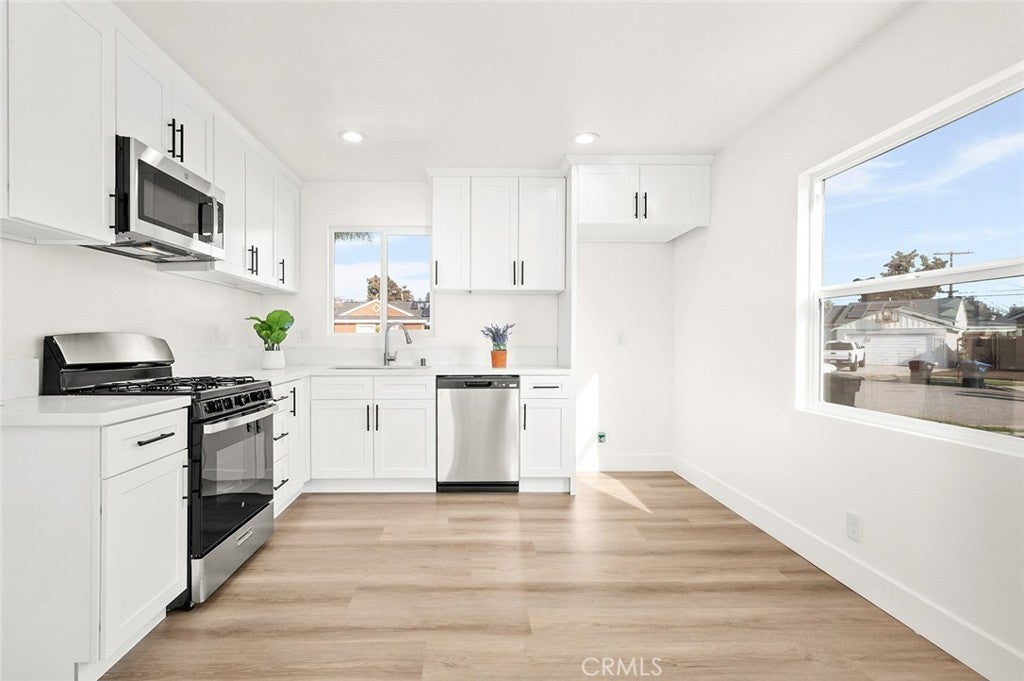 Beautifully and fully remodeled home featuring a brand-new driveway, fresh interior and exterior paint, and new vinyl flooring throughout. The home boasts a completely remodeled kitchen with elegant quartz countertops and brand-new stainless-steel appliances. 2 Detached car garage Additional upgrades include new garage door, all-new interior and exterior doors and windows, updated bathrooms, and new mirrored closet doors. Enjoy a huge, private backyard and a long driveway, perfect for multiple vehicles. Tucked away on a quiet cul-de-sac street, this property offers privacy and convenience, just minutes from Cerritos College , major freeways, schools, shopping centers, and parks.