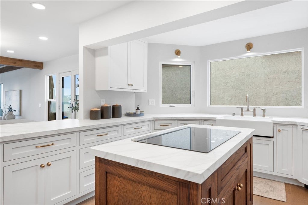 Showcasing ocean and mountain views in the highly sought-after Mariners Point community of Southeast San Clemente, this stunning fully remodeled coastal residence offers designer finishes and a layout designed around the views. From the moment you step inside, the home is intentionally oriented to maximize light and indoor-outdoor flow—framing Catalina sunsets and ocean breezes. VAULTED CEILINGS in every bedroom and living room create volume, light, and architectural drama. New bespoke cabinetry spans the kitchen, closets, bathrooms, and laundry area, blending warm white oak elements with a crisp contemporary aesthetic. The chef’s kitchen features a custom-stained oak island with floating shelves, cabinetry painted in Benjamin Moore Dove White, a Sydney Harbour plaster backsplash in the color Rubble, and a full suite of MONOGRAM luxury appliances including a fully integrated French-door bottom freezer refrigerator, induction cooktop, and built-in double oven. KD Arabescatto White Satin countertops continue through the kitchen and bathrooms for a cohesive elevated finish. New Vandyck Progettista hardwood floors run through the main living spaces, enhancing the modern coastal flow and open-concept design. Wide bifold doors connect the main living areas to the outdoors, creating a seamless transition for entertaining and view enjoyment. Lighting has been curated throughout, including custom kitchen sconces by MikeLightingStudio (Etsy), dining lighting from Lulu and Georgia, statement staircase alabaster chandeliers from Arhaus, plus hand-painted beams with custom finishes from Vista Paints and track lighting in the living room and study. Each bathroom has been reimagined with designer tile selections including Celine, Sahara White, Shoji White, and honed basketweave detailing for a spa-inspired feel; the primary bath features a 66” freestanding solid surface stone resin tub, Delta Cassidy Champagne Bronze faucets, and premium lighting from Rejuvenation. Exterior upgrades include smooth Glacier White stucco, a steel garage door by Unique Garage Doors, new front entry hardware, and exterior fixtures from Troy Lighting, plus a newly paved and landscaped courtyard, custom decking, glass railings for unobstructed sightlines, and exterior deck/courtyard lighting that brings the outdoor experience to life at night. A rare opportunity to own a magazine-worthy coastal retreat with ocean views in one of San Clemente’s most coveted coastal enclaves.
