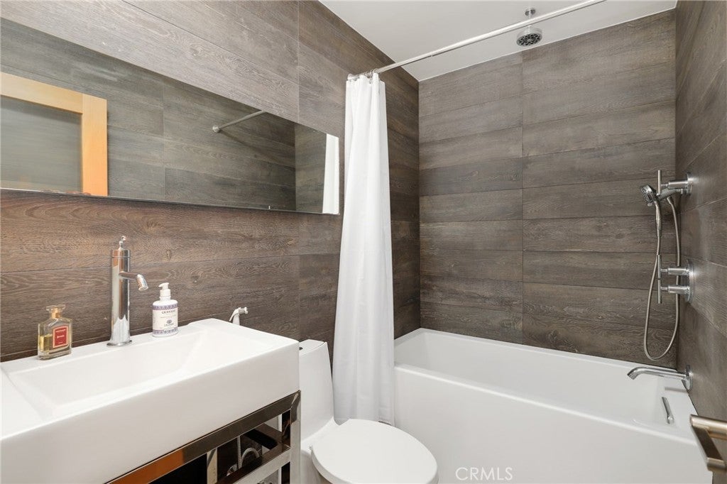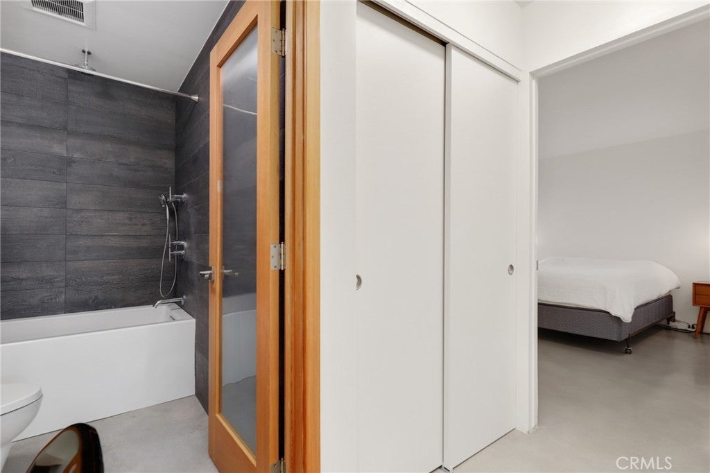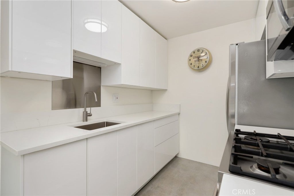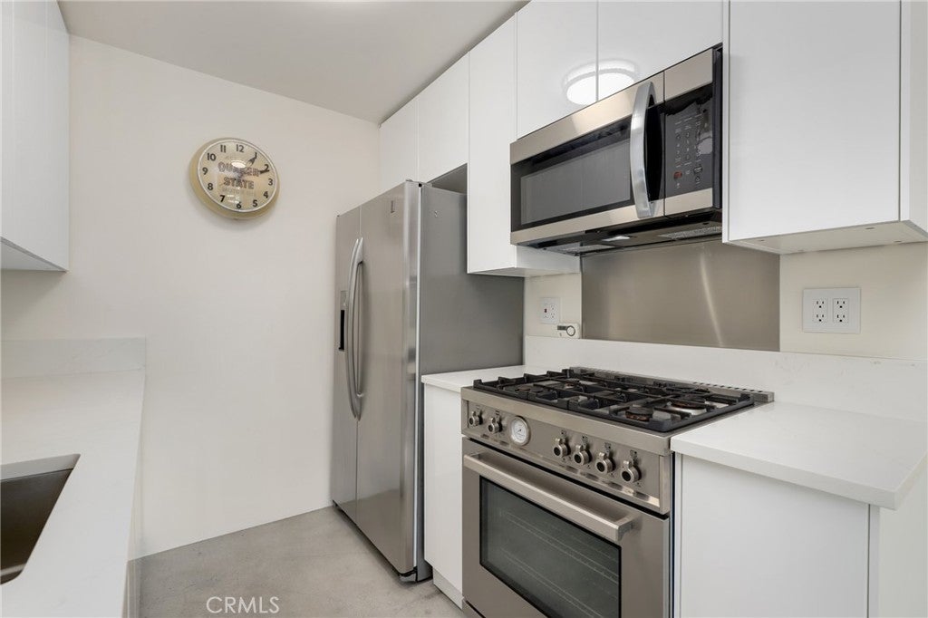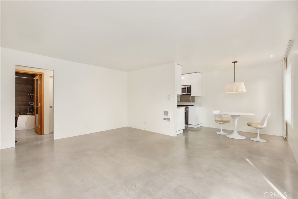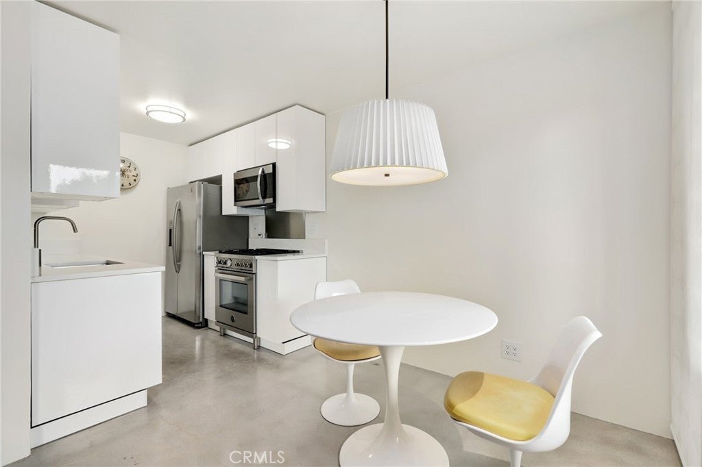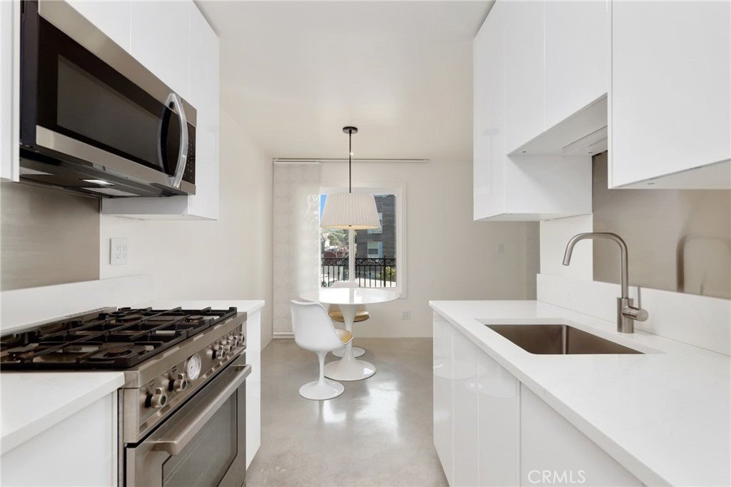 Welcome to this beautifully remodeled one bedroom, one bath condo at 1125 Pico Blvd 109, where thoughtful upgrades and clean modern design come together in an unbeatable Santa Monica location. Fully insulated walls enhance both energy efficiency and sound reduction, while newer vinyl windows and a newer vinyl sliding glass door invite natural light into the open living space and lead to an oversized balcony overlooking Pico Boulevard with a peek a boo ocean view framed by palm trees. Polished concrete floors create a sleek contemporary feel that is stylish, durable, and easy to maintain. The remodeled kitchen offers modern cabinetry and stainless steel appliances including a Bertazzoni Professional Series gas range, microwave hood combo, and refrigerator, all flowing seamlessly into the dining area where the Saarinen table, iconic Tulip chairs, and a Rejuvenation light fixture are included in the sale, creating a designer finished space that is ready to enjoy. The spacious living room opens directly to the balcony, providing the perfect setting for morning coffee, evening drinks, or relaxed people watching. Just down the hall is a flexible workstation that has been approved by the HOA for conversion to a stackable in unit washer and dryer, and for those who prefer not to install laundry, the community laundry room is conveniently located immediately adjacent to the unit and accessible without climbing any stairs. The full bathroom is beautifully appointed with Kohler fixtures and a deep 60 gallon soaking tub and shower combo enhanced by a ceiling mounted rain style shower head. Storage is generous with a hallway closet and a walk in closet in the private bedroom tucked at the end of the hall. Step free access from the gated ramped entrance on charming 12th Street leads directly to the unit without a single stair. Additional highlights include one dedicated underground parking space and a private lockable storage area nearby. Located less than a mile from the beach and just moments from parks, schools, restaurants, and shops, this home offers an exceptional opportunity to enjoy the best of Santa Monica living in a highly desirable coastal community.