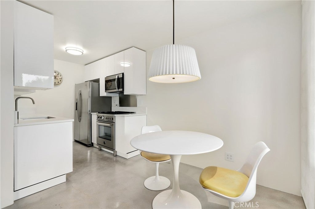 Welcome to this beautifully updated 1 bedroom 1 bath condo at 1125 Pico Blvd 109 offering modern comfort, thoughtful upgrades, and an ideal Santa Monica lifestyle. This residence has been completely remodeled with fully insulated walls for improved energy efficiency and sound reduction, newer vinyl windows, and a newer vinyl sliding glass door that fills the home with natural light and opens to the oversized balcony. Polished concrete floors deliver a clean, contemporary look that is both stylish and easy to maintain. The remodeled kitchen features modern cabinetry and stainless steel appliances including a Bertazzoni Professional series gas range, microwave hood combo, and refrigerator, and flows seamlessly into the dining area where the Saarinen table and iconic Tulip chairs are included in the sale, complemented by a Rejuvenation light fixture that beautifully anchors the space. The spacious living room opens directly to the balcony facing Pico Boulevard with a peek-a-boo ocean view through the palm trees, creating the perfect spot to enjoy morning coffee, evening drinks, or relaxed people watching. A short hallway leads to a flexible work-station that can be converted to a stackable in unit washer and dryer, recently approved by the HOA, and for those who choose not to install in unit laundry, the community laundry room is conveniently located immediately adjacent to the unit and is accessible without climbing any stairs. The luxurious full bathroom is appointed with Kohler fixtures and a deep 60 gallon soaking tub and shower combo highlighted by a ceiling mounted rain style shower head. Storage is abundant with a hallway closet and a walk-in closet in the bedroom, which is tucked privately at the end of the hall. The unit offers step free access with a gated ramped entrance from quaint 12th Street that leads directly to the condo without climbing a single stair. Additional features include one dedicated underground parking space and a private lockable storage area nearby. Located less than a mile from the beach and just a short stroll to restaurants, parks, schools, and shops, this home delivers the best of Santa Monica living while offering outstanding value in a highly desirable coastal community.