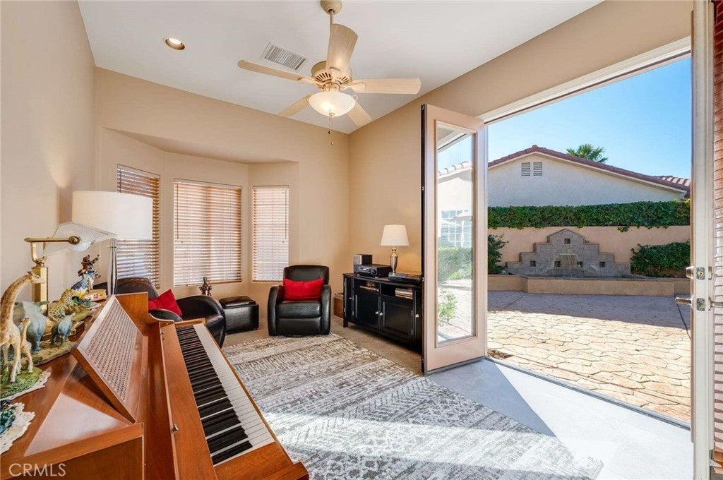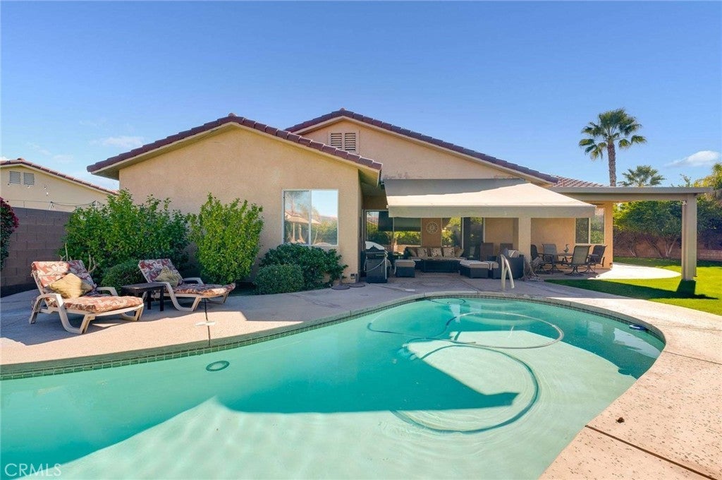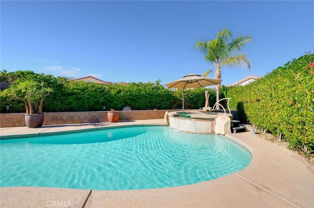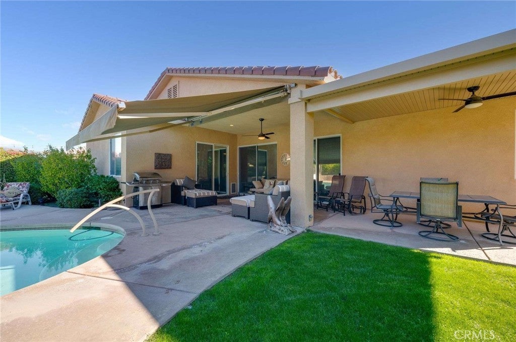 Cathedral City sits in the heart of the Coachella Valley, bordered by Palm Springs to the west and Rancho Mirage to the east — making it an integral part of the Palm Springs metro resort corridor. Tucked away on a quiet cul-de-sac is this exceptional home, set on a premium, oversized lot with beautiful mountain views and a backyard designed for true desert living and entertaining. From the moment you arrive, a fenced front courtyard welcomes you with a charming fountain—an ideal, private space for morning coffee or a safe retreat for pups. Inside, the home offers tall ceilings, abundant natural light, and thoughtful architectural details throughout, including plantation shutters, custom built-ins, and a cozy fireplace. The gourmet kitchen is the heart of the home, featuring quartz countertops, glossy white cabinetry, a generous center island, double ovens, a warming drawer, recessed lighting, and under-cabinet lighting. Adjacent is a formal dining room complete with a built-in buffet. The spacious primary suite offers a huge walk-in closet and a spa-inspired bathroom with a soaking tub. A flexible fourth bedroom or casita opens directly to the courtyard, making it perfect for guests, a home office, or multi-generational living. An inside laundry room adds everyday convenience. Step outside to a resort-style backyard made for entertaining, featuring a sparkling pool and spa, a grassy area with citrus trees, a large covered patio, and a retractable awning that extends the outdoor living space—ideal for sunset gatherings with mountain views as your backdrop. A tile roof completes this well-appointed desert home. Easily accessible to Palm Springs airport, Cimarron Golf Resort, and the ten freeway. This home delivers the lifestyle buyers dream of in the Coachella Valley. With its oversized lot, mountain views, and seamless indoor-outdoor flow, this property should be experienced in person. Enjoy the freedom of no association dues and owned solar.