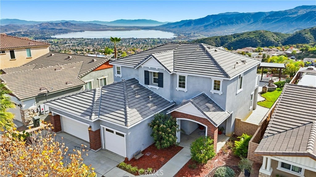 VIEW! VIEW! VIEW! Stunning panoramic views of the lake, city lights, sunrise, sunset, and majestic mountains--you can even see the sun rising above the clouds, hanging over the lake and moonlight shining on the lake! One of the NEWEST homes built in Shore Point HOA, improved with paid solar panels, fire sprinklers, & 9' high ceilings which homes of old phrases do not have. This impressive view home offers 4 bedrooms, 3 baths, plus a loft and a 3 car attached garage. Upon entering, your heart will be lifted up by the light pouring all over the very open living room and family room. The numerous windows allow you to see the gorgeous setting this home offers--from the endless green mountain range to the breathtaking Lake Elsinore! Opening to the breakfast nook and the family room, the gourmet kitchen boasts a huge central island with bar sitting, exotic granite countertops, upgraded nook base cabinets, and stainless steel appliances, including a GE profile stove with 4 burners, a griddle & a warming drawer. Three out of the four bedrooms enjoy amazing views. The primary suite features a view deck and an ensuite bath with a separate shower and tub, dual sinks, and a huge walk-in closet. Need an office, media room, or a work-out gym? The multi-use loft upstairs is ideal for these uses. The 3rd bathroom with a tub is conveniently located next to the kitchen and the individual laundry room. Tile flooring downstairs & in all wet areas. Spacious 3 car garage with epoxy flooring--turning one garage space into a bedroom downstairs was an option the builder offered originally. A fully useable oversized yard is professionally landscaped, including sophisticated hardscape, artificial turf, a rose bed, multiple planters with landscape lights, a handsome lamp post, a covered patio with lights and a ceiling fan, and a view gazebo. Drought tolerant plants and fruit trees--no more lawn to mow. A community park and a hiking trail are within walking distance. Easy access to Ortega Highway, leading to S. Orange county. Paid solar panels. Low property tax--no Mello Roos. A short drive to McVicker Canyon Park, one of the City’s premier recreational destinations, featuring a skate park, two large softball/baseball fields, open play fields, a tot lot, a dog play area, etc. First time on market! Incredible opportunity to own a true view home on a pool sized lot! Don't miss out!