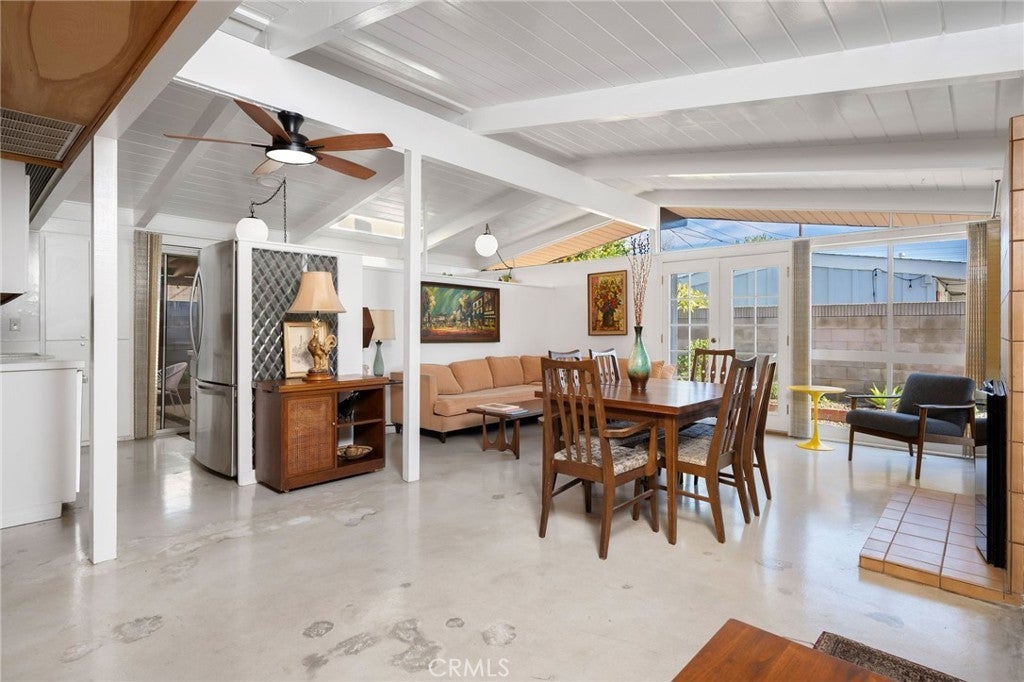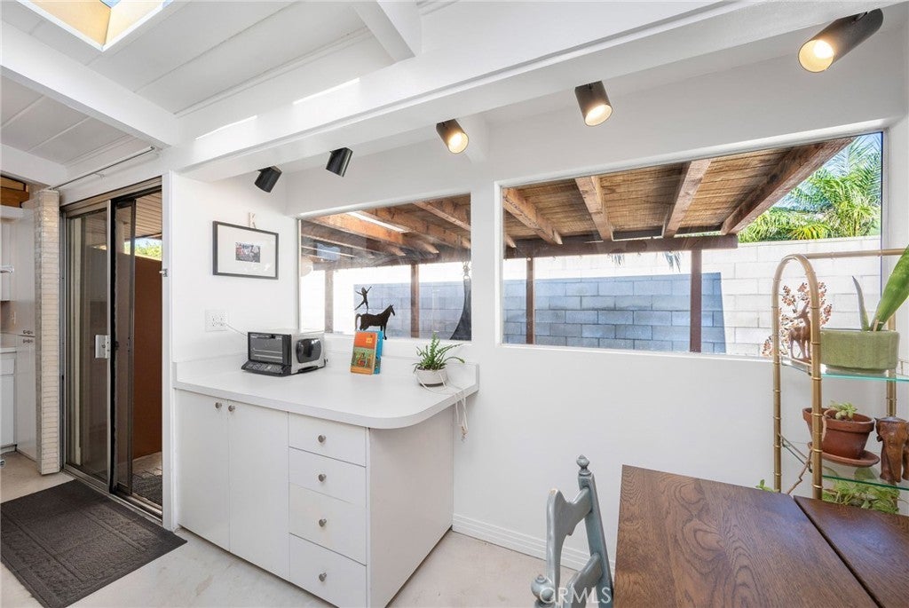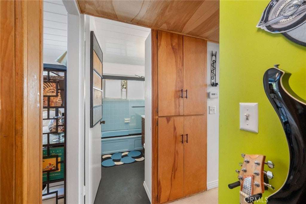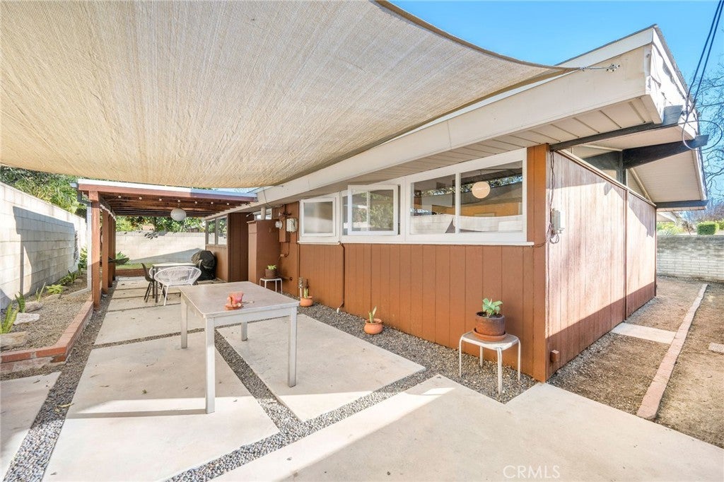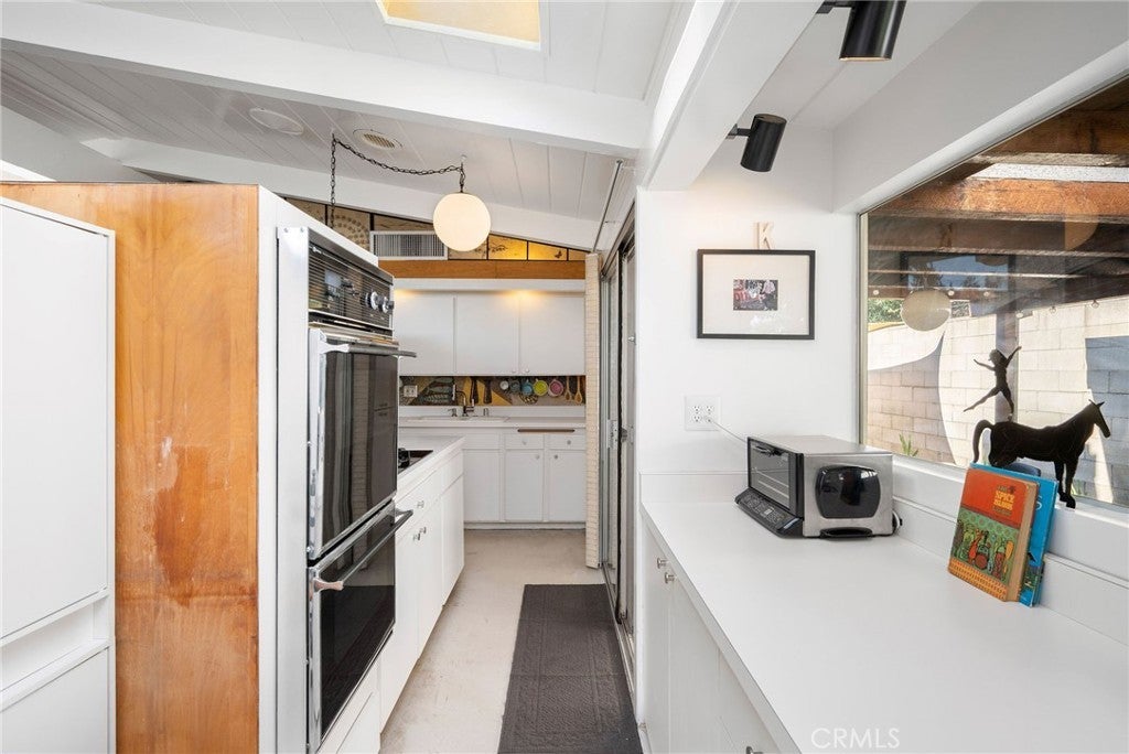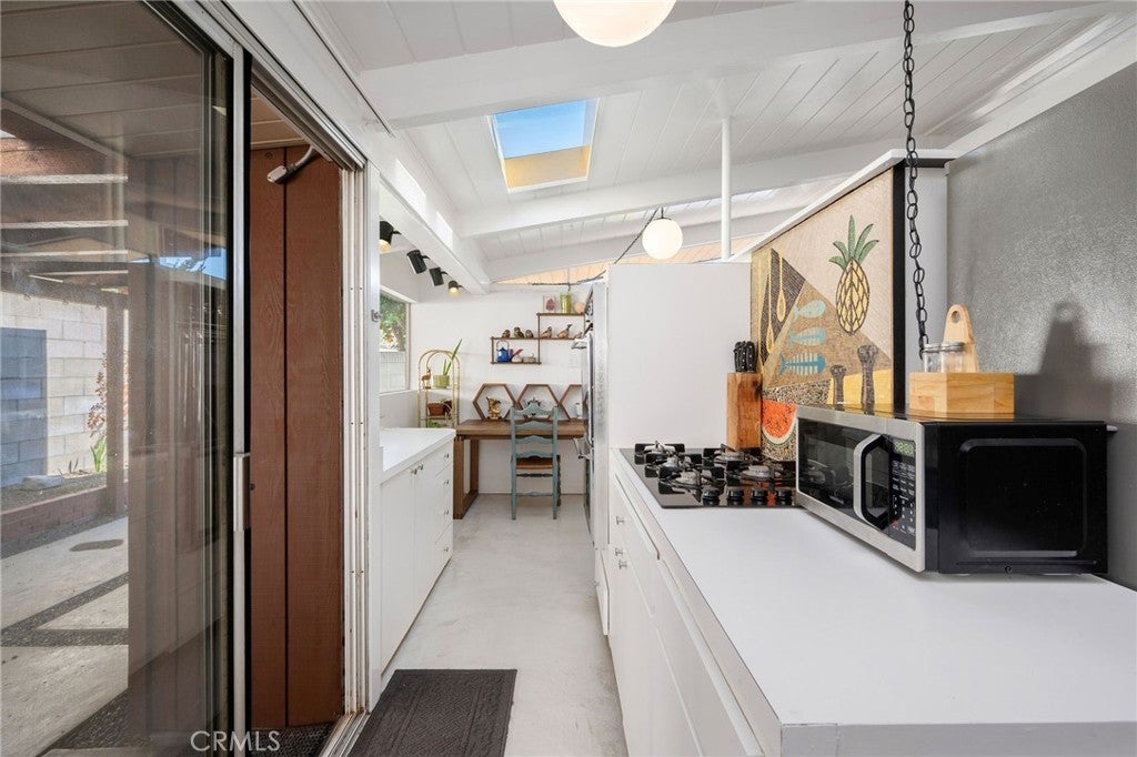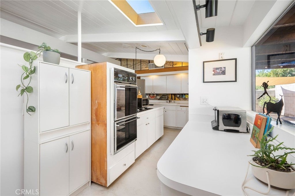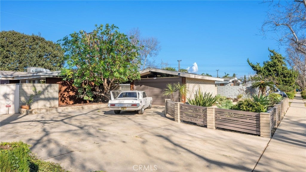 Welcome to 7147 Metz, a custom tailored Cliff May Rancho with subtle nods to mid-century tradition, blended effortlessly with personal touches throughout the decades. Making your way down the ideal tree lined street, turning into the 3 car driveway, it would be easy to think that past the mature kept landscaping, the detached two car garage and just inside the privacy gate lies just another Rancho... Once you make it into the private courtyard, the intrigue only builds. The details start to pop, the custom mid-century front doors and original Cliff May Corner give subtle hints as to what's ahead. Making your way inside, you're led in by polished concrete flooring and personally tailored touches that have been preserved since owners prior. The rare, pearlescent floor to ceiling blinds, the perfect use of the original pony wall, the perfectly preserved birch and of course, the trademark celestial natural light from above. Heading toward the kitchen, You'll notice the first of two skylights shining into the kitchen with added and much needed bumped out space, handmade tile mosaics which have been meticulously preserved from a previous owner as well as hanging lights to tie it all together. Heading to the guest bedrooms, the first hall bathroom maintains the original blue tub, in pristine condition, with tile and finishes to match the motif. The original Jack & Jill bedrooms have been rebuilt by hand with custom partitions between them. As you head toward the primary ensuite, the original closets have been restored inside with birch trim to match... Another custom handmade detail... Once you enter the primary, you'll notice the orientation gives way to ample natural light, paired perfectly with the primary bathrooms skylight, original pink tub and luxury amenities. After you've had a chance to take in the details inside, you may wonder, what else is there to know? For starters, the new 50 year roof put on in 2023 will help put your mind at ease, along with new interior and exterior paint throughout. A whole house water filtration is always a nice touch and to make things more convenient, the garage (also with 2 additional skylights) has its own hot water heater for laundry. With ideal outdoor spaces for entertaining and privacy alike, parking and storage, this is one of the coolest and complete Cliff May Ranchos you may see this year.
