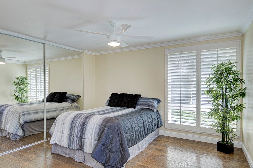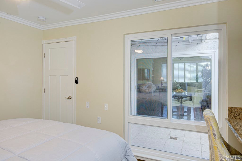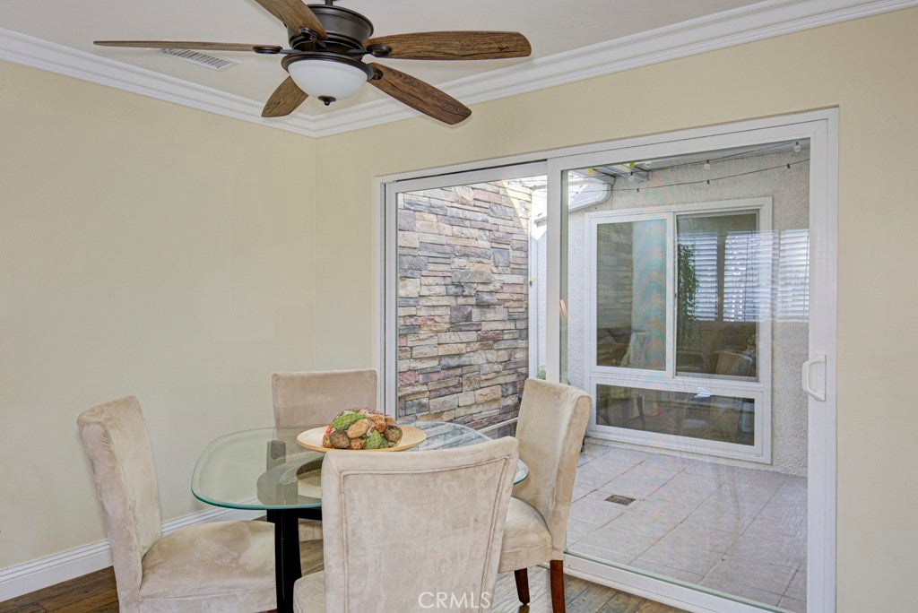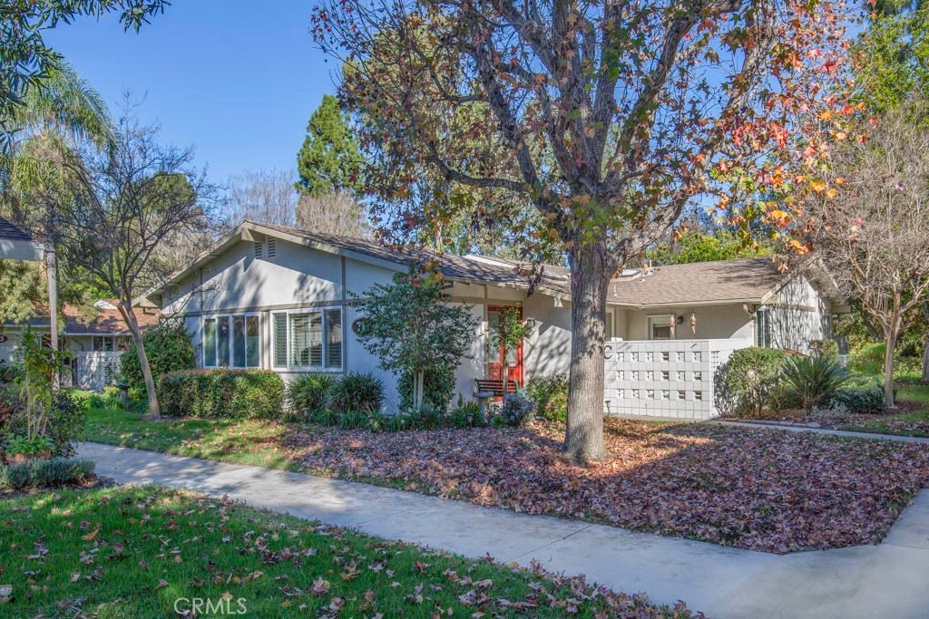 Charming cottage-style home with beautiful double leaded-glass entry doors. Light-filled living room features vaulted ceilings, plantation shutters, and a built-in electric fireplace with TV. Dining area overlooks a private atrium with stacked stone accent wall, offering peaceful breezes and indoor-outdoor living. Spacious storage closet near entry adds exceptional functionality. Updated kitchen is bright and inviting with skylight, recessed lighting, granite countertops, custom white Shaker cabinetry, stainless steel appliances, tile backsplash, and abundant storage including carousel cabinets and counter seating. Guest bedroom includes mirrored closet doors and a built-in desk overlooking the atrium. Guest bath offers custom cabinetry and a step-in tiled shower. Primary suite features floor-to-ceiling windows with plantation shutters, large mirrored closet, patio access, and ensuite bath with dual sinks and step-in shower with glass block wall. Enjoy a slate patio, serene greenbelt setting, mature trees, and charming curb appeal. Monthly HOA of $826.78 affords you the use of all the amenities that make Laguna Woods Village one of the most sought-after senior communities. Enjoy 5 swimming pools, 7 clubhouses, 3 gyms, craft studios, 2 gorgeous golf courses (27 hole & 9-hole par 3), over 250 social clubs, performing arts theater, tennis courts, equestrian trails, stable, fare free bus service, golf cart paths, manned security gates, lawn bowling, bocce ball, pickle ball & much more.