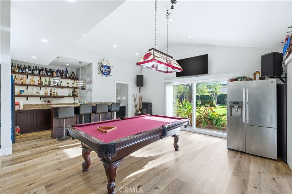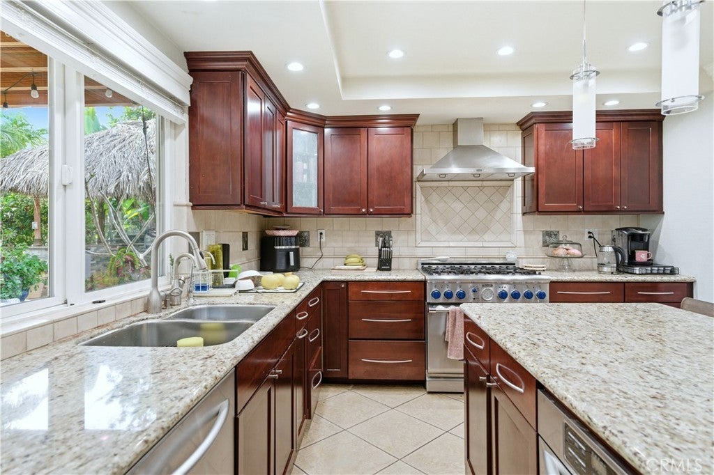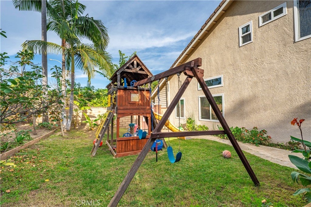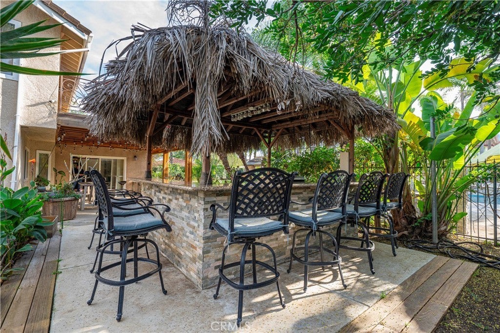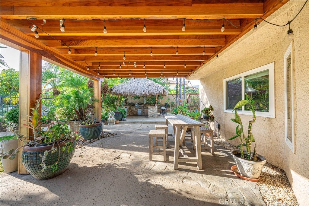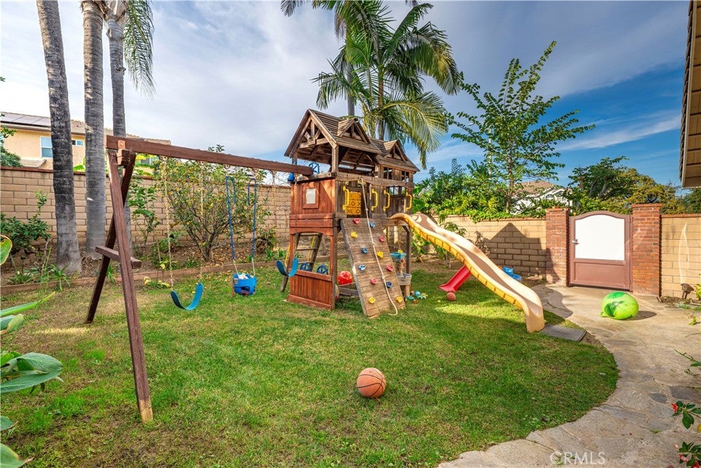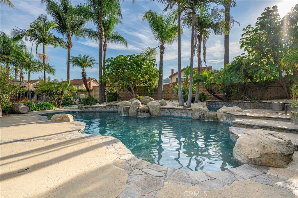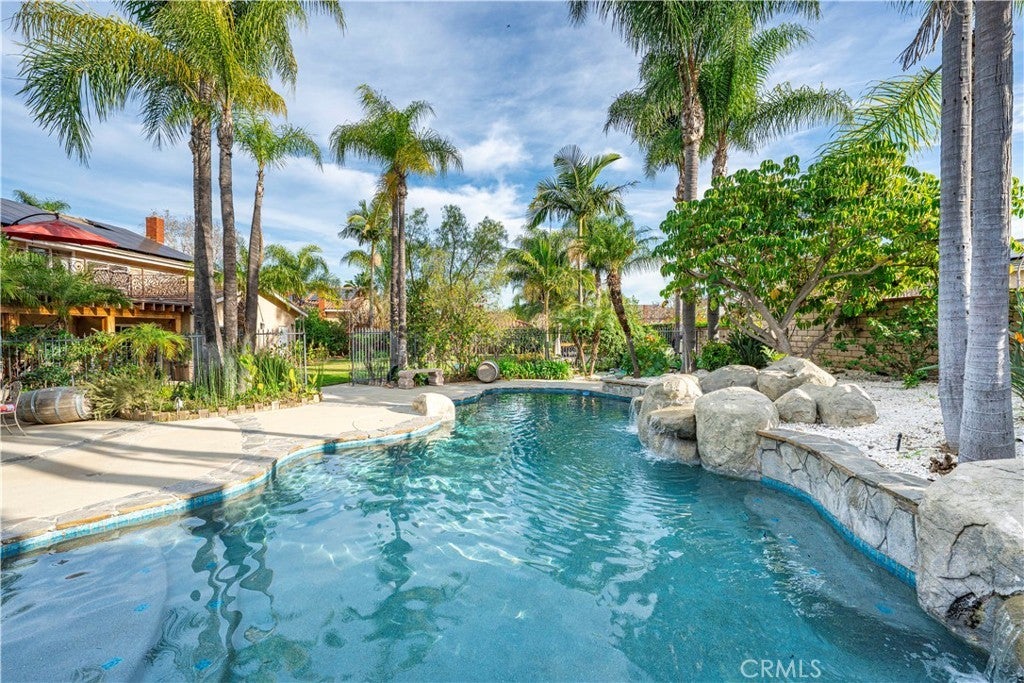 Welcome to this exceptional corner-lot residence located in a peaceful, well-established neighborhood, where space, comfort, and versatility come together seamlessly. From the moment you arrive, the home showcases impressive curb appeal with its prominent corner-lot presence, manicured landscaping, and classic tile roof that enhances both durability and architectural character. The expansive driveway offers room for RV and boat parking, while the three-car garage provides ample space for vehicles and storage, with additional frontage offering extra parking convenience. The impressive two-story layout spans approximately 3,487 square feet and features 5 bedrooms and 5 bathrooms, thoughtfully designed to balance functionality with refined style. Upon entry, soaring two-story ceilings and an open floor plan create a bright, expansive atmosphere ideal for entertaining and comfortable living. At the heart of the home, the spacious family room features a built-in bar and flows seamlessly into the den and open gourmet kitchen, creating a natural gathering space. The kitchen offers granite countertops and a commercial-grade refrigerator ideal for hosting. A wet bar and adjacent game area further enhance the entertainment appeal. Set on a generous lot, the backyard serves as a private retreat. Enjoy a resort-style pool and spa with waterfall feature, complemented by a covered patio with built-in BBQ and decorative palm-style covering that adds a tropical touch. An oversized rear patio area and an additional patio off the family room provide multiple areas for indoor-outdoor enjoyment. Mature tropical landscaping and an array of fruit trees, including mango, lemon, lime, pomegranate, avocado, and persimmon, add beauty and character to the outdoor setting. Upstairs, the primary suite includes a spacious balcony overlooking the backyard, offering a peaceful space to relax and enjoy the views. The downstairs fifth bedroom includes an en-suite bathroom and flexible layout options. A portion of the three-car garage has been incorporated into this area, providing additional functional space. Buyers to verify all features, permits, and potential uses. Additional highlights include surround sound in the bonus room and solar panels for energy efficiency (buyer to verify system details). Conveniently located near schools, parks, shopping, dining, and major transportation routes, this home offers a rare combination of size, amenities, flexibility, and outdoor living.