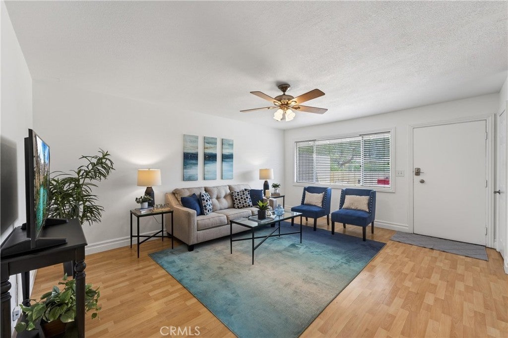 Welcome to paradise at Coco Palms! Located in the heart of Fullerton, this beautifully maintained single-level condo offers an open and airy floor plan with 933 square feet of living space, featuring 2 bedrooms and 2 bathrooms designed for comfort and ease. Step inside to find laminate and tile flooring throughout, creating a clean, modern feel. The primary suite is a relaxing retreat with crown molding, ceiling fan, laminate floors, window blinds, and a custom built-in closet system. The primary bathroom is finished with tile flooring, Corian countertops, newer fixtures, and a tiled walk-in shower. The second bedroom also features crown molding, ceiling fan, laminate flooring, window blinds, and a built-in closet system—perfect for guests, a home office, or shared living. Bathroom two includes tile flooring, a tub/shower combo, tile countertops, over-mount sink, newer fixtures, and classic wainscoting. The family room is bright and inviting with laminate flooring, ceiling fan, and natural light flowing in through large windows. The kitchen is thoughtfully updated with stainless steel appliances, Formica countertops, tile backsplash, stainless steel sink, track lighting, and window blinds—ideal for everyday living and entertaining. Enjoy your semi-private front patio, offering great natural sunlight and a peaceful place to relax.. The Coco Palms community features a gated pool and spa, expansive greenbelt areas, community laundry facilities, and assigned one-car carport parking with a lockable storage bin. Ideally located near the vibrant restaurants, shops, and entertainment of Downtown Fullerton, this home combines comfort, convenience, and community living at its best.
