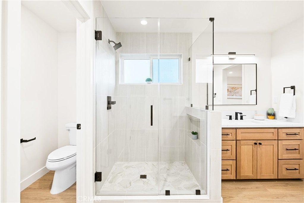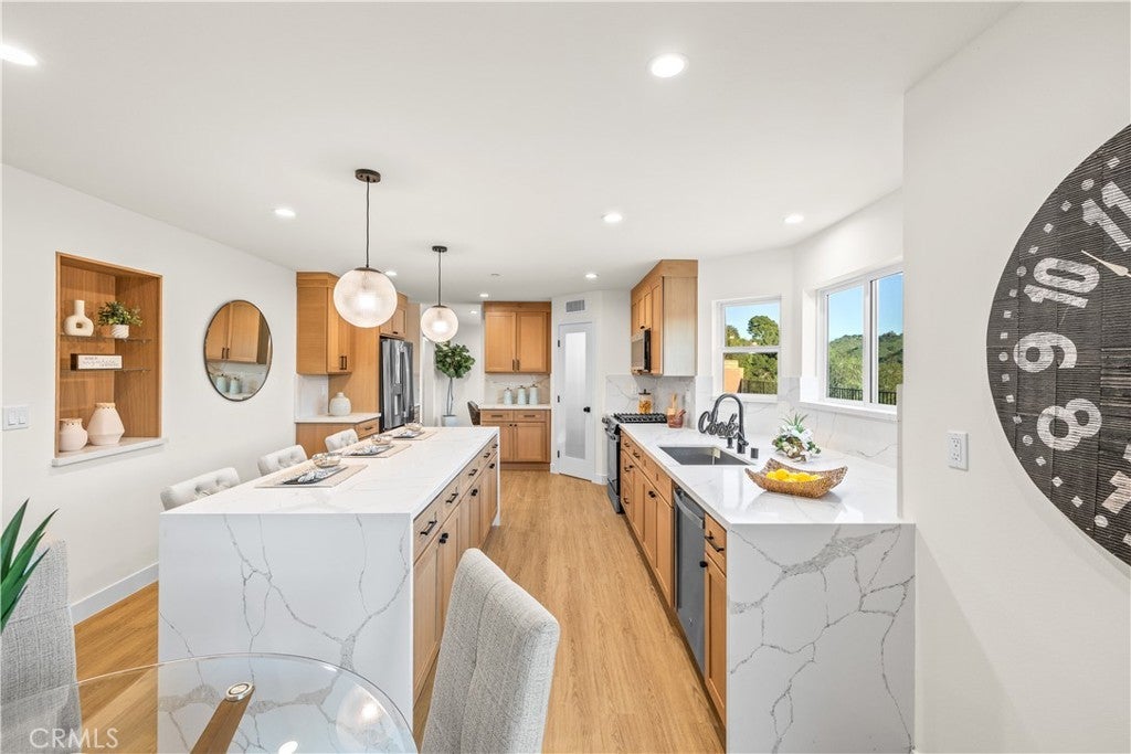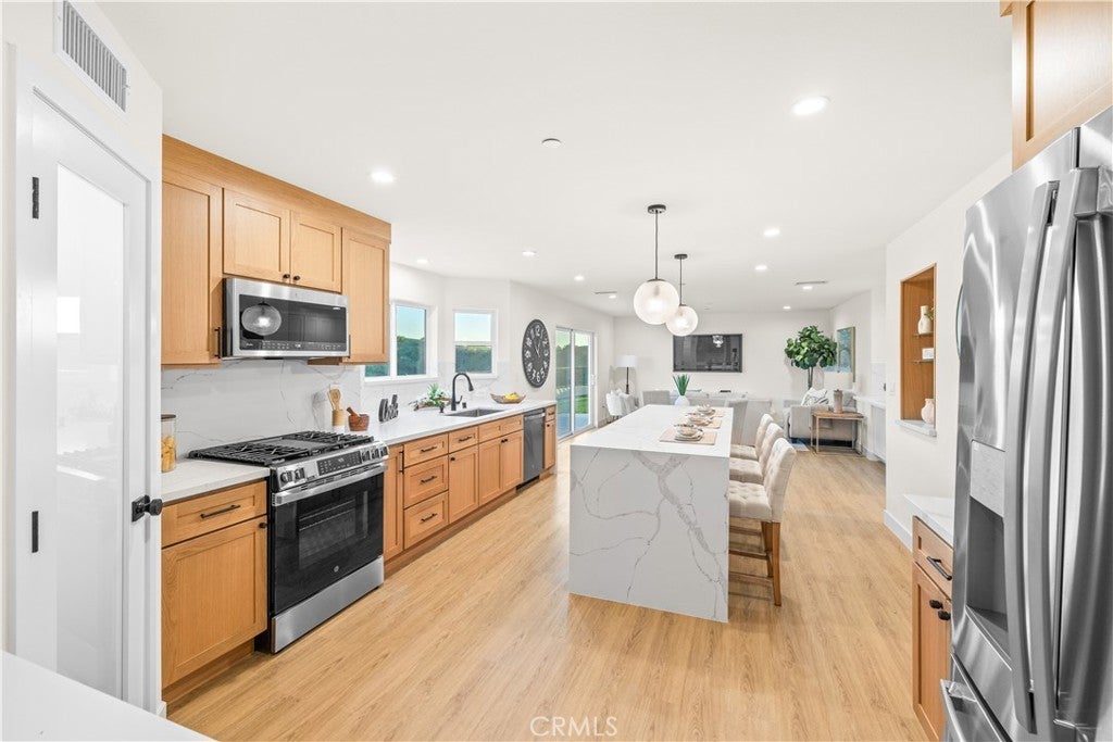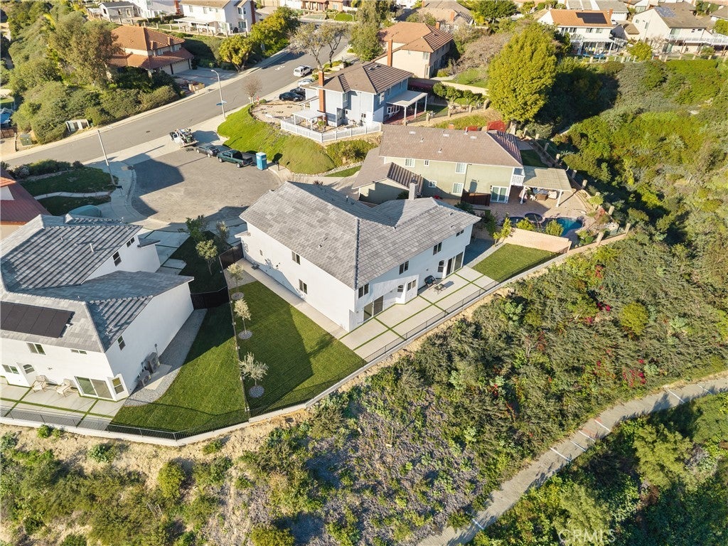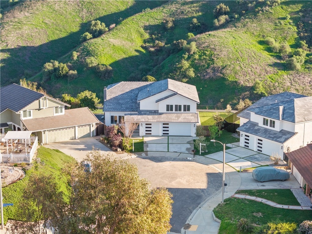 Welcome to 4810 Cinco View Dr, Whittier, a stunning new construction two-story home offering 5 bedrooms and 4 bathrooms, perfectly situated on a quiet cul-de-sac in Whittier Hills. This elevated property delivers privacy, modern design, and panoramic mountain, and canyon views. The bright entry opens to a formal living room with a dramatic statement fireplace and abundant natural light. The chef’s kitchen features custom cabinetry, quartz countertops, stainless steel appliances, and a large waterfall island, flowing seamlessly into the dining and family rooms—ideal for everyday living and entertaining. The formal dining room is framed by oversized windows capturing scenic views, while the family room opens to the outdoors and includes a stylish wet bar with custom cabinetry and prep sink. A downstairs bedroom and bathroom with a modern vanity and glass-enclosed walk-in shower adds convenience for guests or multigenerational living. Upstairs, the primary suite offers a spacious retreat with hillside views, a spa-inspired ensuite bathroom with dual vanities, walk-in shower, and a walk-in closet located within the bathroom. A second primary bedroom with its own ensuite provides flexibility for guests or extended family. Additional bedrooms are generously sized. A large upstairs laundry room features quartz counters, custom cabinetry, and a utility sink. The backyard backs to open hillside, offering exceptional privacy, peaceful surroundings, and breathtaking sunsets. Additional highlights include a convenient custom mudroom, a three-car garage, central AC, and close proximity to parks, hiking trails, shopping, dining, and freeway access. A rare opportunity to own a new construction home with views in one of Whittier’s most desirable hillside neighborhoods, the Spy Glass Estates. Schedule your private showing today!