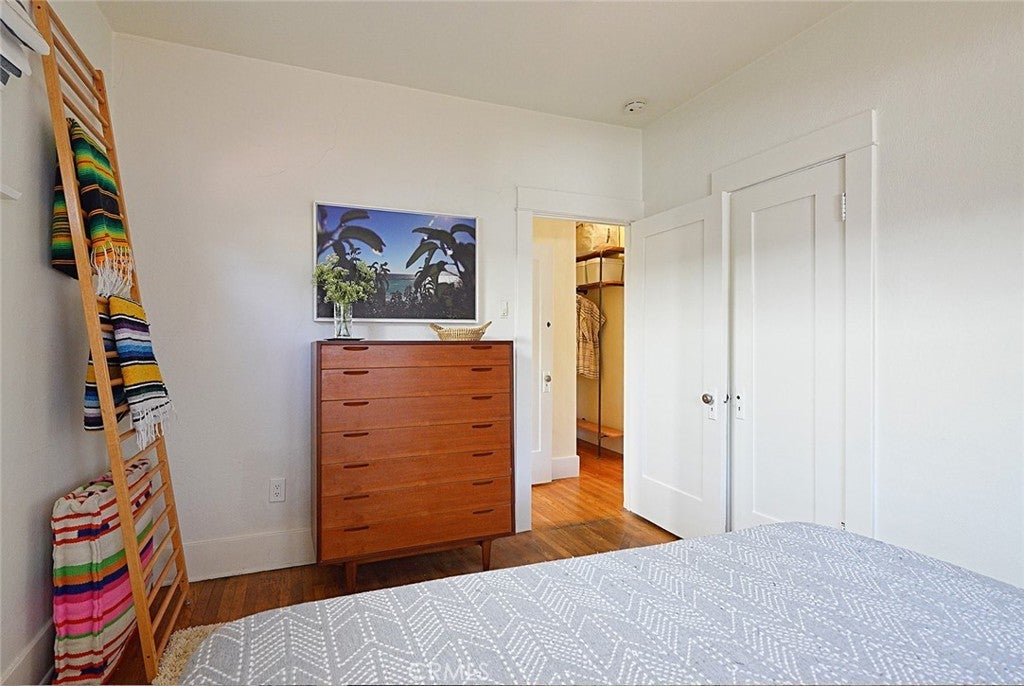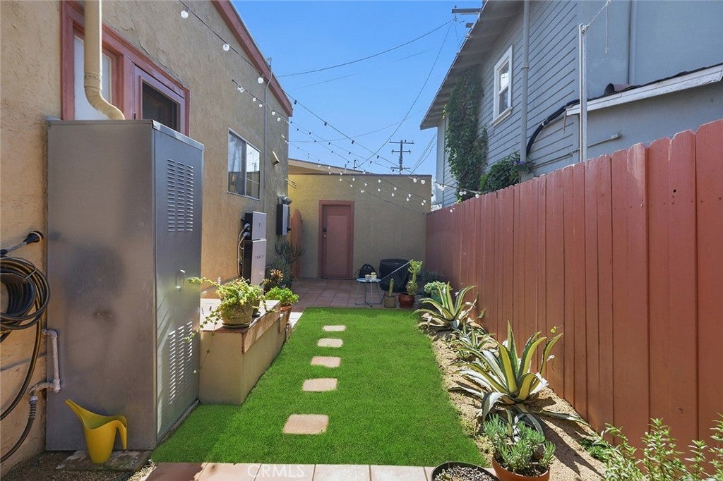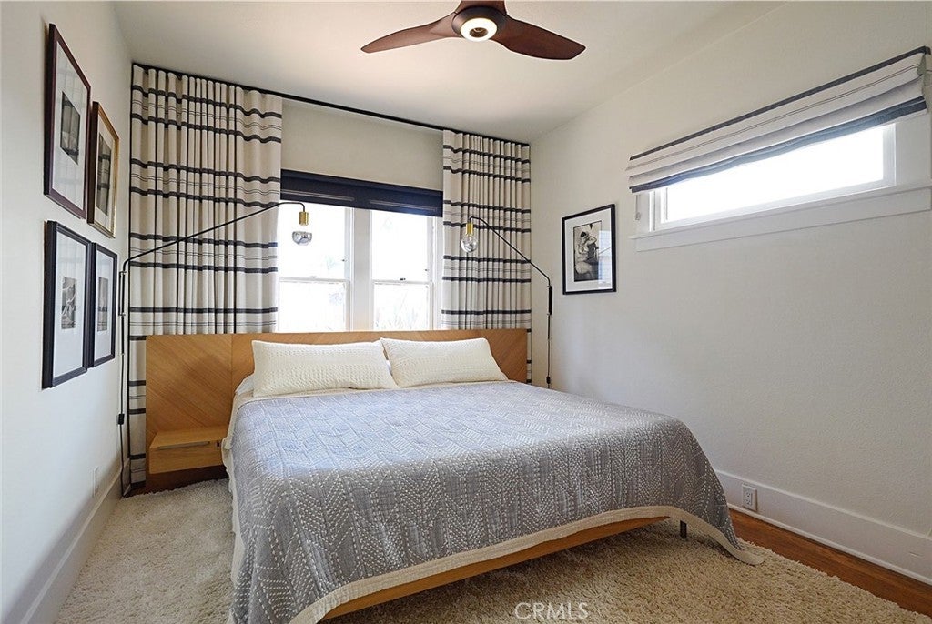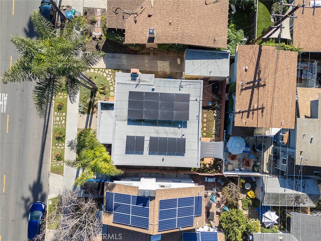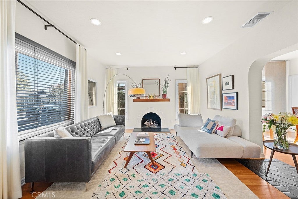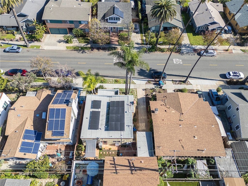 A rare blend of historic charm and modern sustainability, this Spanish Revival bungalow is located in the heart of Historic Bluff Heights, just blocks from the beach. Offering approximately 1,100 square feet, this 2-bedroom, 1-bath home is filled with natural light and timeless character. Original hardwood floors, graceful archways, custom window treatments, a classic fireplace, and abundant double-hung windows reflect the home’s period appeal, while a thoughtful layout supports modern living. The inviting living room flows seamlessly into the dining area and updated kitchen, creating an ideal space for everyday living and entertaining. The kitchen features white shaker-style cabinetry, stone countertops, classic tile accents, stainless steel appliances, generous storage, and ample prep space. The bathroom retains beautiful original black-and-white tile with tasteful updates, including a pedestal sink and separate tub and shower. Modern enhancements include a fully paid Tesla solar system with Tesla home battery, electric vehicle charging setup, high-efficiency HVAC with new ducting, whole-house steam humidifier, advanced air filtration system, upgraded electrical panel, copper water main, recessed LED lighting, and a full roof replacement. Outdoor areas offer multiple tiled seating spaces, native landscaping, and room for dining, relaxing, or gardening. A carriage-style garage provides flexible use as a studio, workshop, storage, or parking for a small vehicle, complemented by a long private driveway with ample off-street parking. Ideally situated near beaches, Retro Row, the Broadway Corridor, East Village Arts District, dining, shopping, bike paths, and coastal amenities, this home offers an exceptional Long Beach lifestyle.