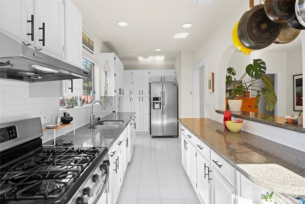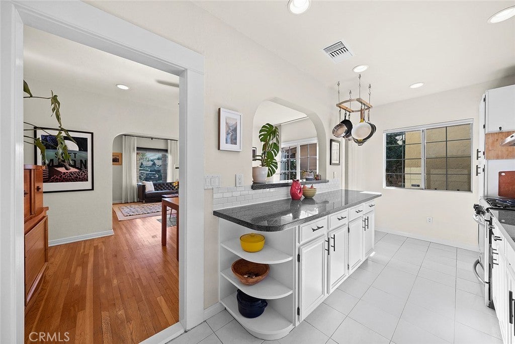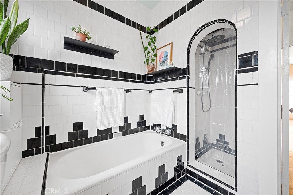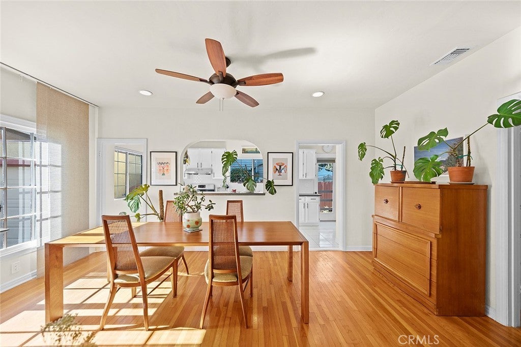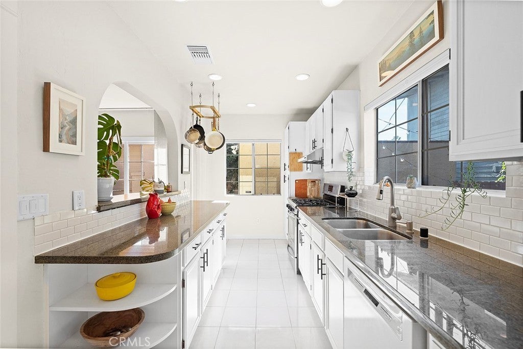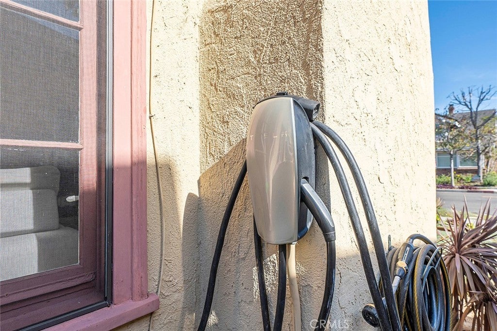 A rare blend of historic charm and modern sustainability, this Spanish Revival bungalow is located in the heart of Historic Bluff Heights, just blocks from the beach. Offering approximately 1,100 square feet, this 2-bedroom, 1-bath home is filled with natural light and timeless character. Original hardwood floors, graceful archways, custom window treatments, a classic fireplace, and abundant double-hung windows reflect the home’s period appeal, while a thoughtful layout supports modern living. The inviting living room flows seamlessly into the dining area and updated kitchen, creating an ideal space for everyday living and entertaining. The kitchen features white shaker-style cabinetry, stone countertops, classic tile accents, stainless steel appliances, generous storage, and ample prep space. The bathroom retains beautiful original black-and-white tile with tasteful updates, including a pedestal sink and separate tub and shower. Modern enhancements include a fully paid Tesla solar system with Tesla home battery, electric vehicle charging setup, high-efficiency HVAC with new ducting, whole-house steam humidifier, advanced air filtration system, upgraded electrical panel, copper water main, recessed LED lighting, and a full roof replacement. Outdoor areas offer multiple tiled seating spaces, native landscaping, and room for dining, relaxing, or gardening. A carriage-style garage provides flexible use as a studio, workshop, storage, or parking for a small vehicle, complemented by a long private driveway with ample off-street parking. Ideally situated near beaches, Retro Row, the Broadway Corridor, East Village Arts District, dining, shopping, bike paths, and coastal amenities, this home offers an exceptional Long Beach lifestyle.