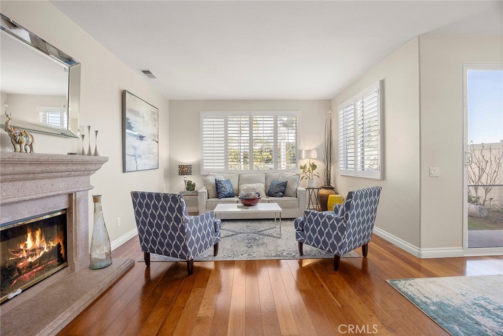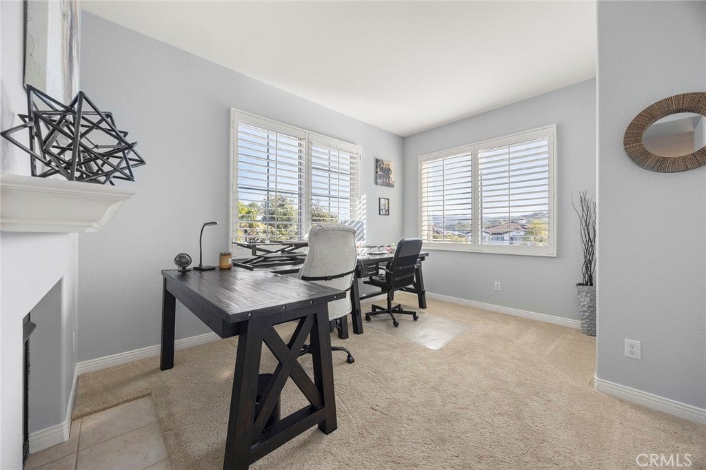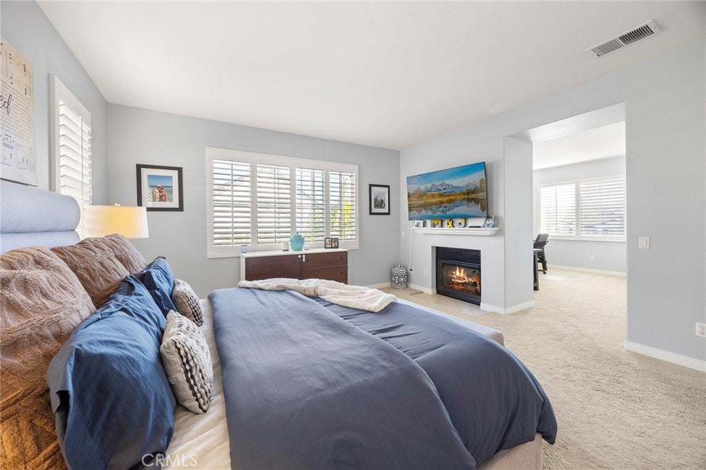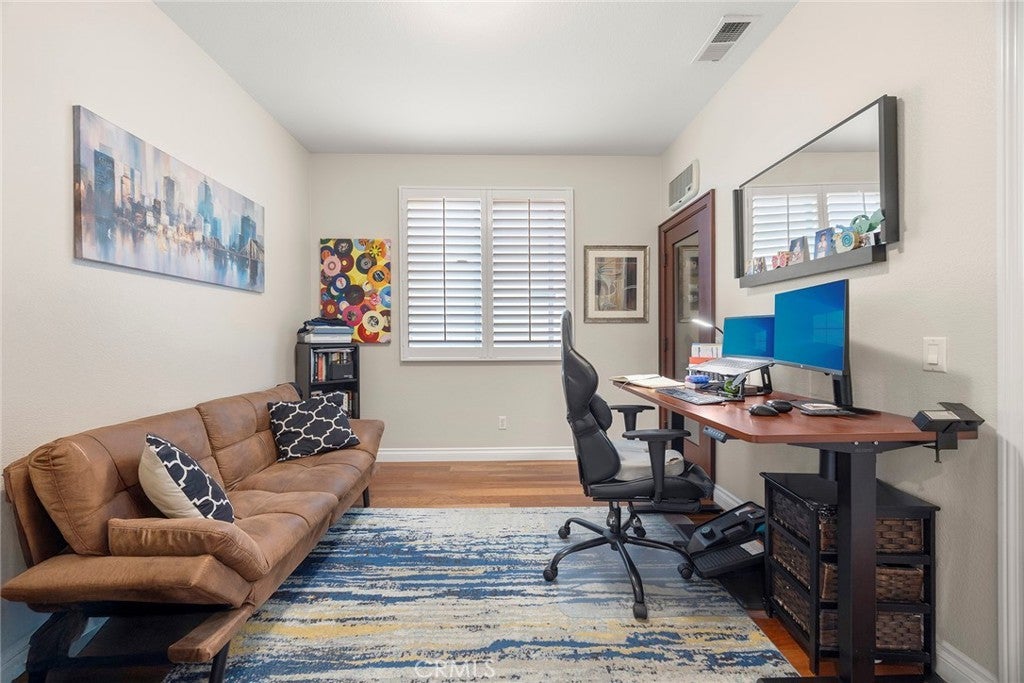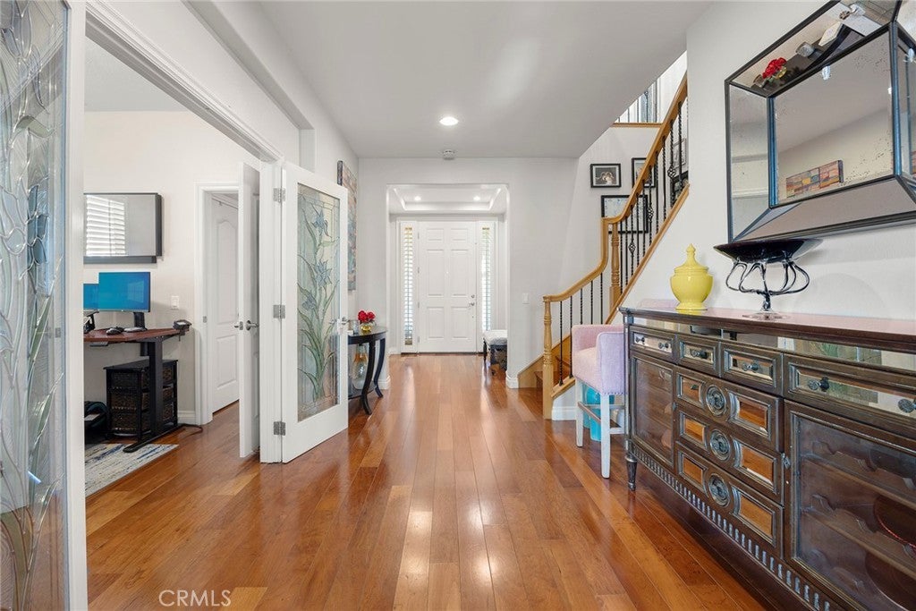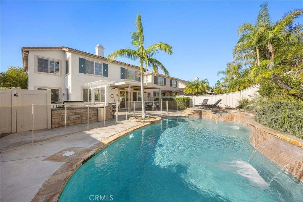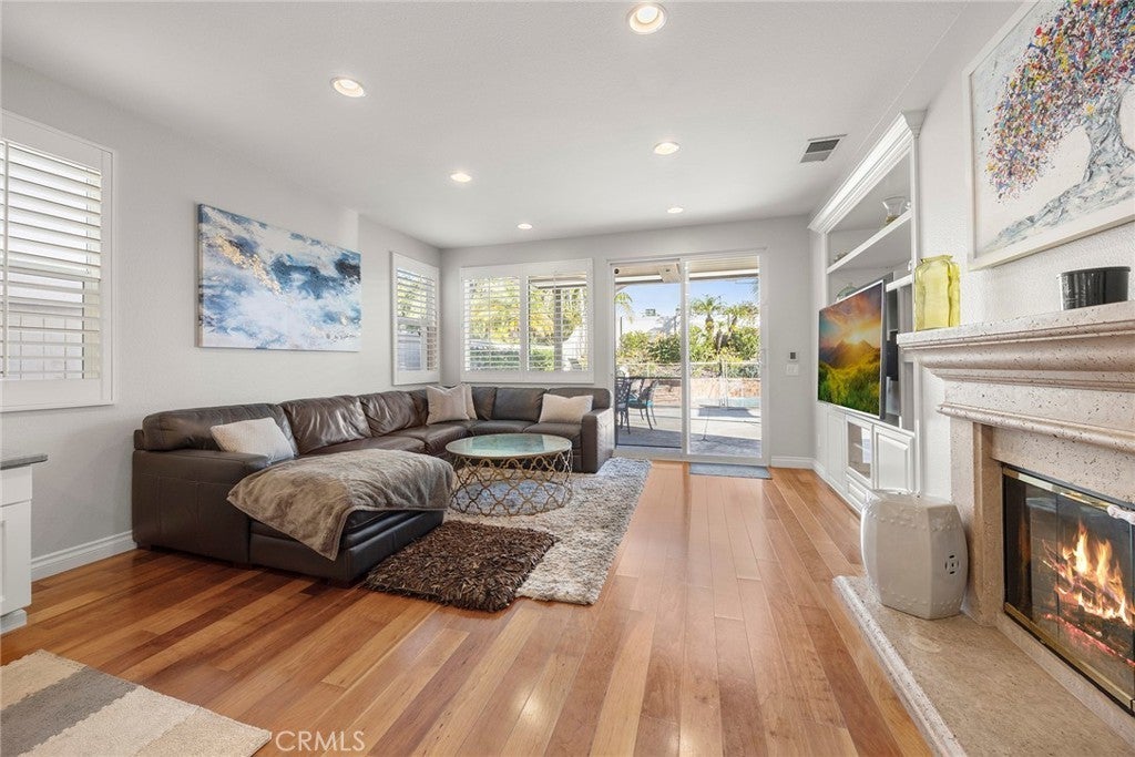This pristine executive home is now available for lease and presents a striking first impression, with attractive neutral wall tones, smart plantation shutters, and handsome hardwood flooring. Step into the inviting entry that opens to elegant formal living and dining rooms, highlighted by a warming fireplace, ideal for entertaining or quiet evenings at home. The oversized kitchen is both stylish and highly functional, featuring abundant storage in crisp white cabinetry, sleek countertops, a dining counter, and premium stainless appliances including a multi-burner range with hood, built-in refrigerator, double ovens, and the walk-in pantry is a real plus. A built-in meal-planning desk sits conveniently adjacent to the family room, which offers its own cozy fireplace and an easy flow for everyday living. A private executive office on the first level is enclosed by attractive glass French doors, plus a desirable downstairs bedroom and private bath completes the main level. Upstairs, the expansive primary suite is a true retreat, complete with a separate sitting area that shares a dramatic see-through fireplace. You will luxuriate in the spa-inspired primary bath with soaking tub, separate shower, and dual vanities, plus a large oversized walk-in closet. Three additional bedrooms, and a convenient upstairs laundry area completes the upper level, allowing plenty of room for residents to enjoy comfort, and convenience for everyone. The private backyard is designed for relaxation and entertaining, featuring an adjustable patio cover, so you can enjoy your sunny or shady moments outdoors, built-in BBQ center, small grassy yard, and a sparkling pool and spa (including safety fencing to protect the little ones). This Serrano Heights property attends the finest schools, and is near shopping, restaurants and so much more. Your own private oasis for year-round enjoyment awaits.